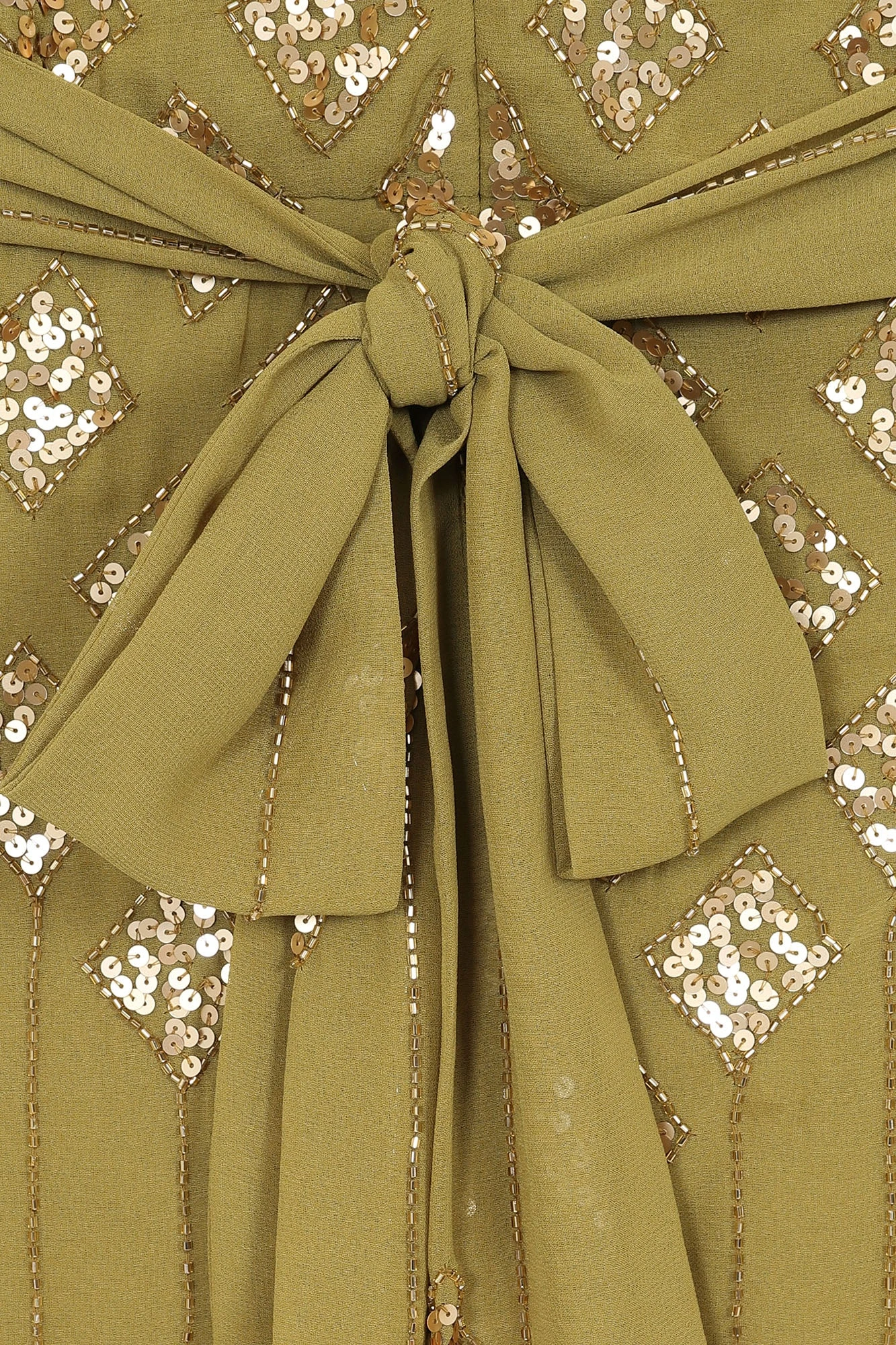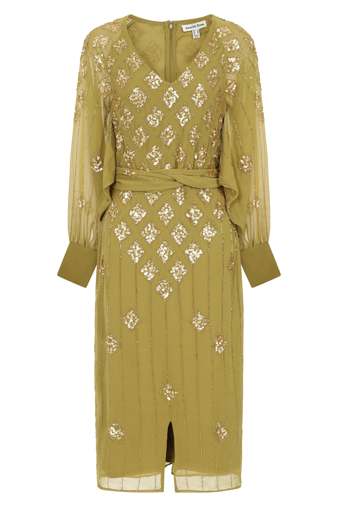 Realised in a new-season-ready willow green, this chic midi dress boasts gold sequin embellishment, configured in a geometric diamond motif. The perfect choice for changeable autumn weather, Laurie features a full length lining and long, batwing style sleeves. This pencil style midi is complete with a self-tie belt to highlight the waist.