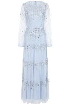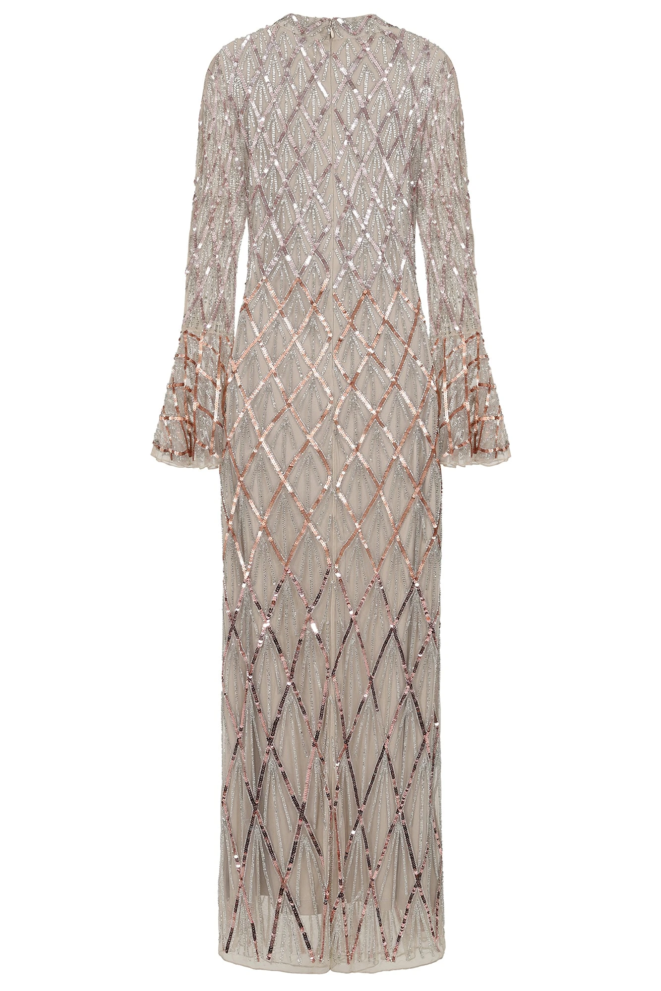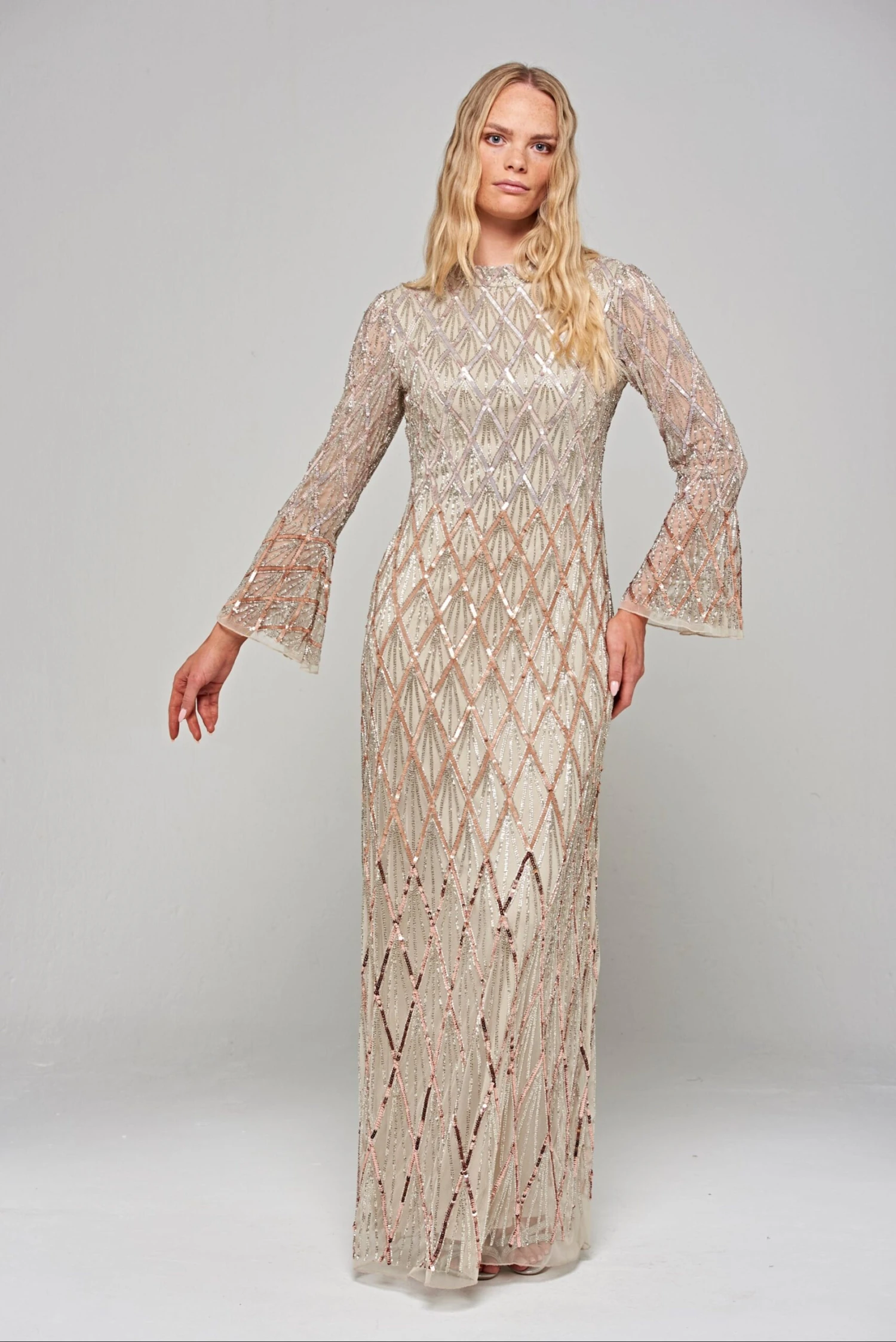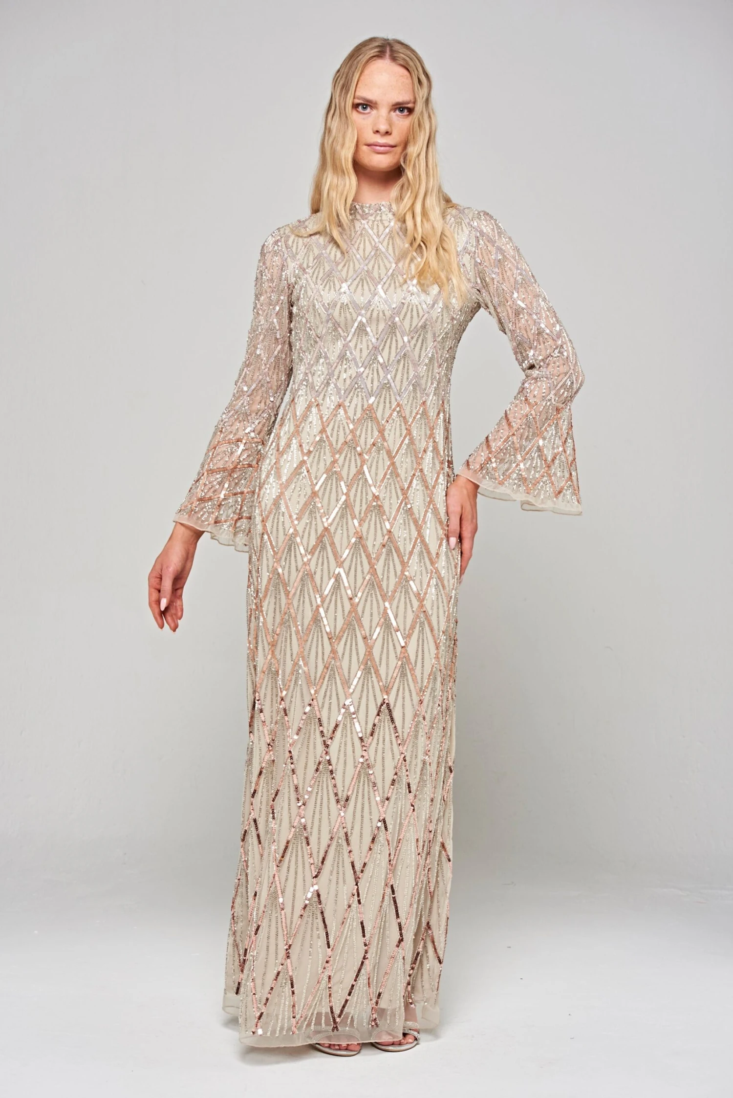 Shimmering with all over sequin embellishment, arranged in a graphic motif and realised in an ombre design that flows from a lilac-tinged silver to a deep copper, the neutral hued Lillian is all about effortless glamour. Cut in a modest silhouette, this floor skimming maxi is complete with a high neckline and gently flaring sleeves. Pick out your favourite metallic shade and style Lillian with minimal jewellery and barely there heels.
