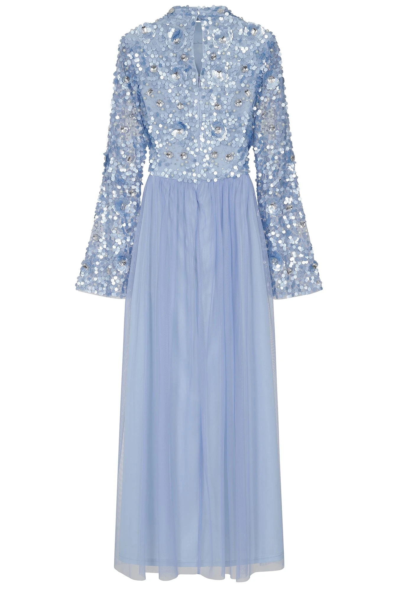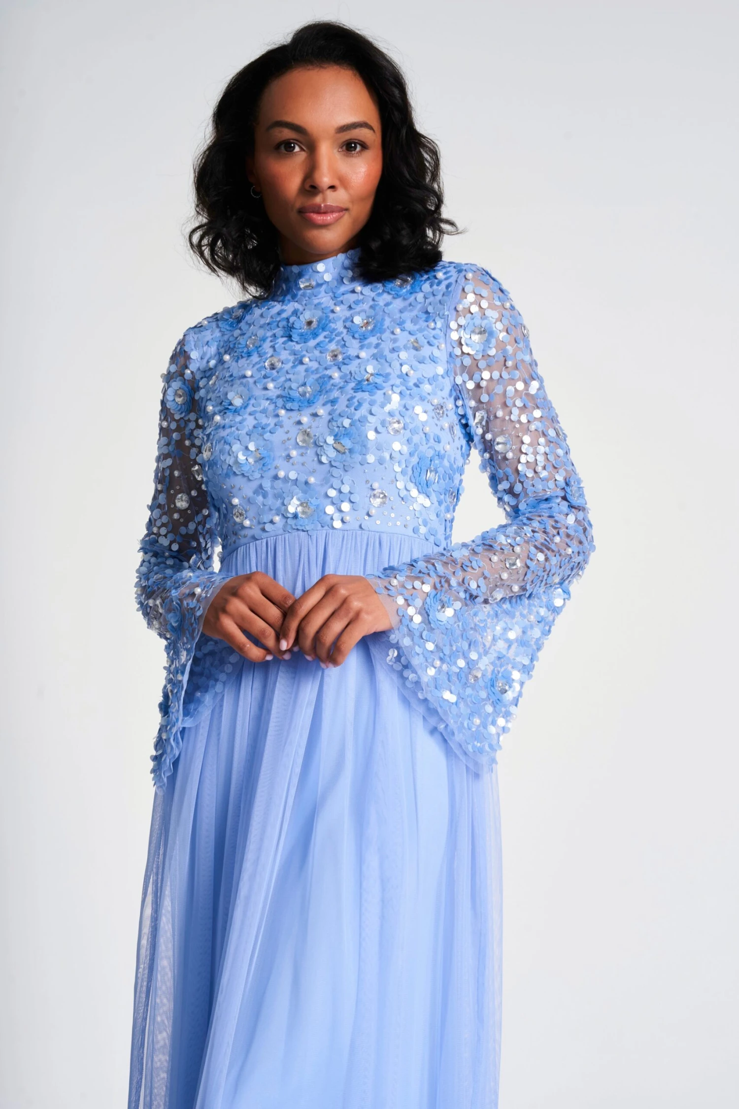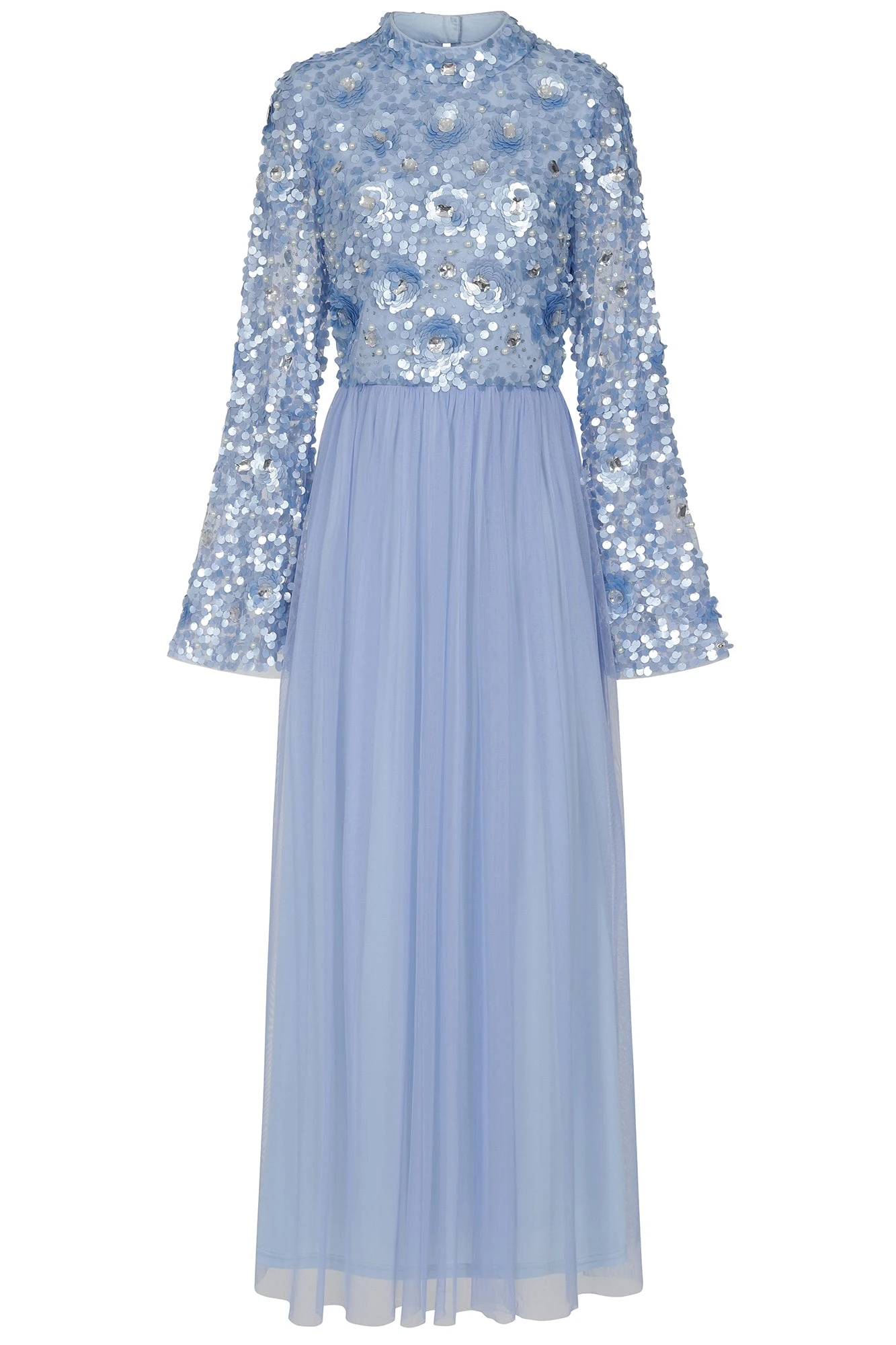 Sparkle your way into spring with Lillie. Cut in a minimal silhouette, this powder blue gown boasts a bodice brimming with sequin, pearl and diamante embellishment, depicting a tonal floral motif. Lillie is complete with sheer trumpet style sleeves and a flowing full length tulle skirt.