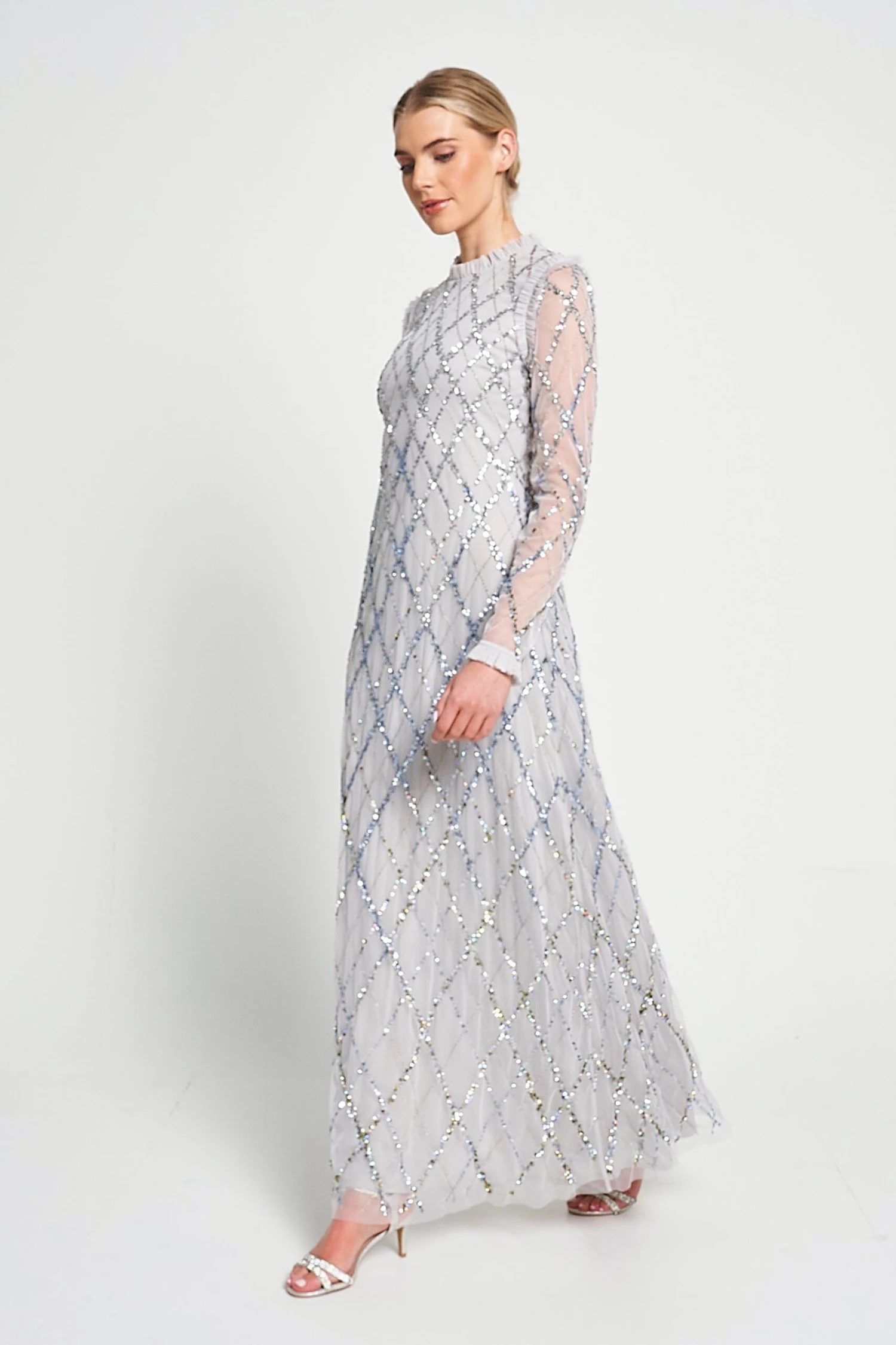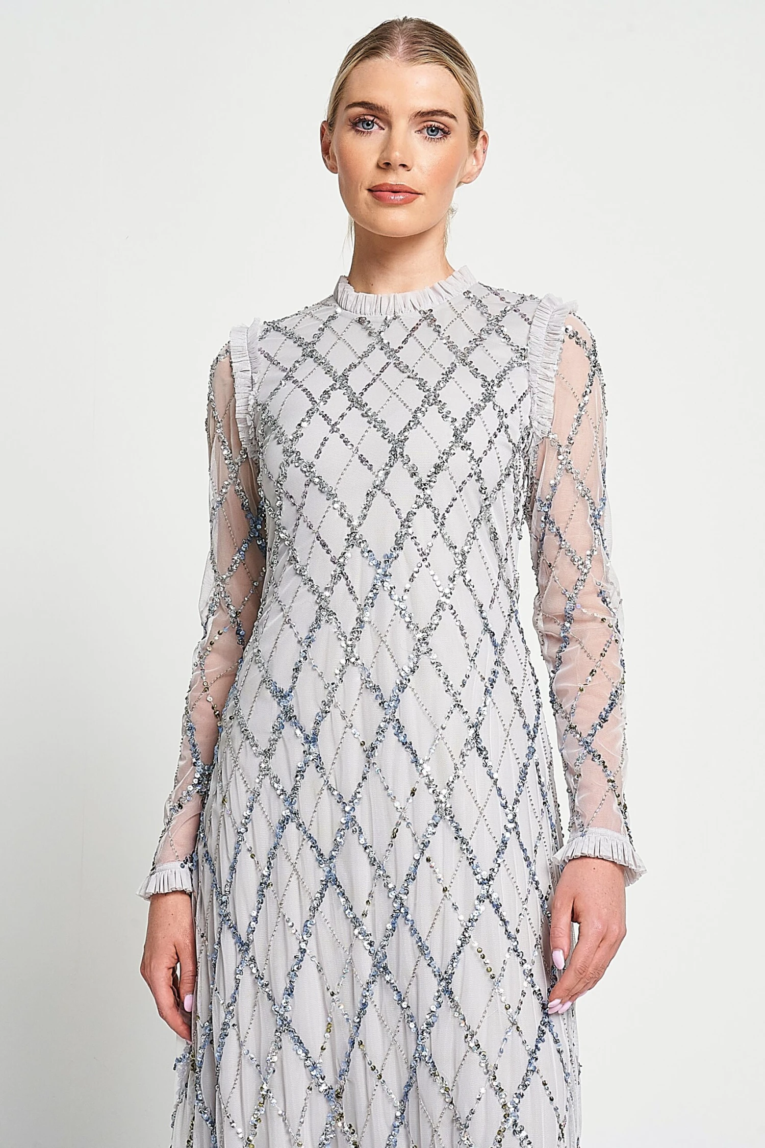 Embody ethereal elegance with Lise. Minimal in silhouette, this pale grey maxi dress is crisscrossed with shimmering sequin detailing. Designed with a high neckline and full length sleeves, Lise is complete with delicate ruffled trim.