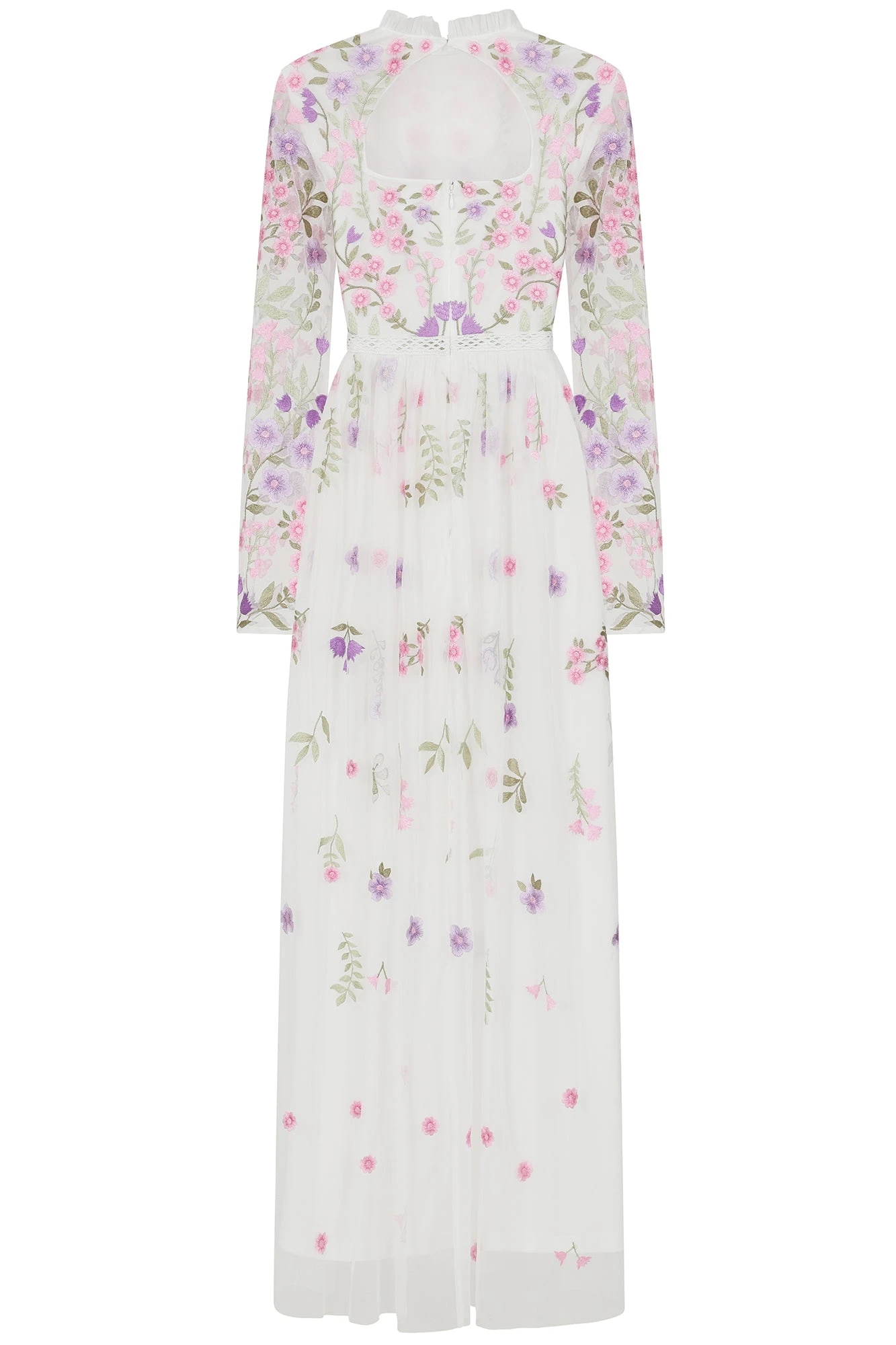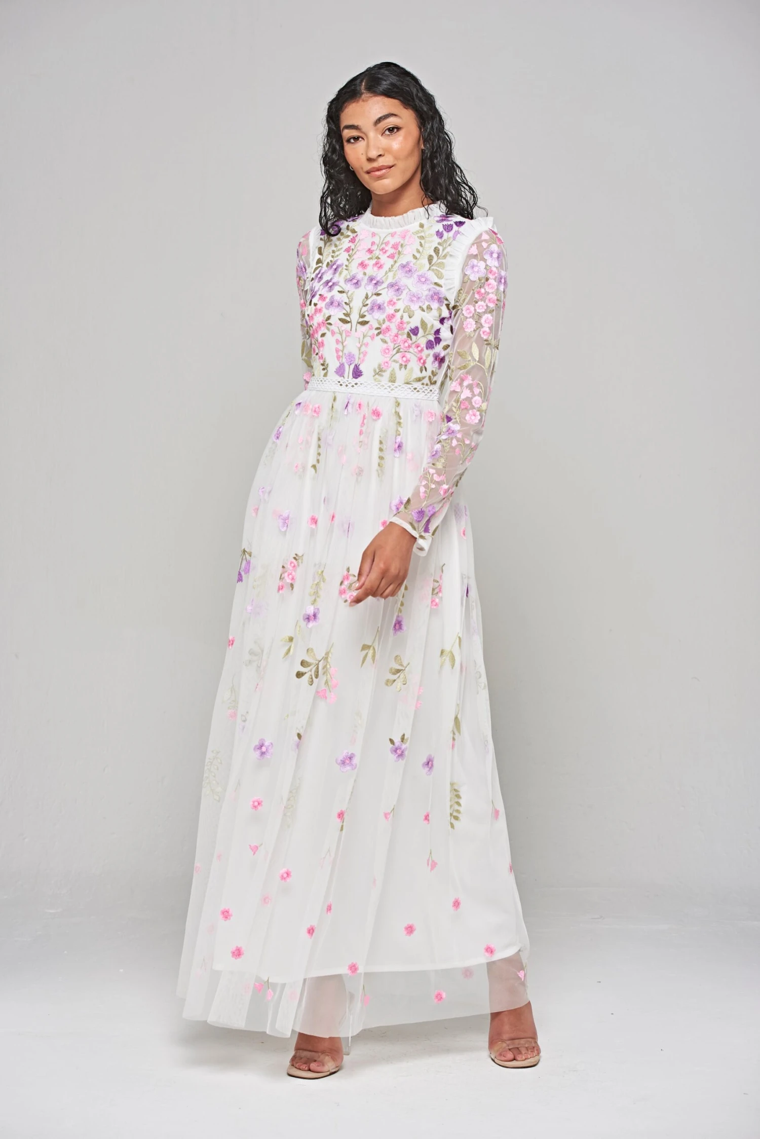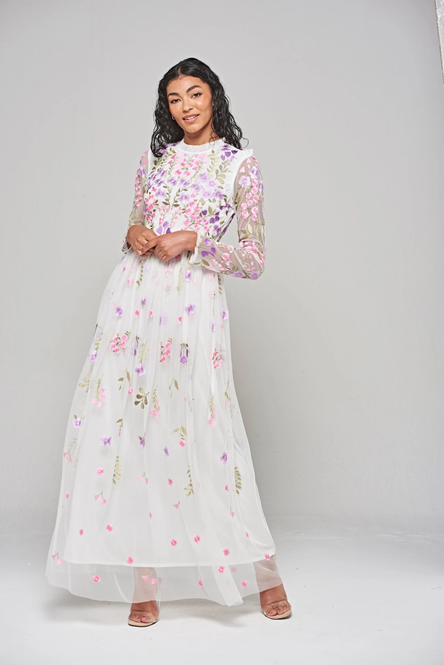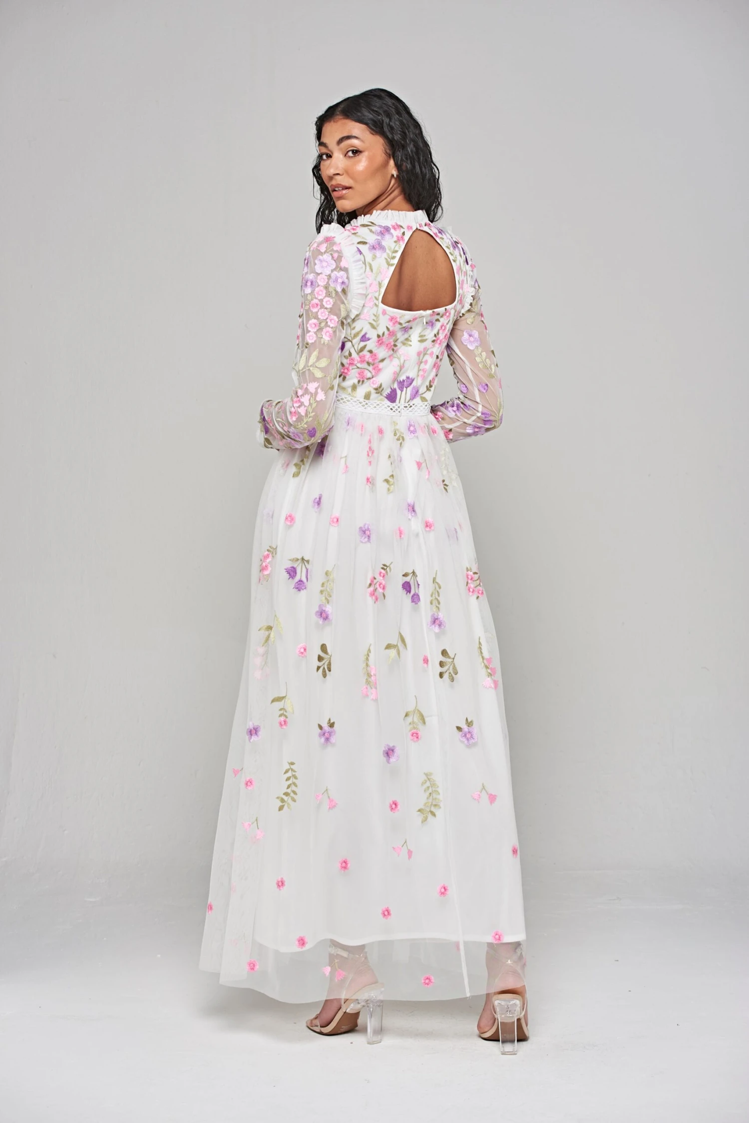 Boasting a meadows worth of flowers, this long sleeved maxi dress will bring a touch of joy to any special occasion this spring! Realised in classic white, Lorea is complete with ruffled trim and a cut out back.
