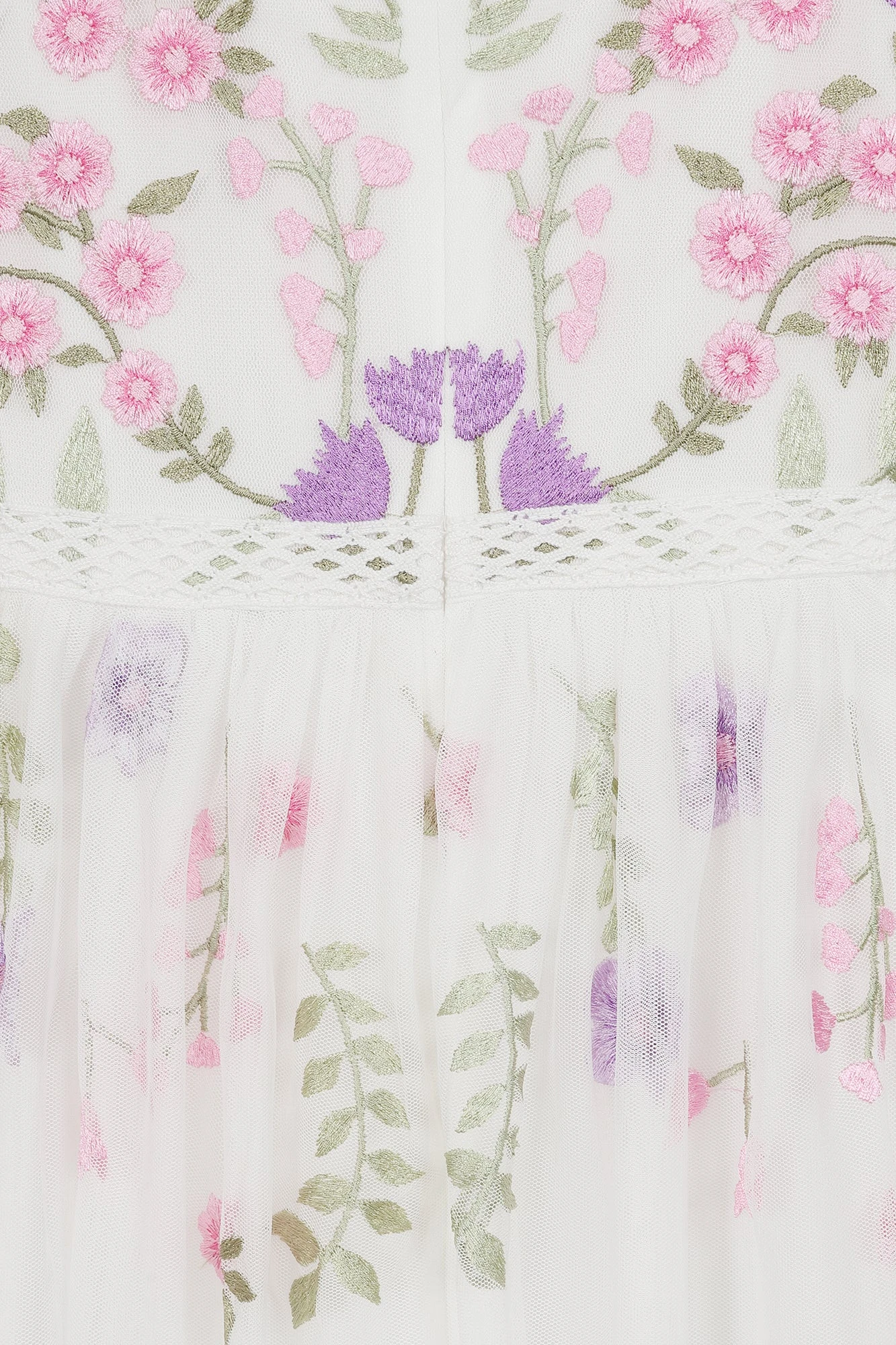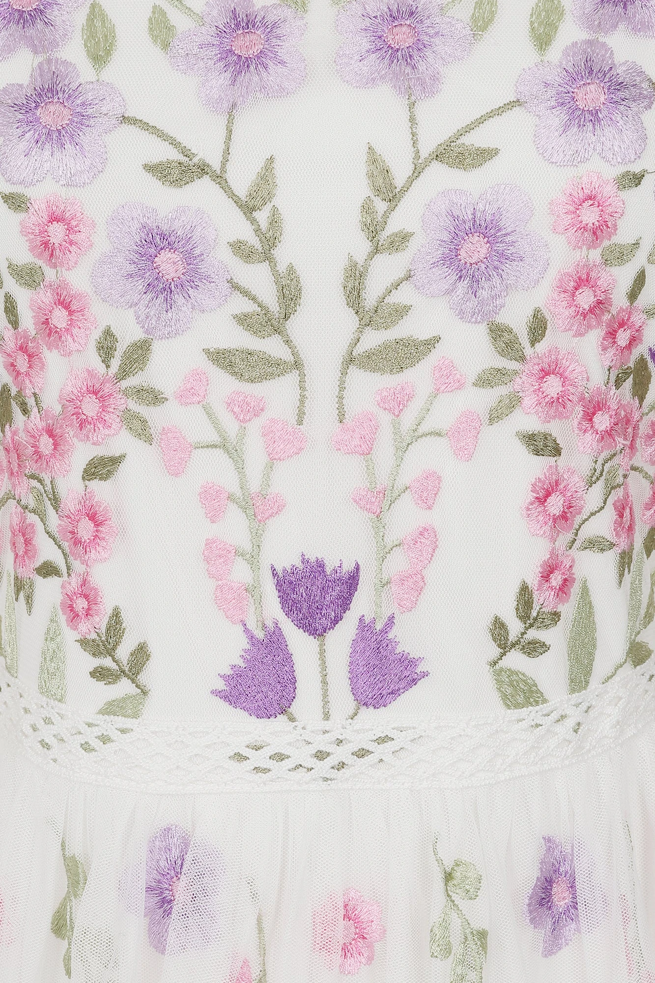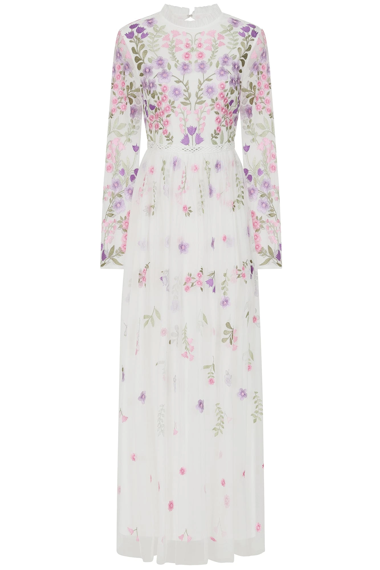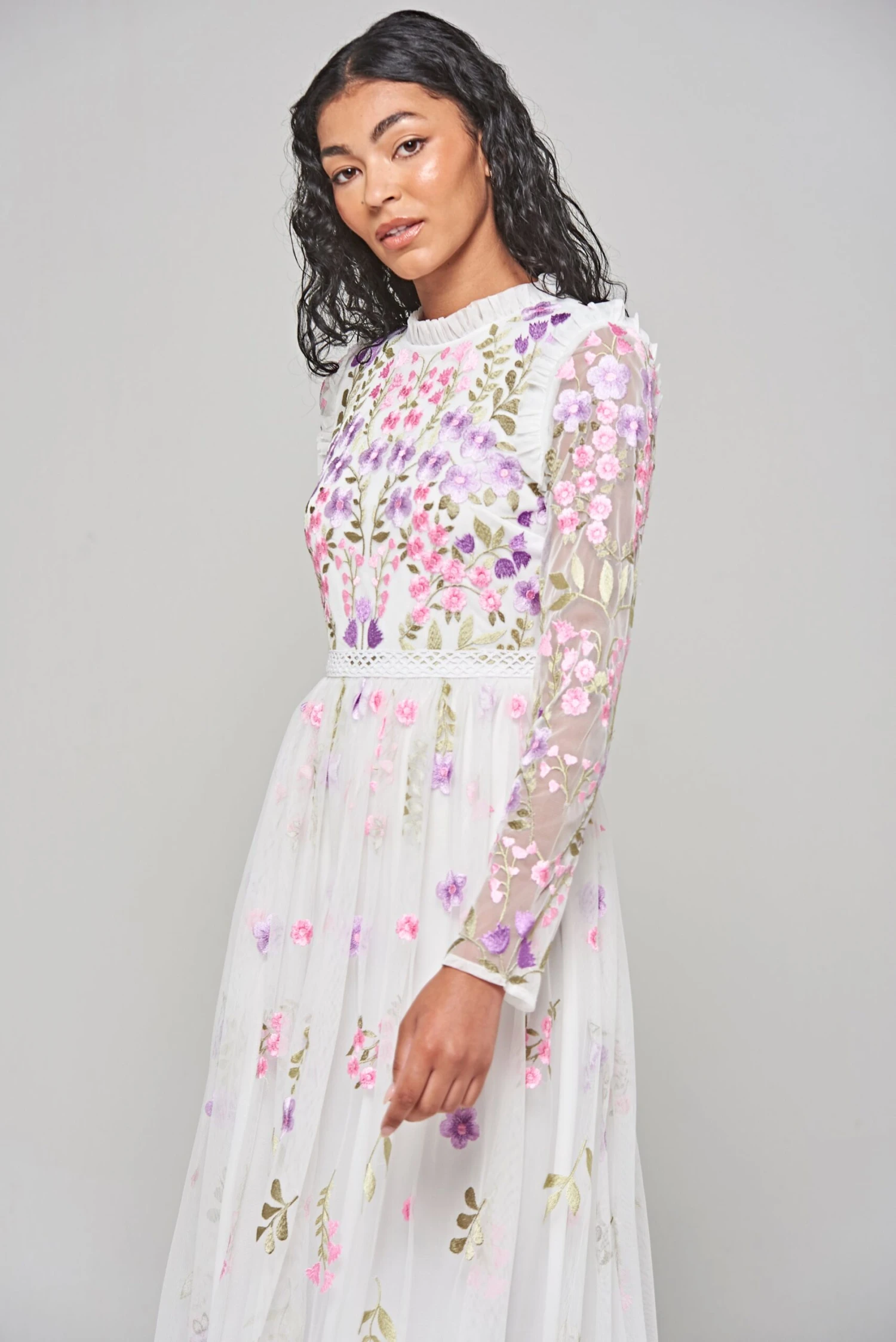 Boasting a meadows worth of flowers, this long sleeved maxi dress will bring a touch of joy to any special occasion this spring! Realised in classic white, Lorea is complete with ruffled trim and a cut out back.