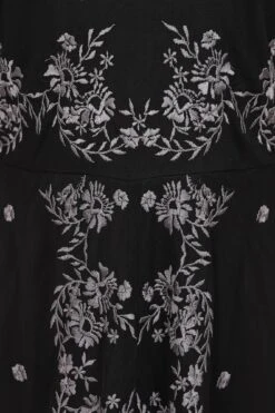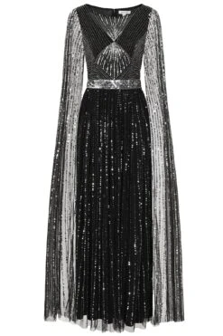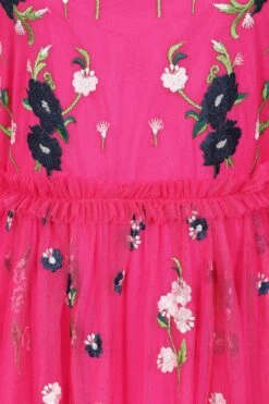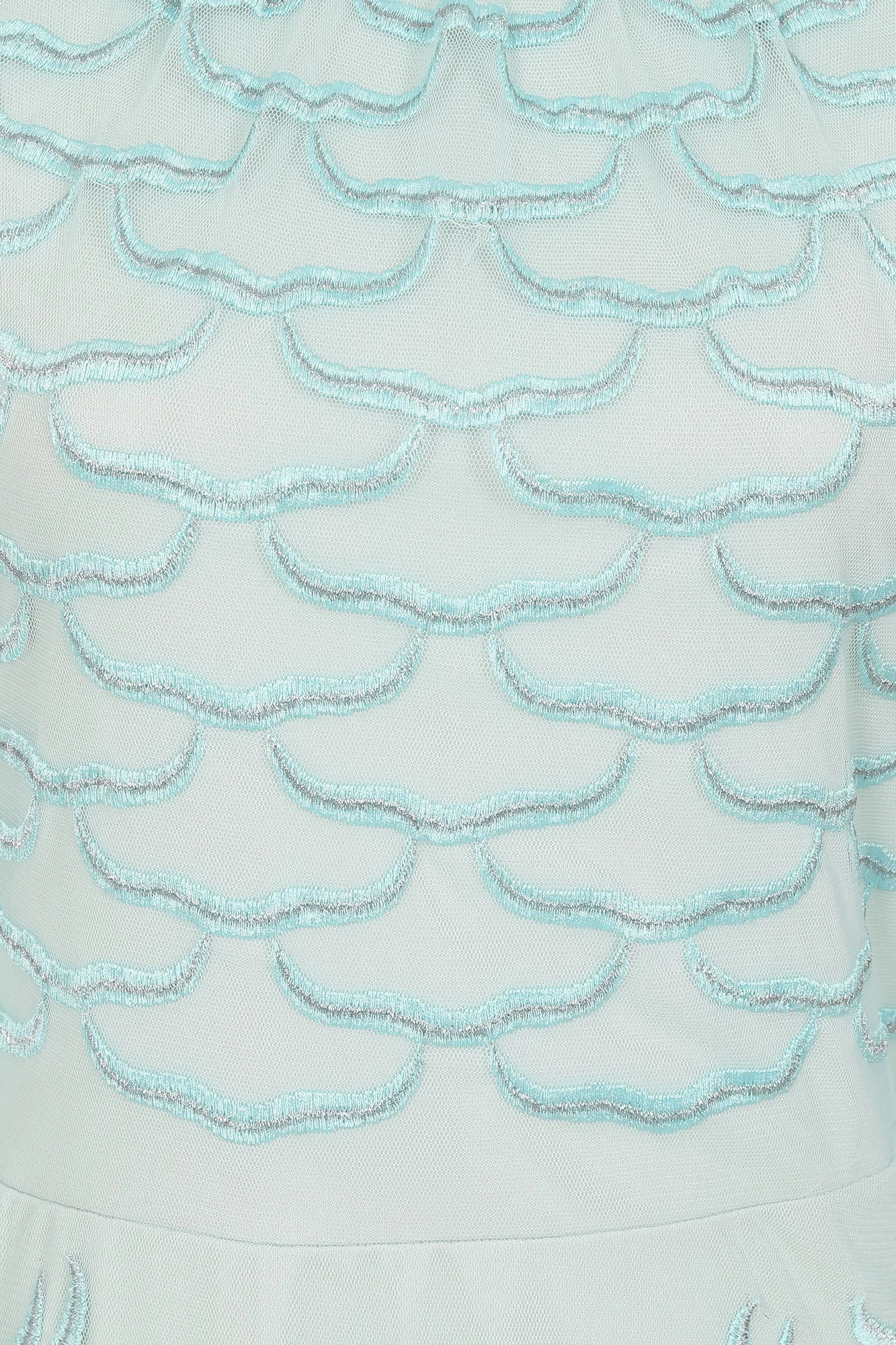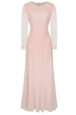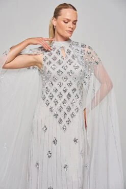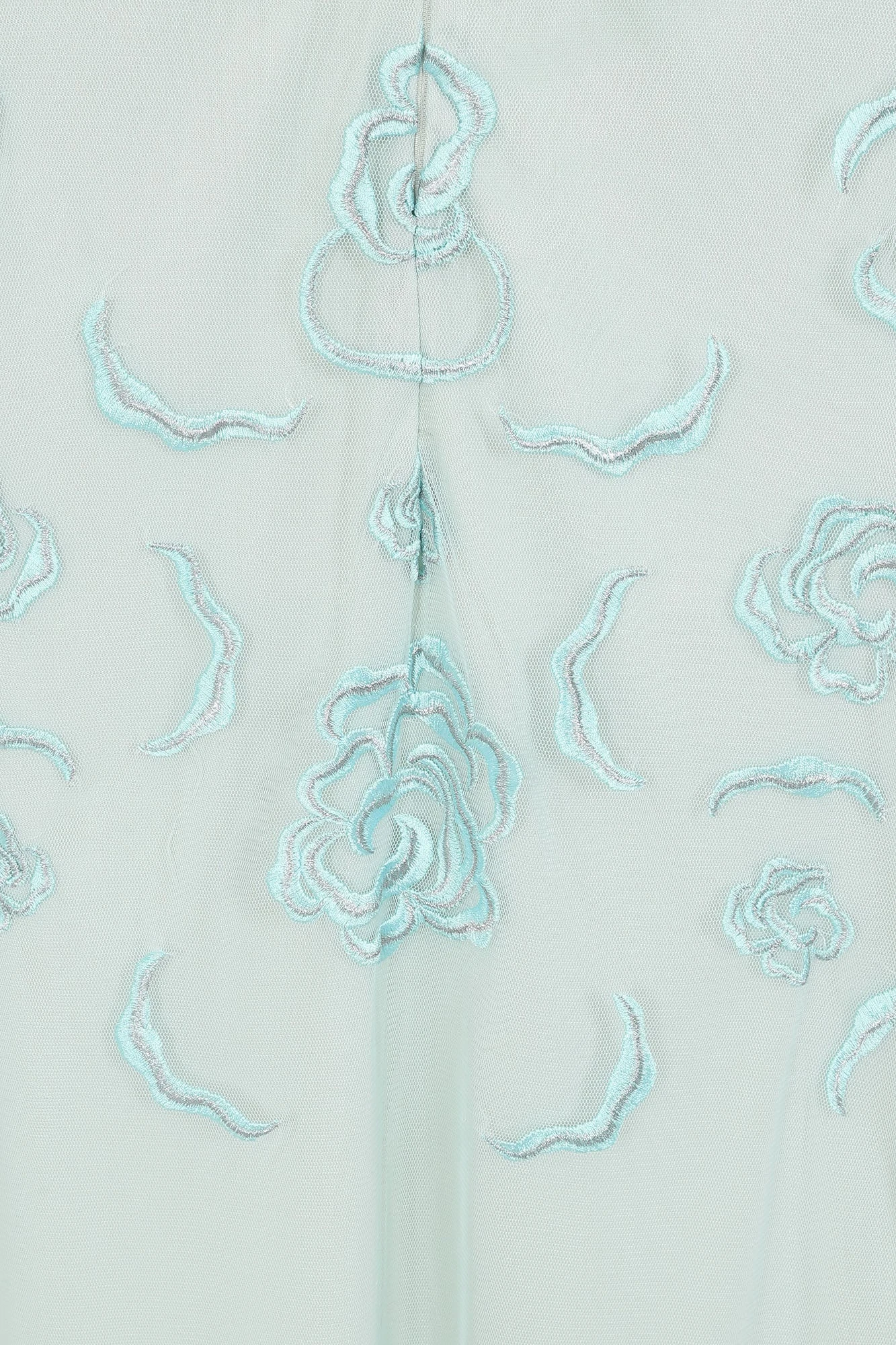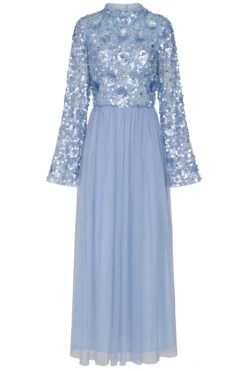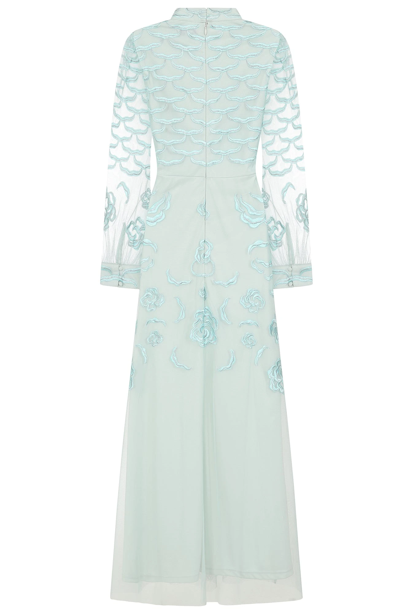 Made with special occasions in mind, the aqua green Loretta boasts tone on tone embroidery that cascades across the bodice before unfurling in a floral inspired motif that swirls across the floor skimming skirt. This elegant maxi is complete with a high neckline and full length semi-sheer sleeves.