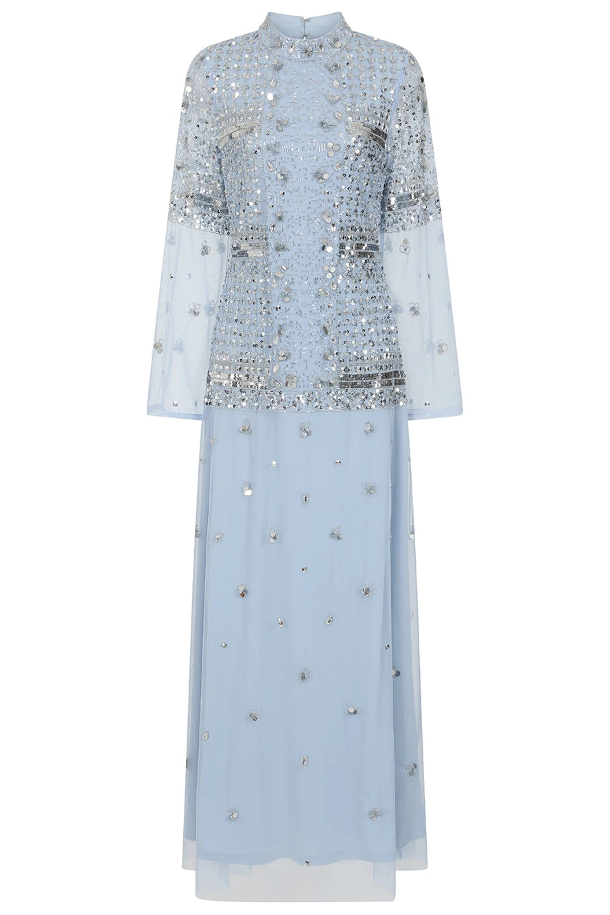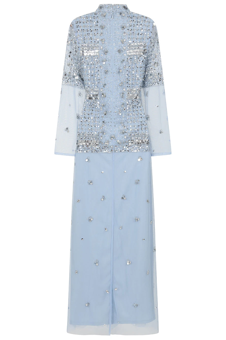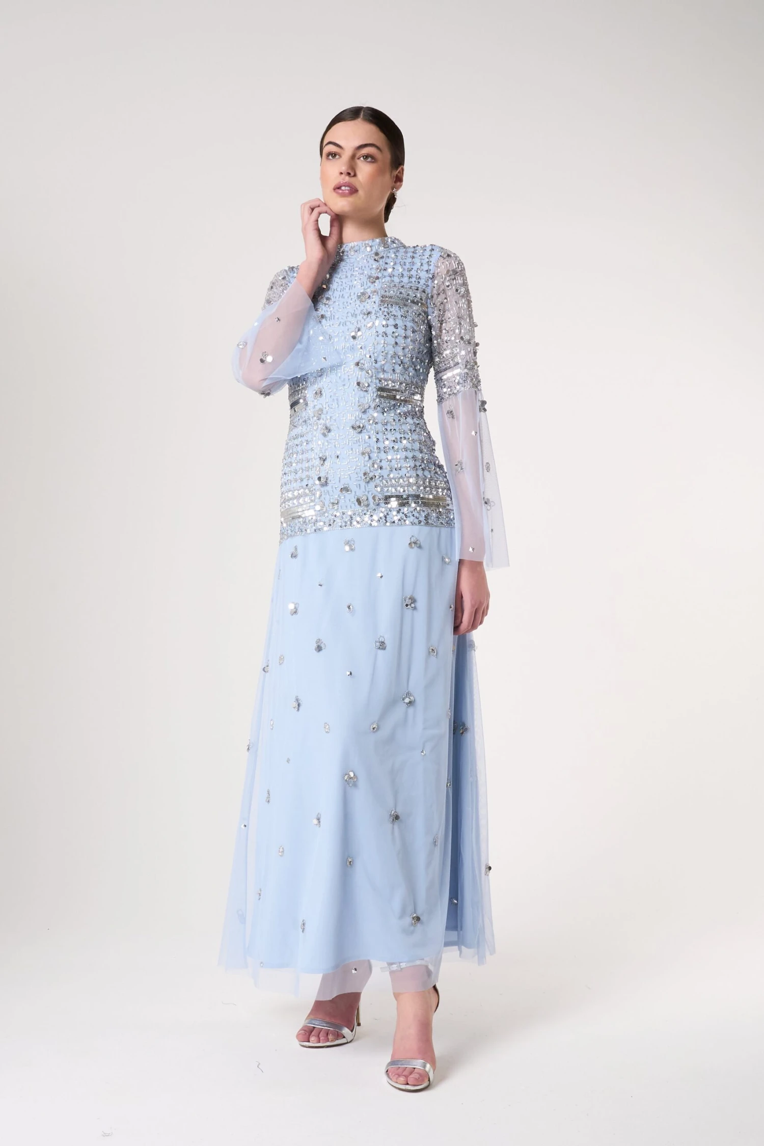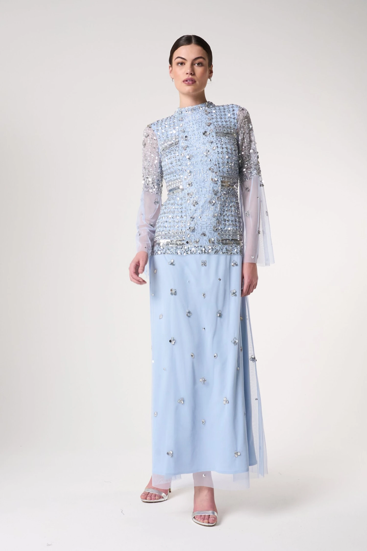 Strike a minimal silhouette at any special occasion with Lucile. Realised in a cool ice blue, this full length dress is complete with long sleeves, a high neckline and silver embellished detailing.