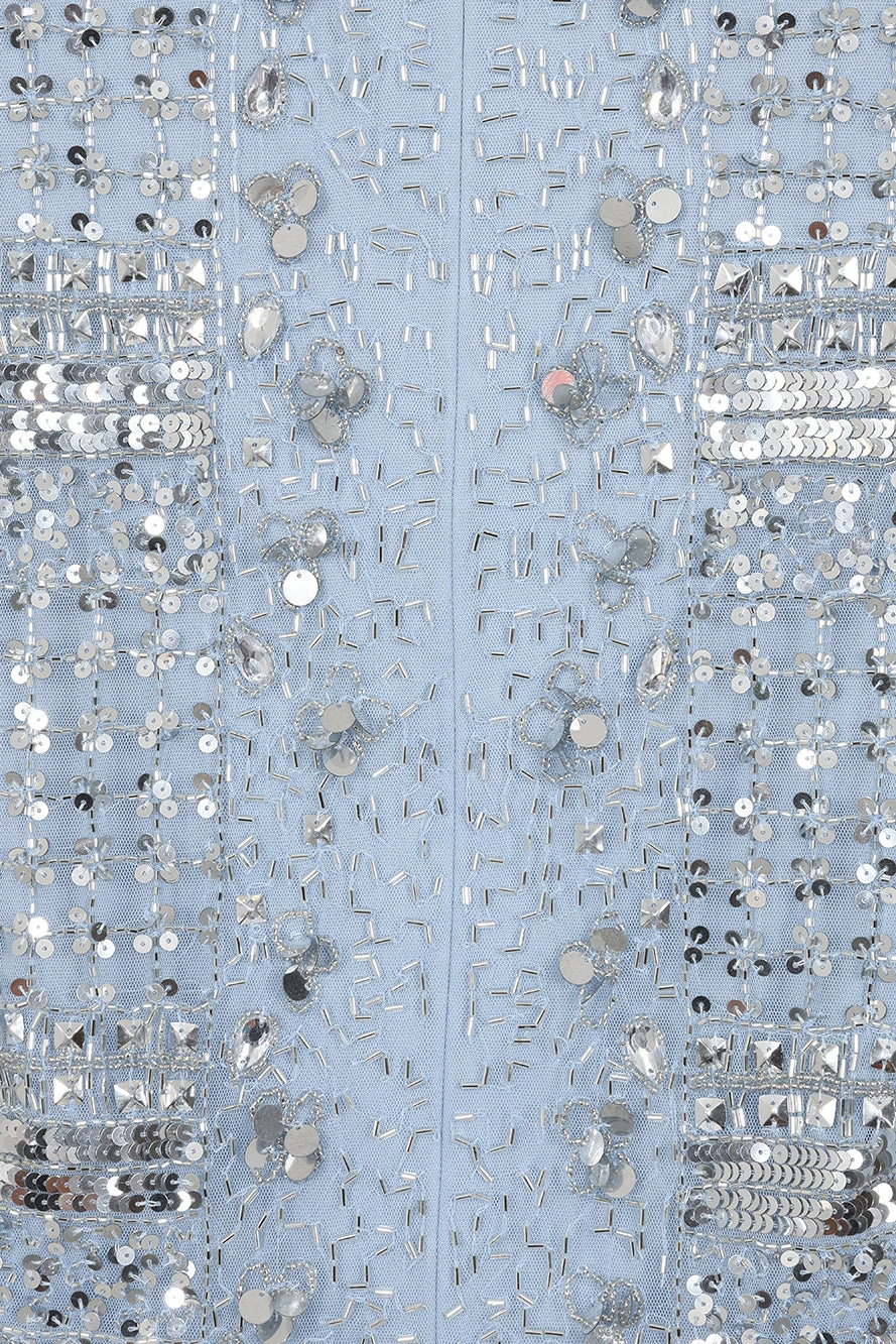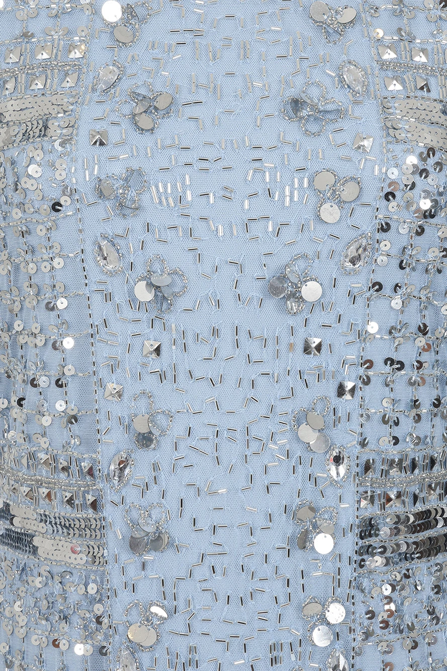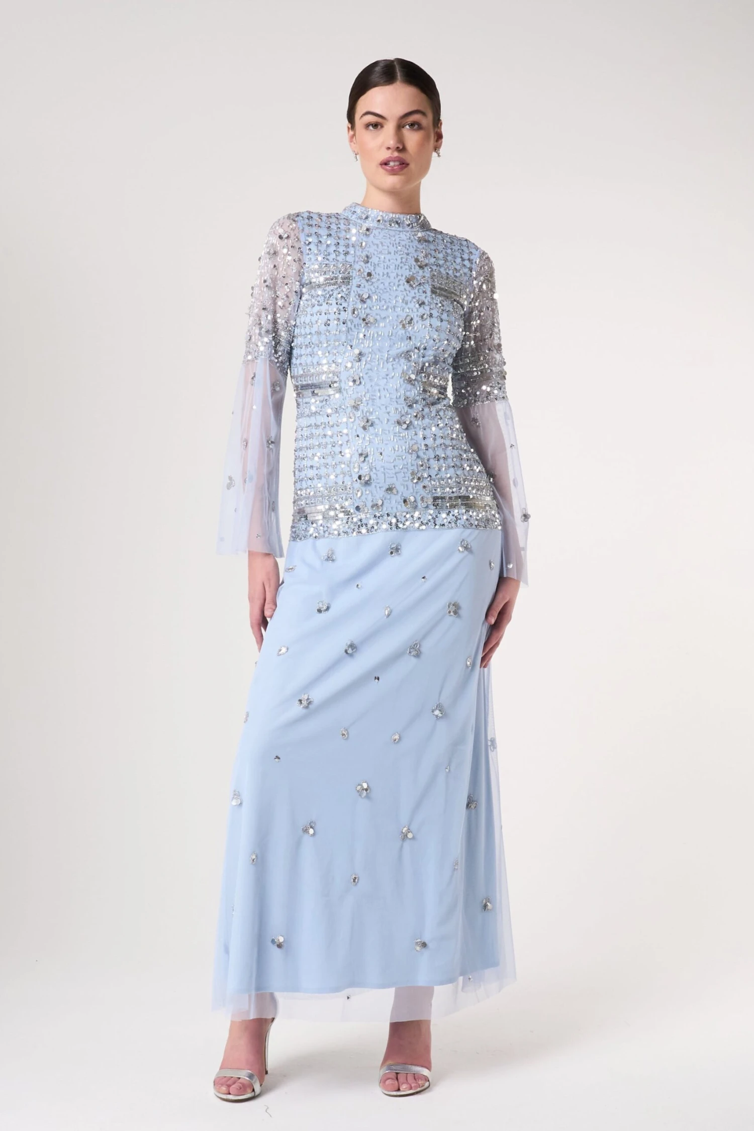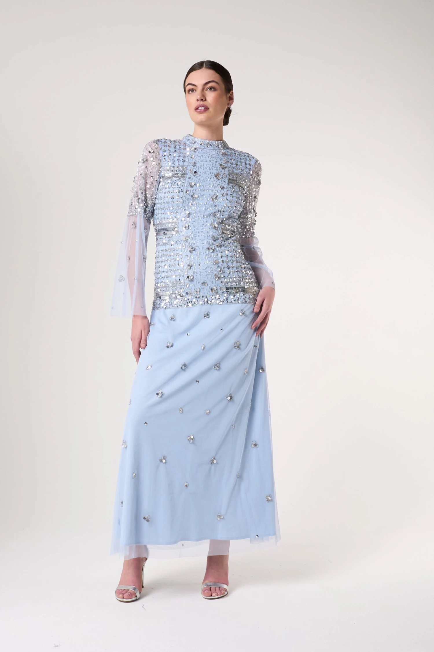 Strike a minimal silhouette at any special occasion with Lucile. Realised in a cool ice blue, this full length dress is complete with long sleeves, a high neckline and silver embellished detailing.