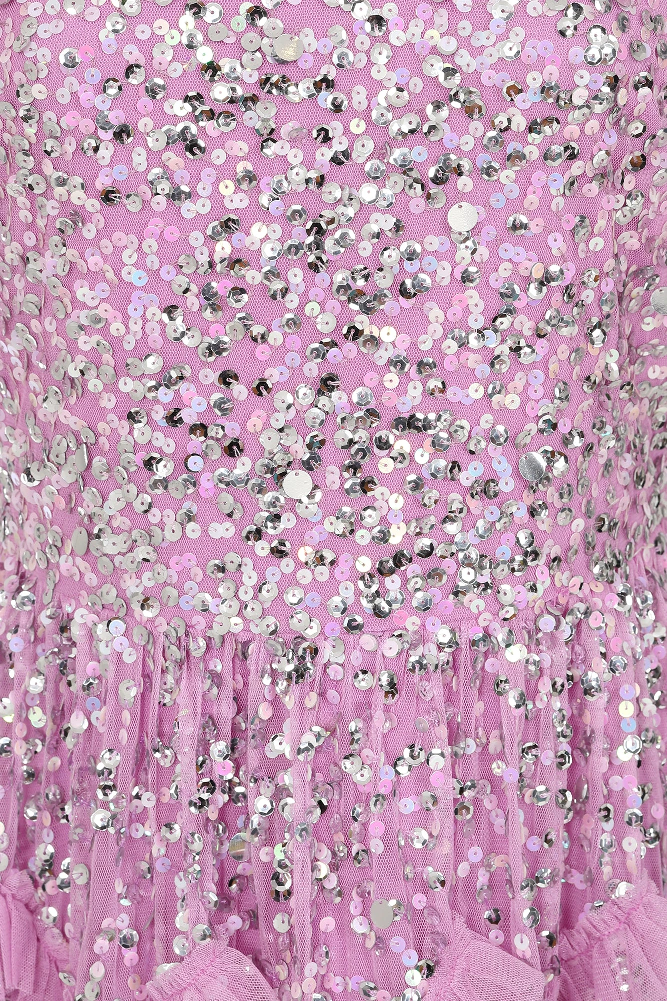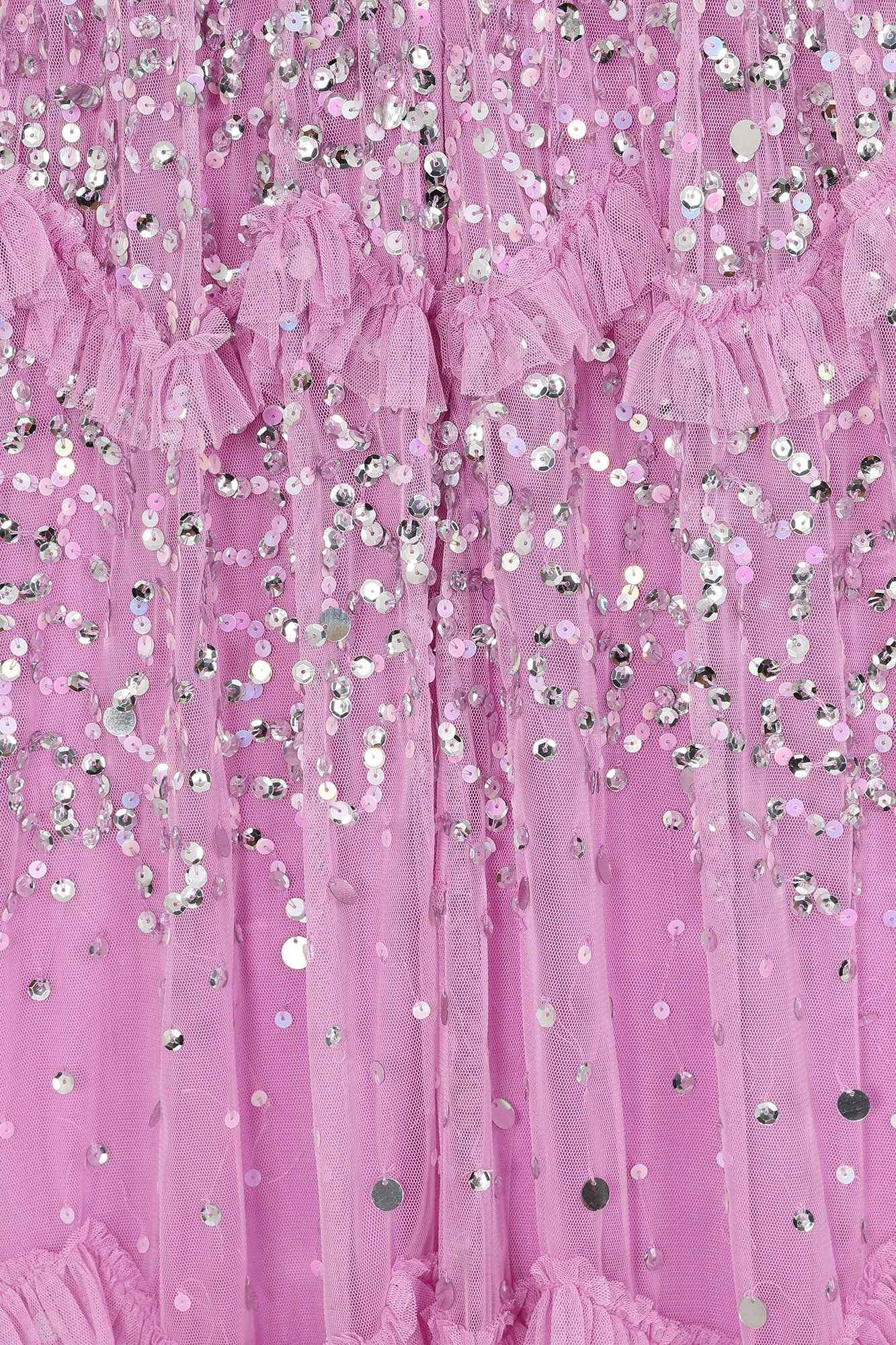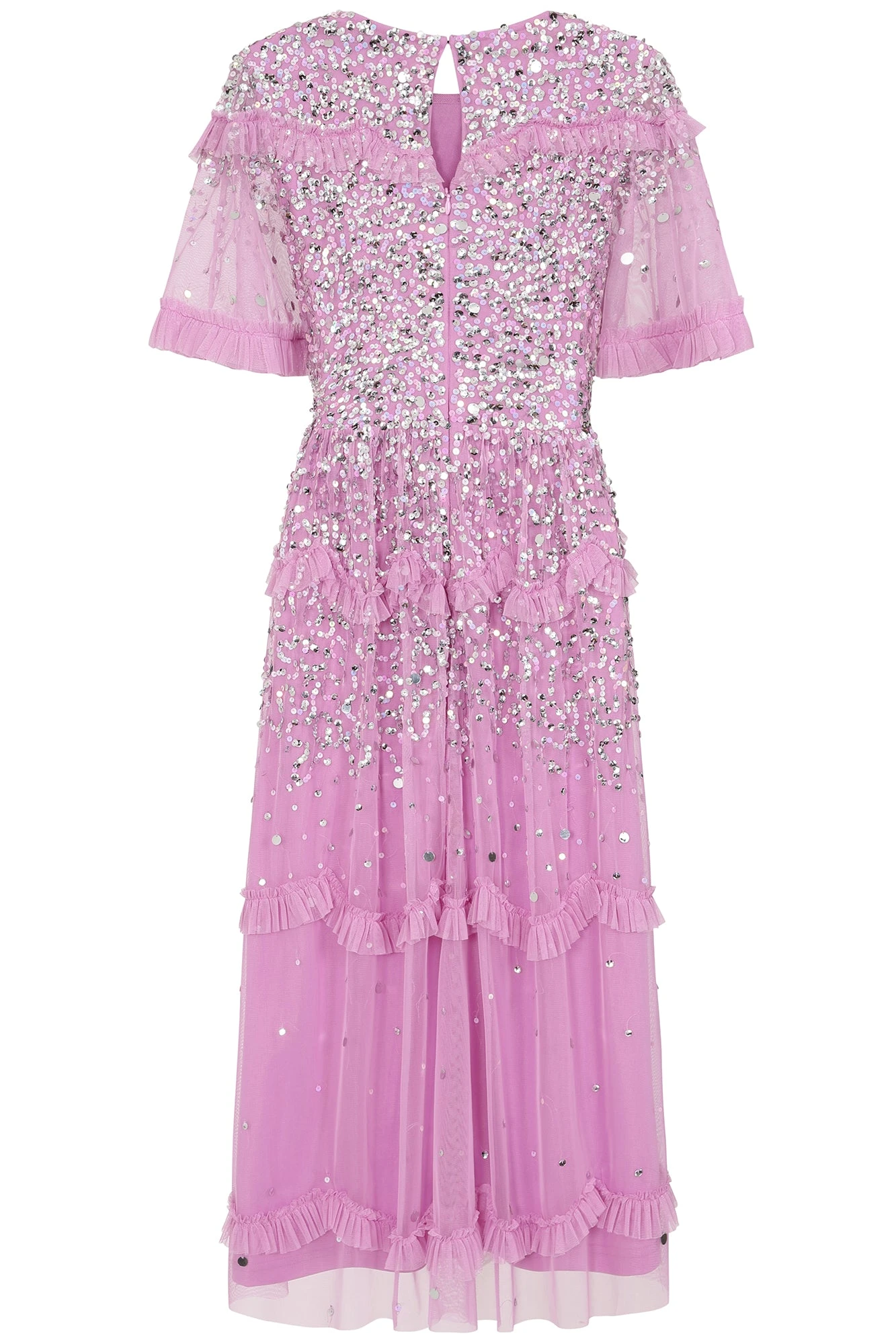 Bring a princess vibe to your special occasion style with Lynne! Realised in a joyful bubble gum pink this mid length dress is strewn with sequins and tiered with ruffles. Pair with silver heels and a statement clutch.