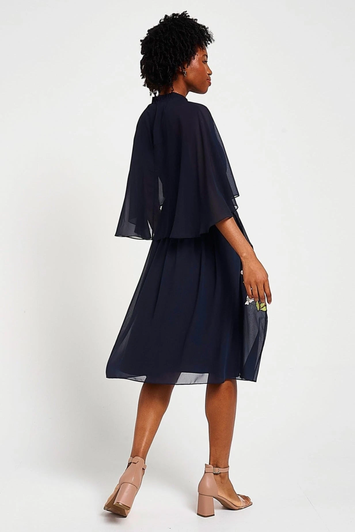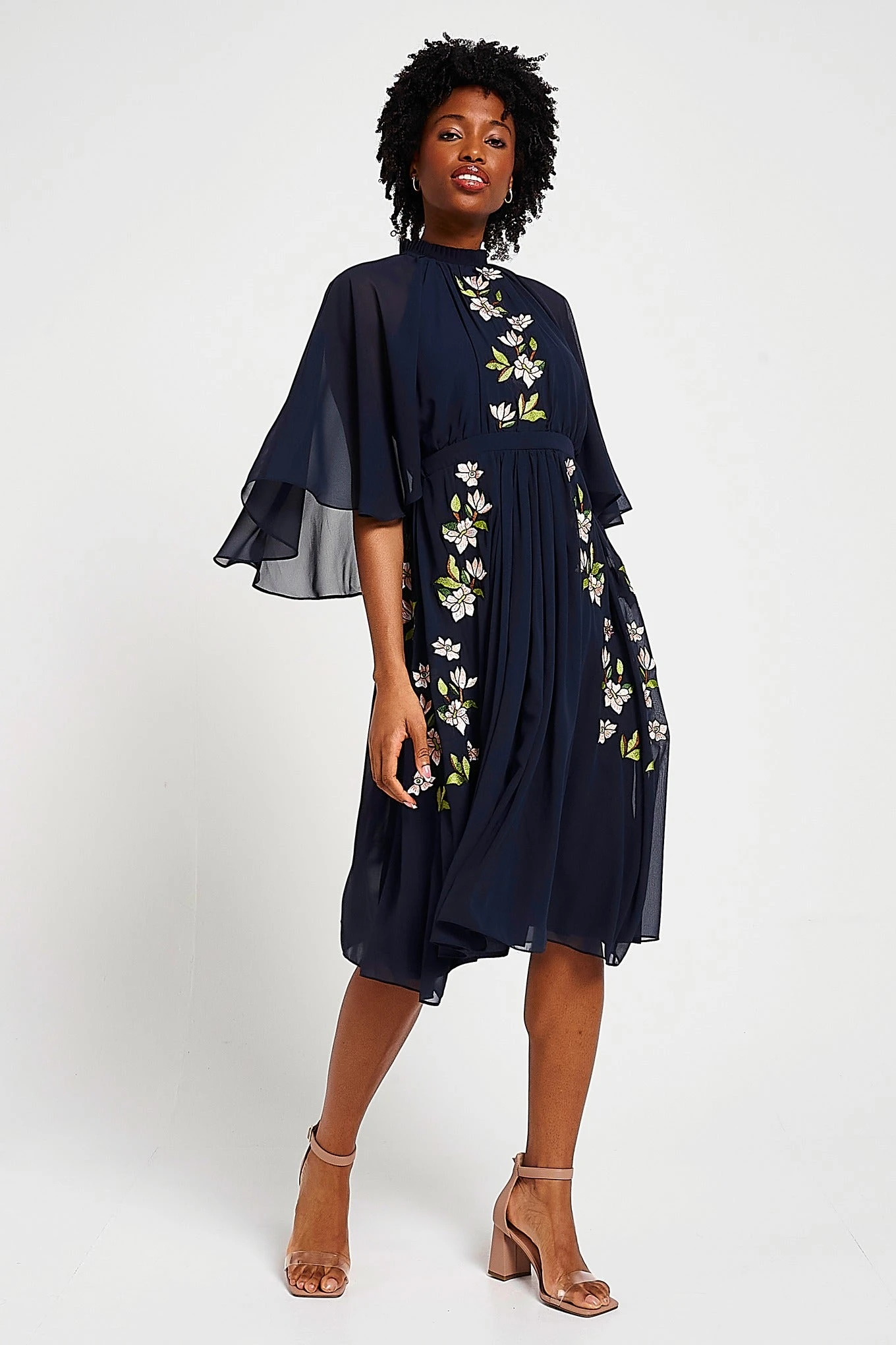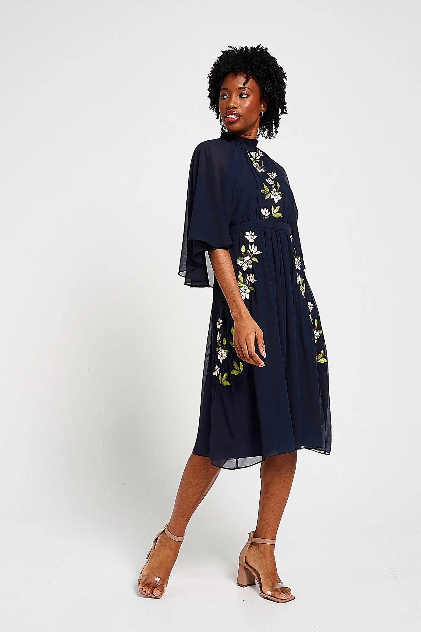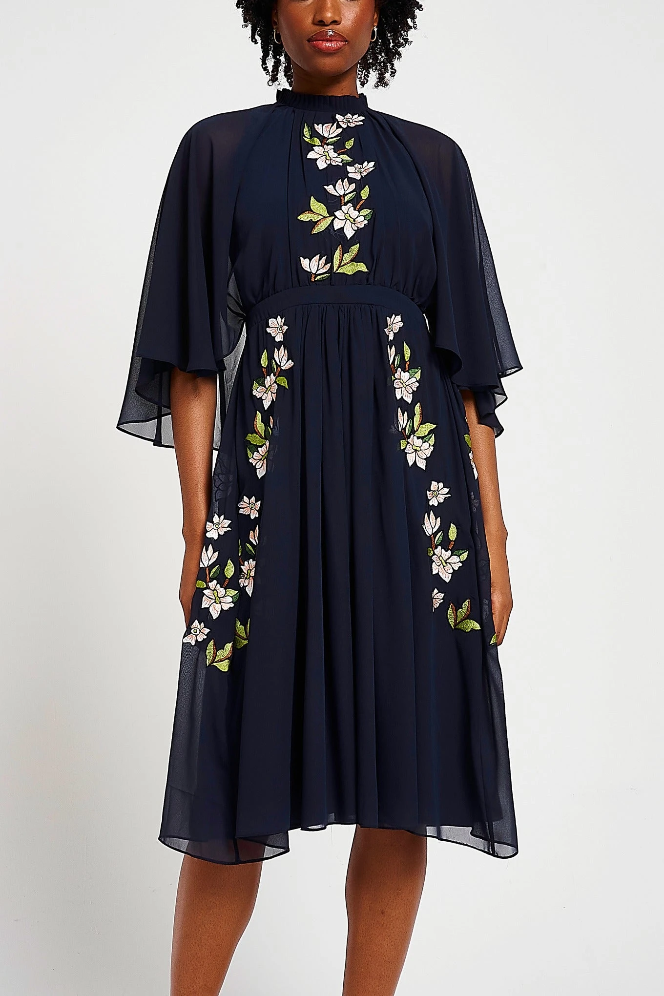 A little navy dress to put on repeat, the charming Maeve is the perfect choice for special spring days. Cut in a relaxed silhouette, this mid length dress features cape style sleeves and is complete with pretty floral embroidery.