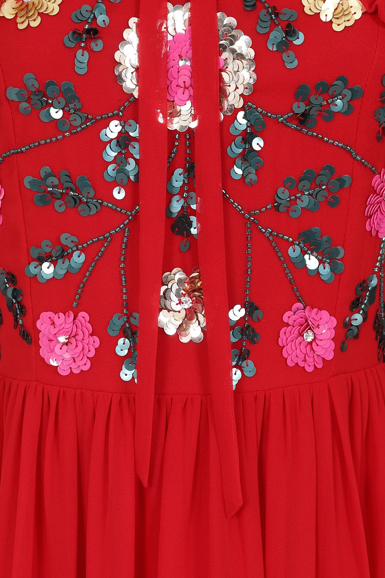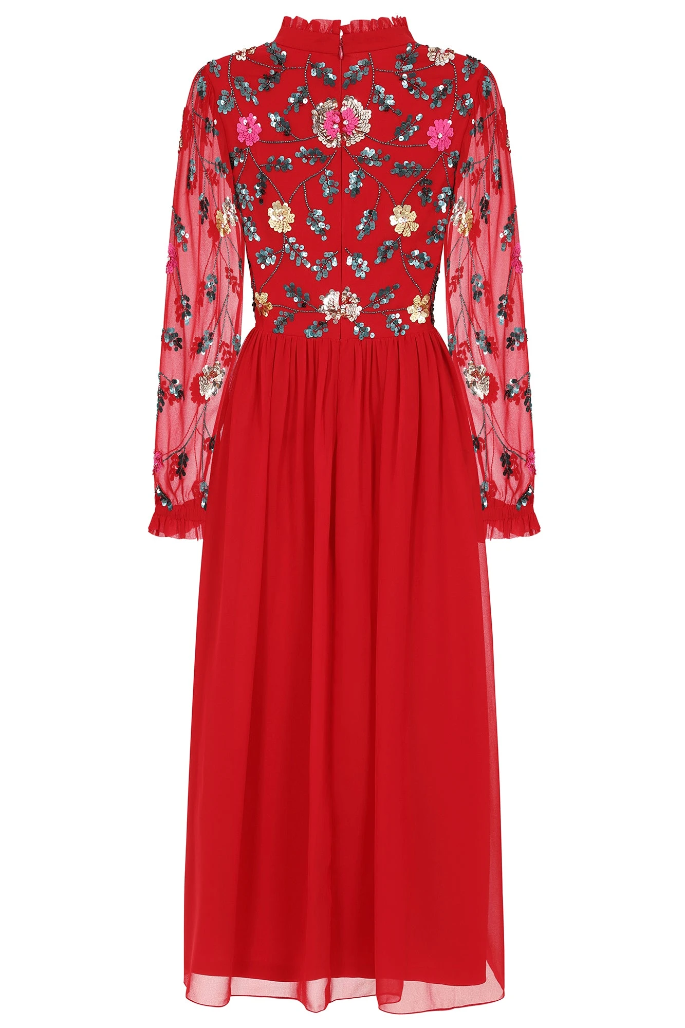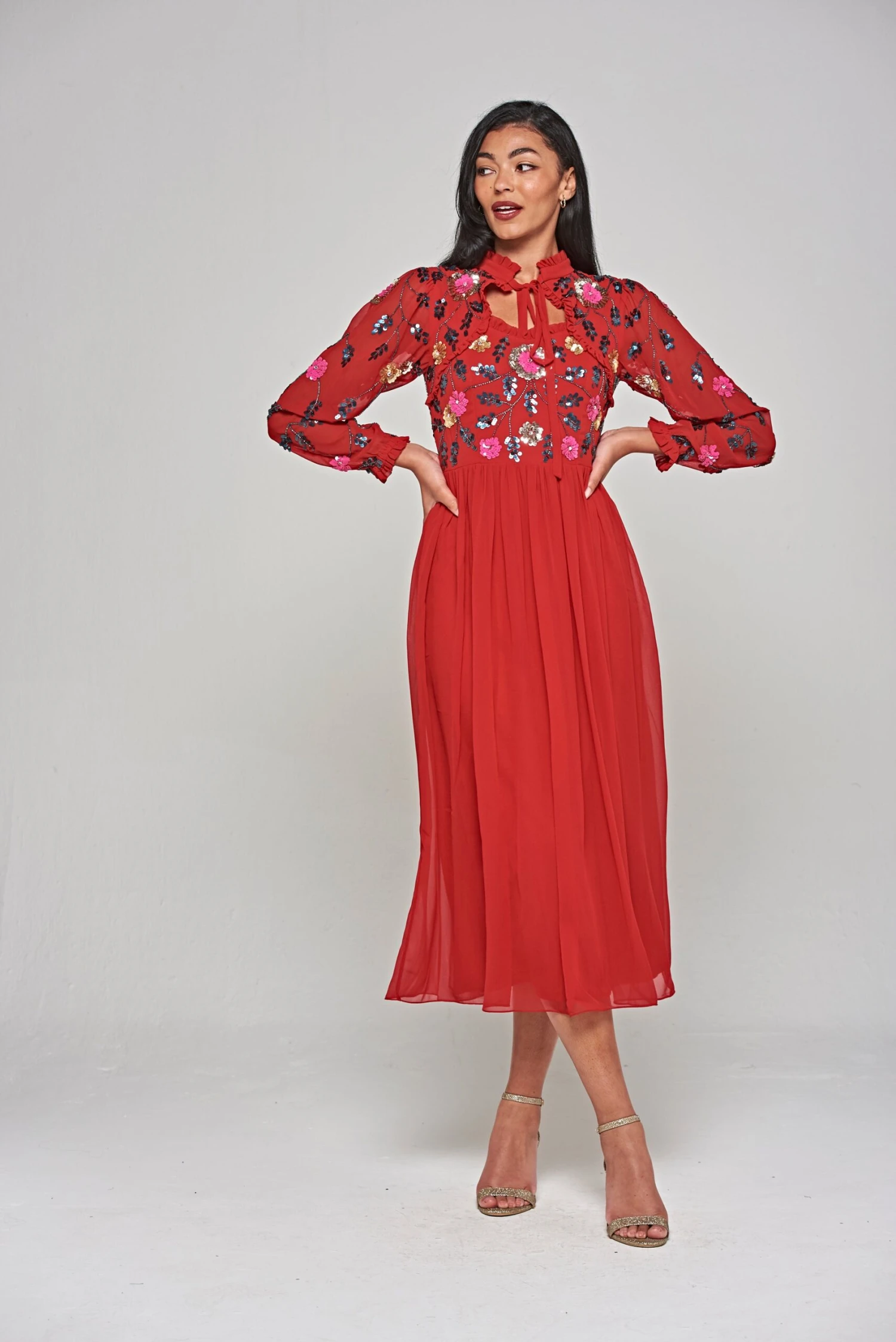 Now available in a bold, lipstick red hue, Marette is the perfect midi dress for the upcoming festive season! Adorned with sparkling flower and leaf embellishment, realised in a pink, pewter and gold colourway, this long sleeved style is complete with a high neckline and self tie bow.