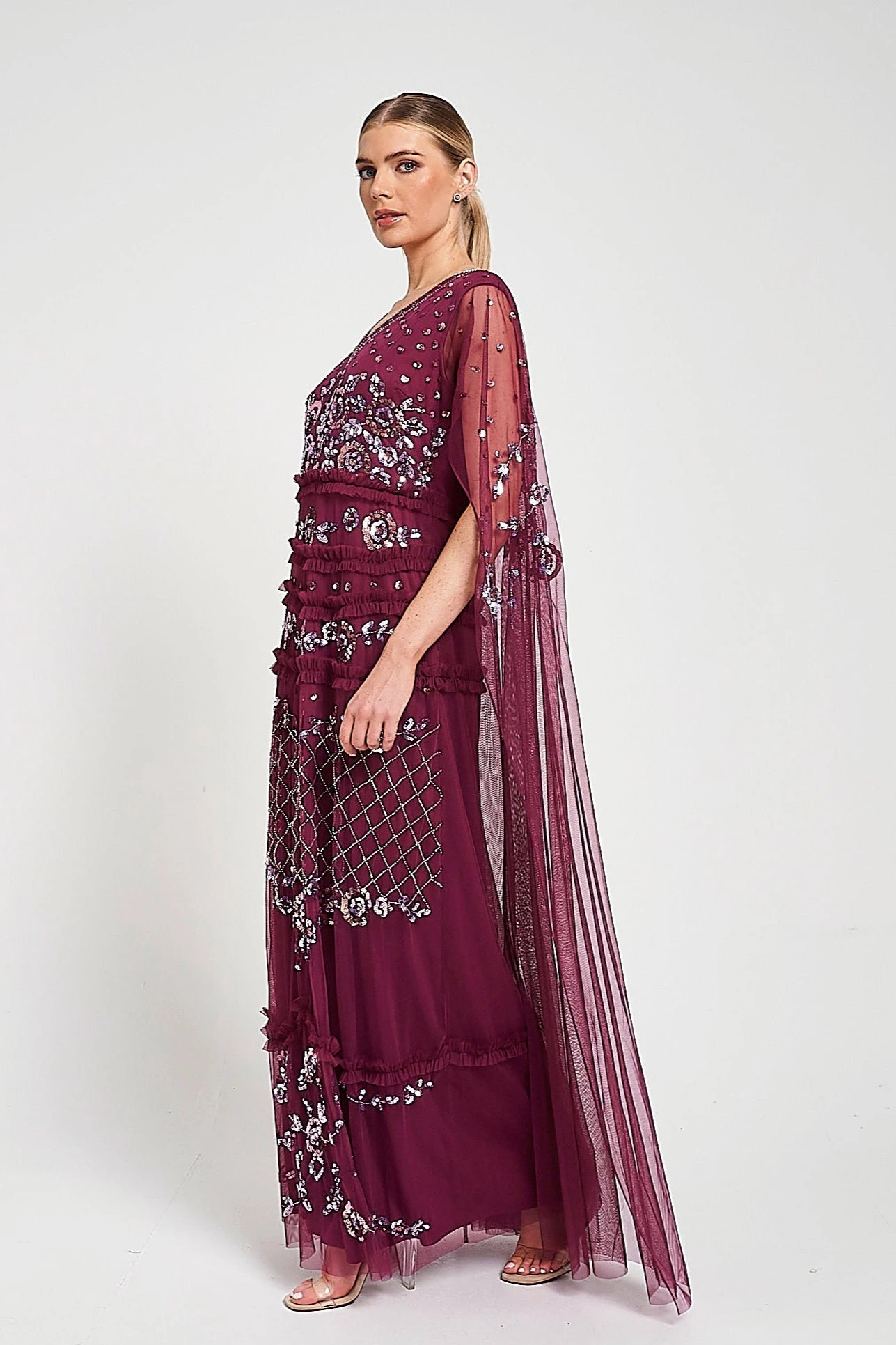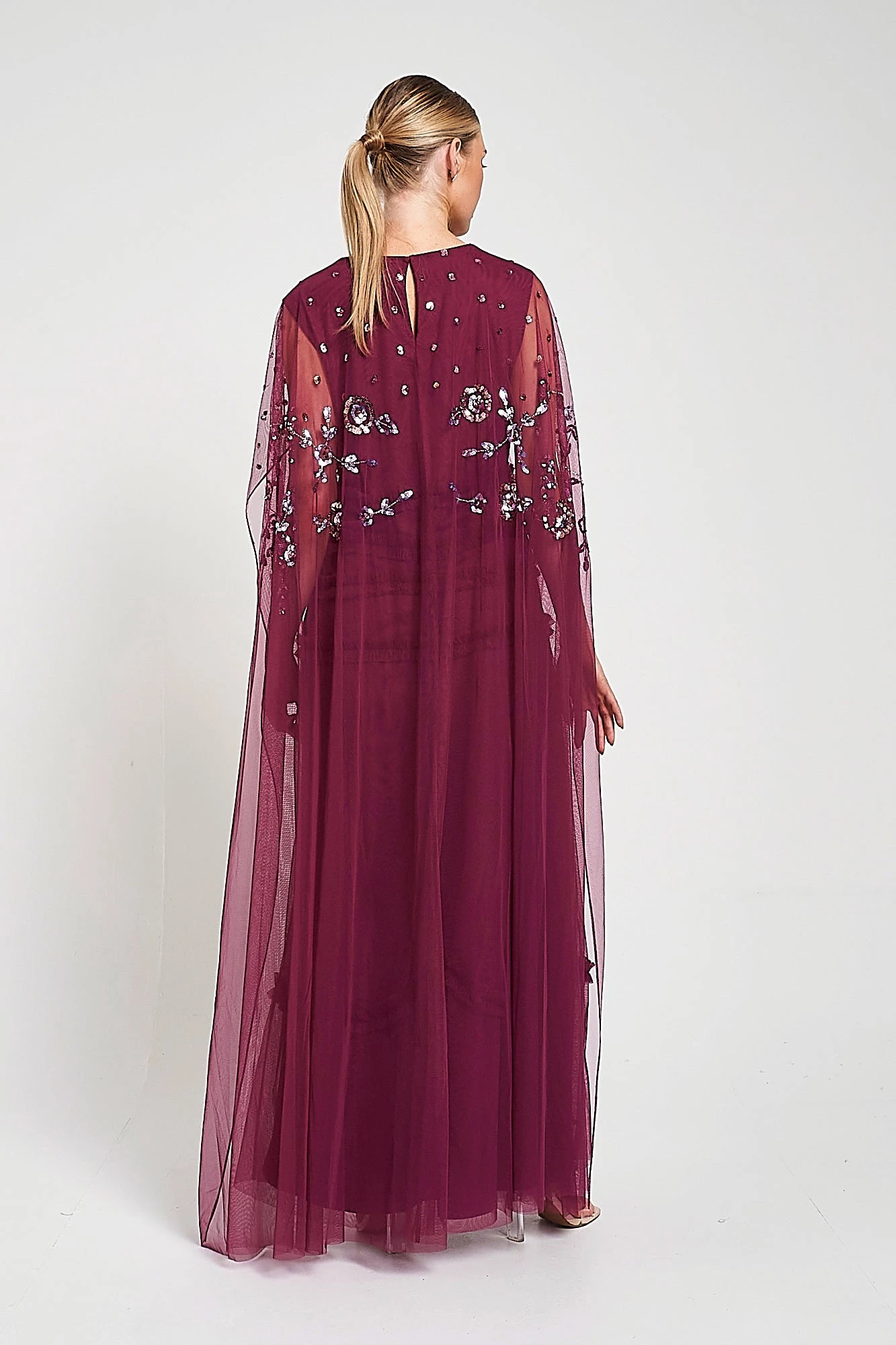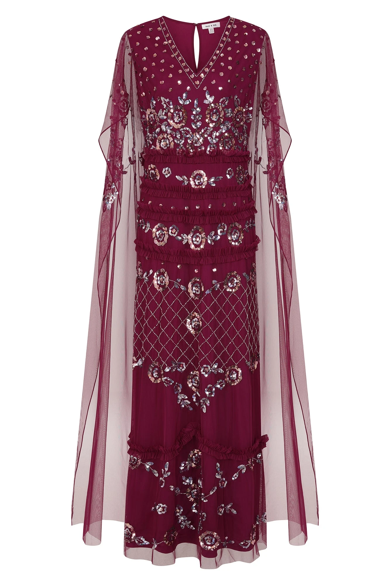 Float effortlessly into party season with Marilla. Designed with dramatic, full length cape sleeves, this berry hued gown is complete with sparkling silver embellishment, realised in intricate floral motifs.
