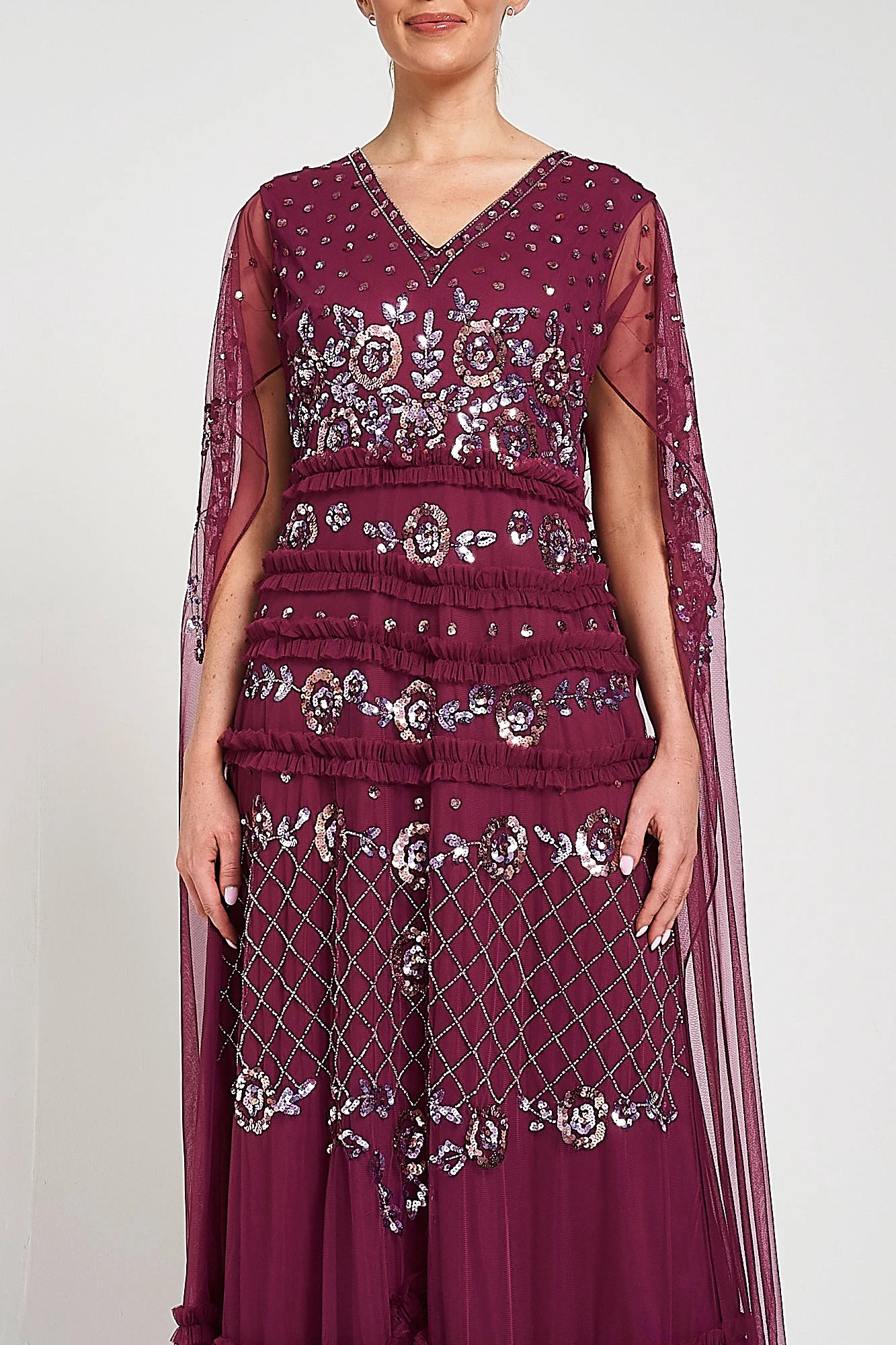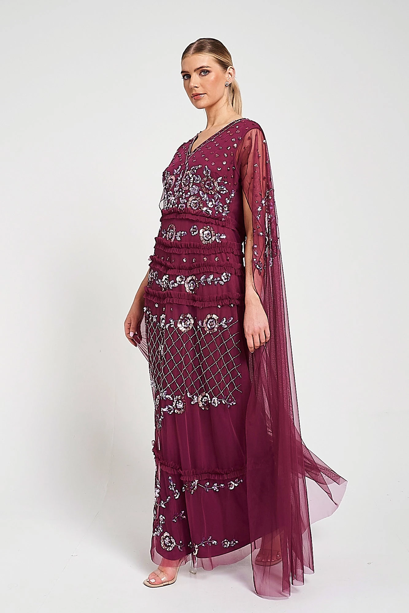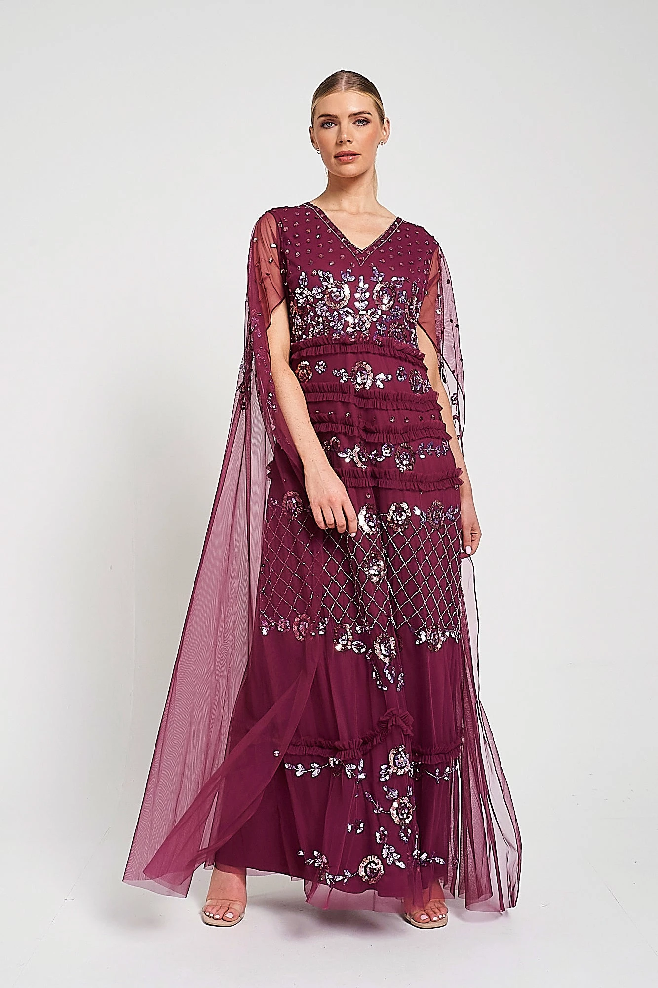 Float effortlessly into party season with Marilla. Designed with dramatic, full length cape sleeves, this berry hued gown is complete with sparkling silver embellishment, realised in intricate floral motifs.