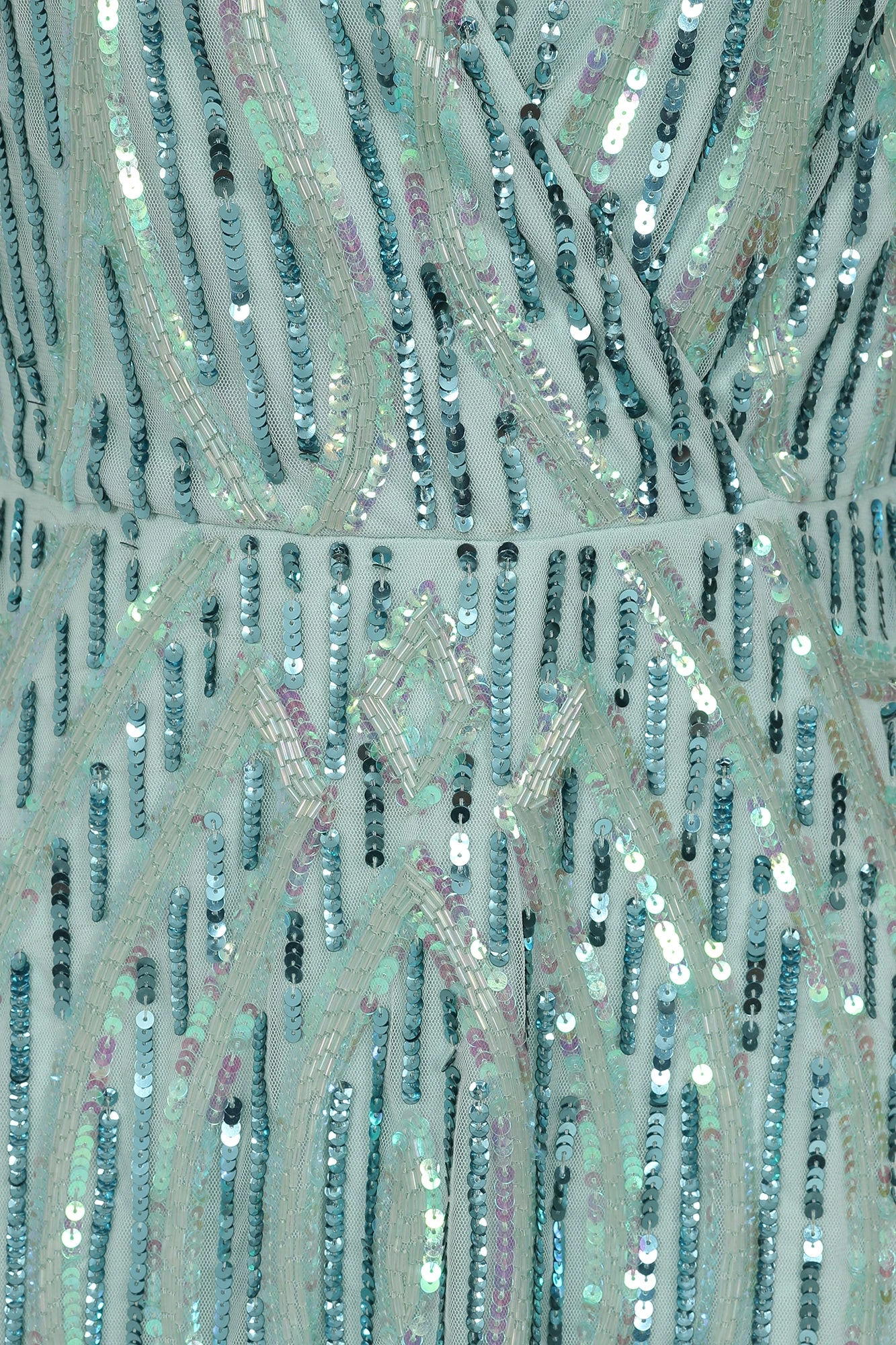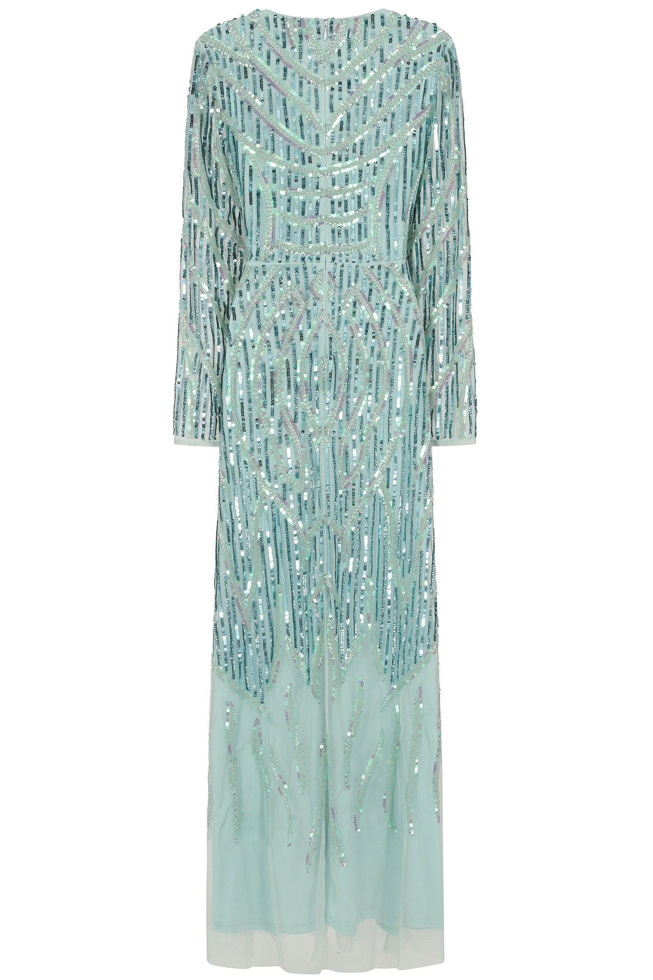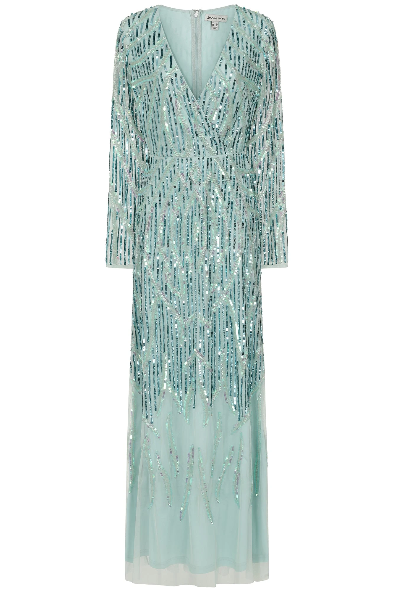 Dive headfirst into special occasion dressing with the aqua green Marina. Crafted in a wrap style silhouette, this long sleeved maxi dress is complete with intricate silver and blue beadwork that cascade towards the hemline.