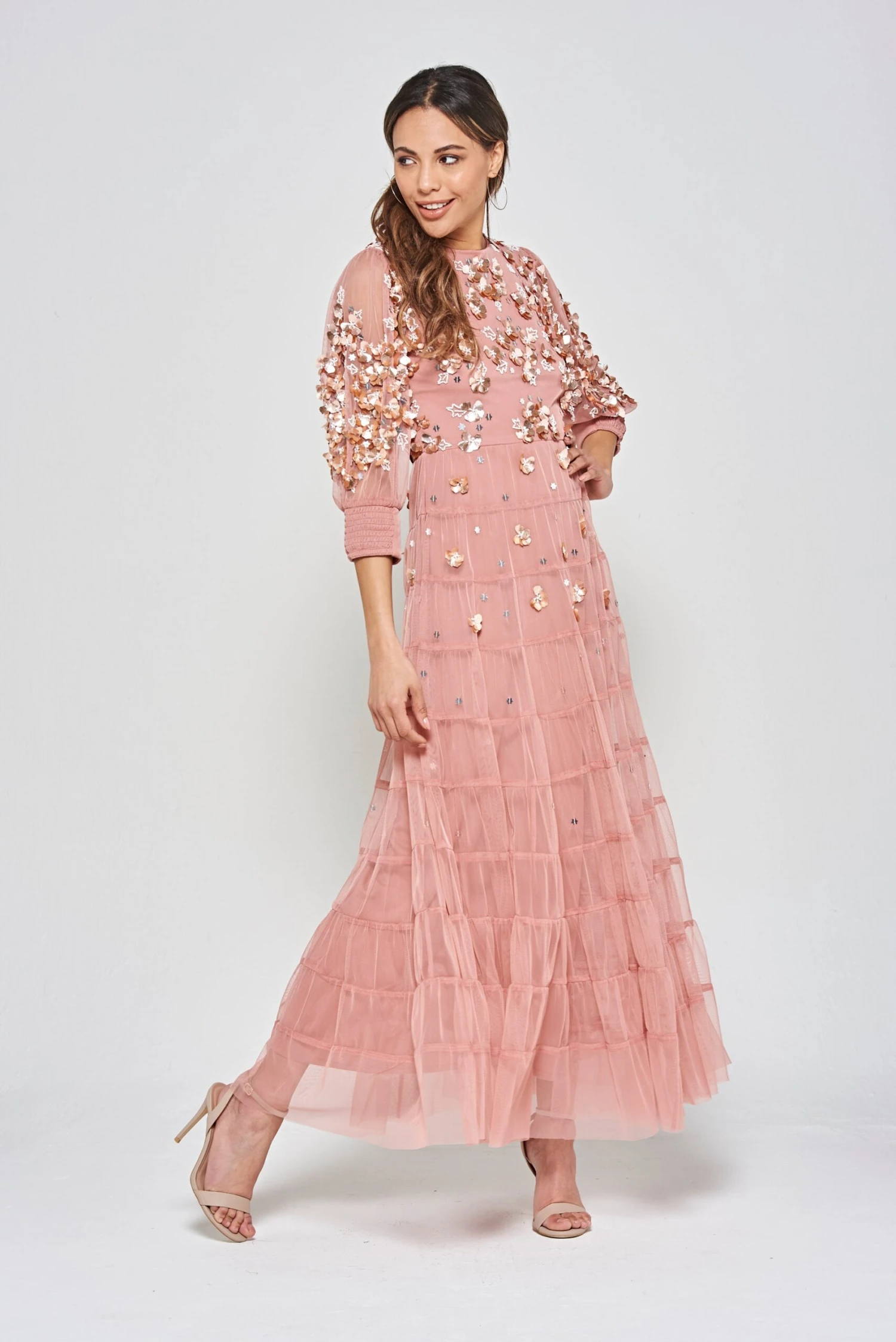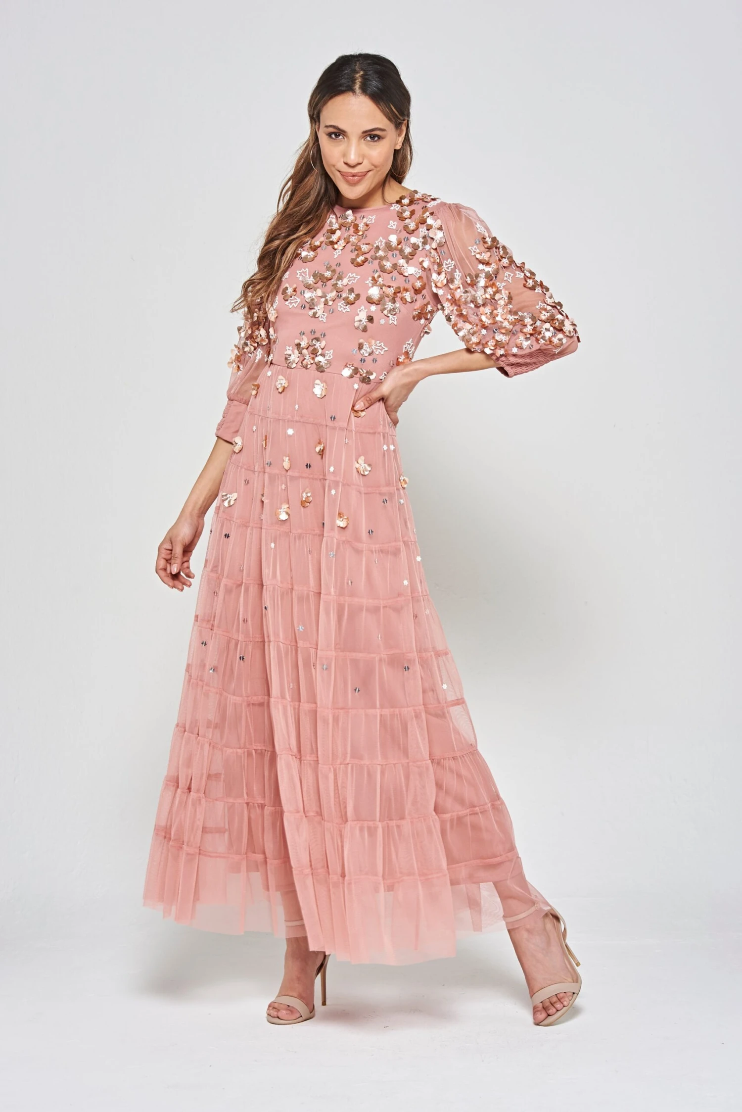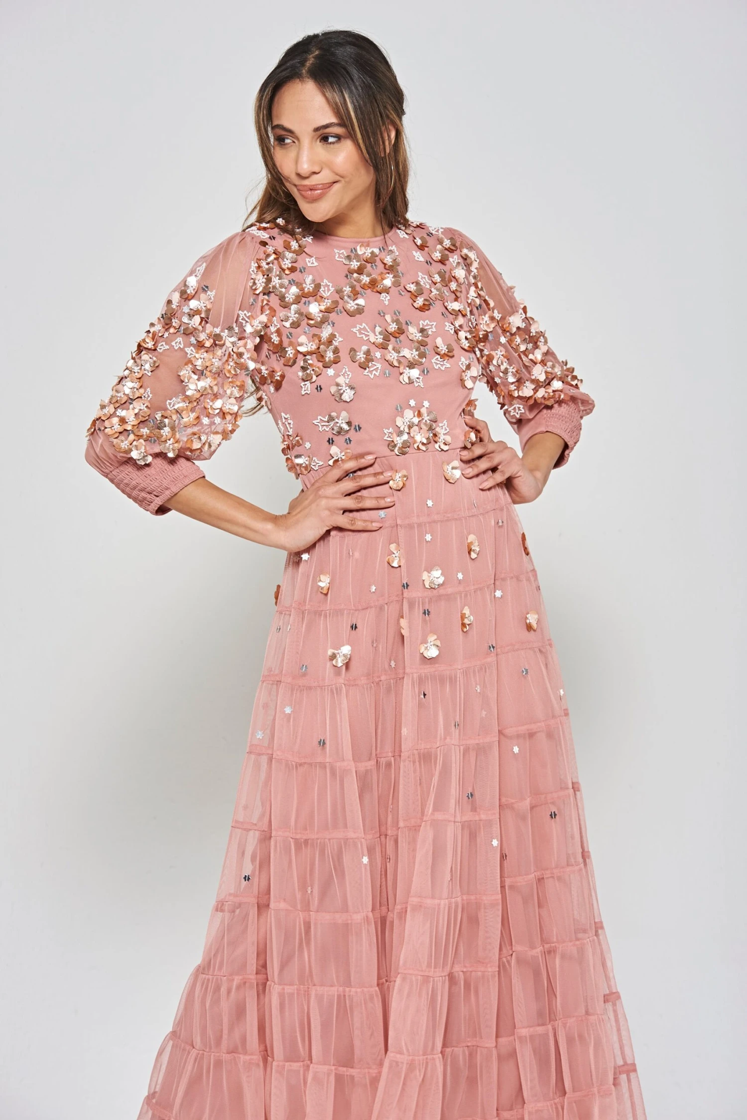 Prepare to embrace the romantic side of life in the rose tan Marissa dress. Scattered with artfully arranged sequin and bead embellishment, this twirl-worthy maxi boasts puff sleeves and a dramatic tiered skirt. Marissa is complete with a full length lining and a concealed zip closure at back.