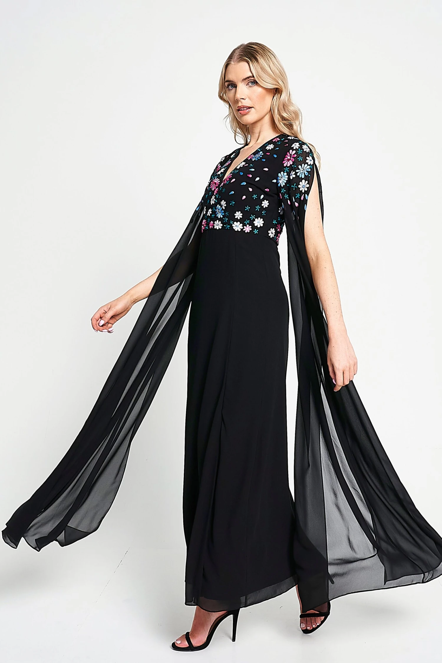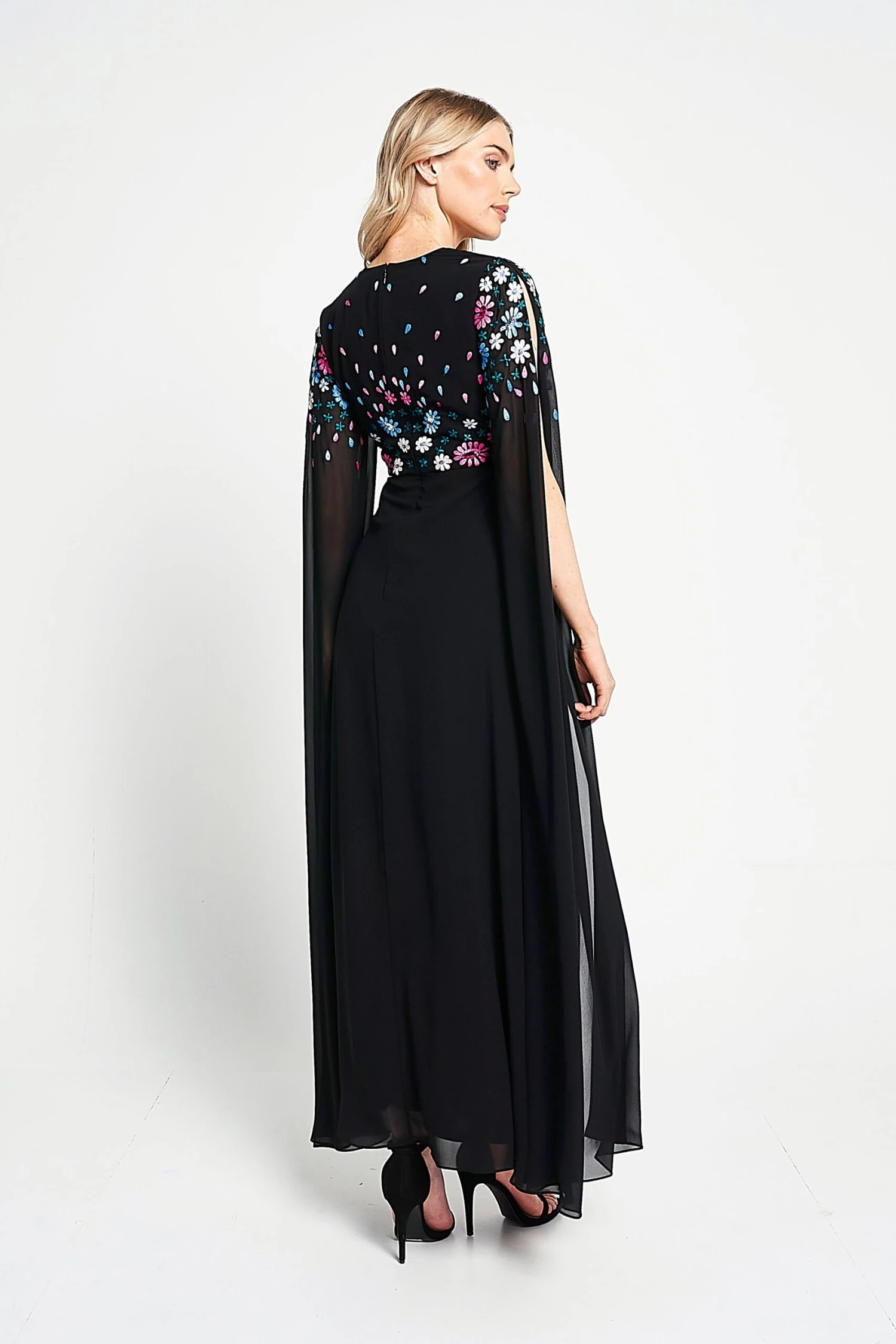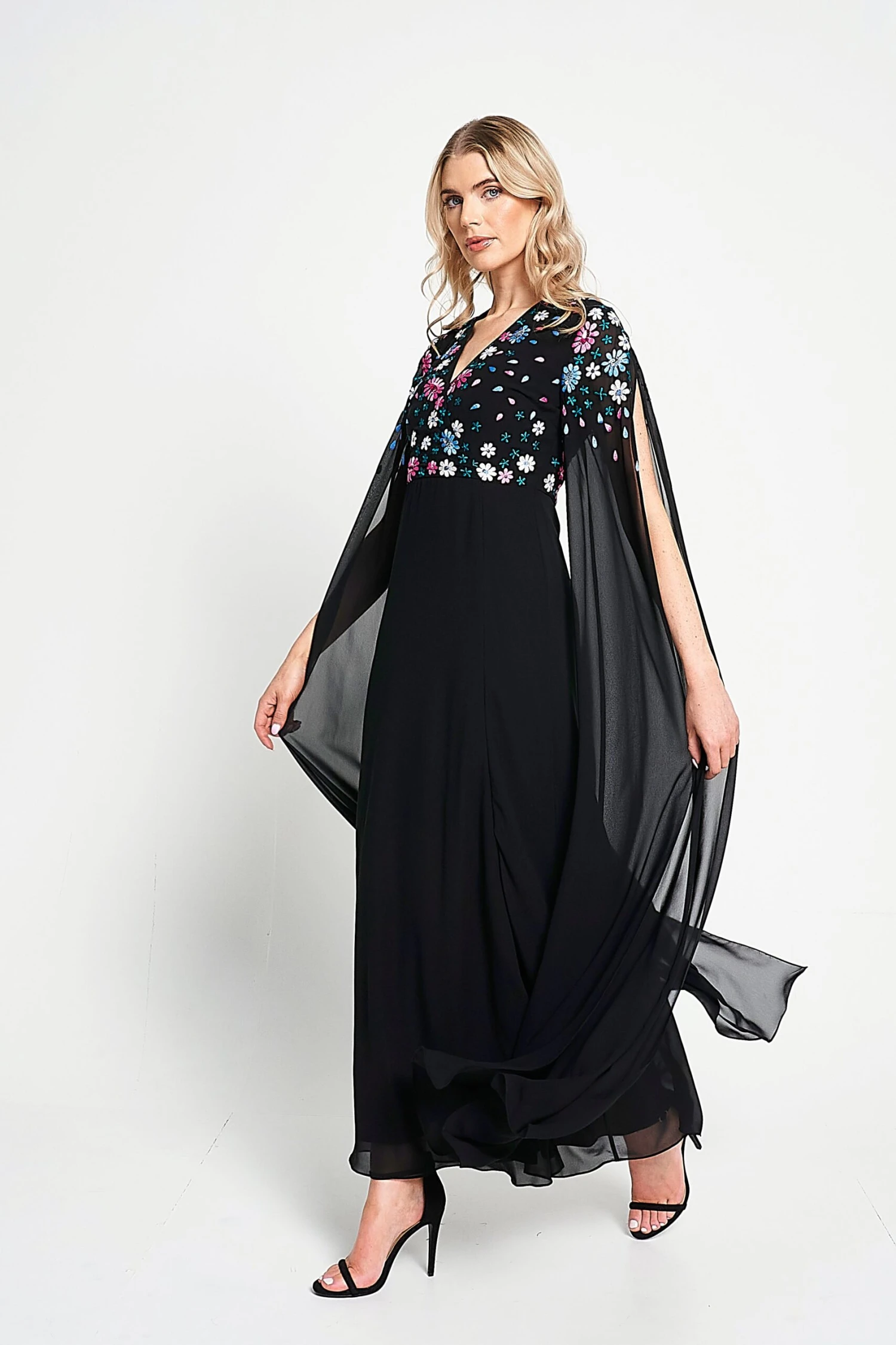 Mayra Black Floral Embroidered Cape Sleeve Maxi Dress