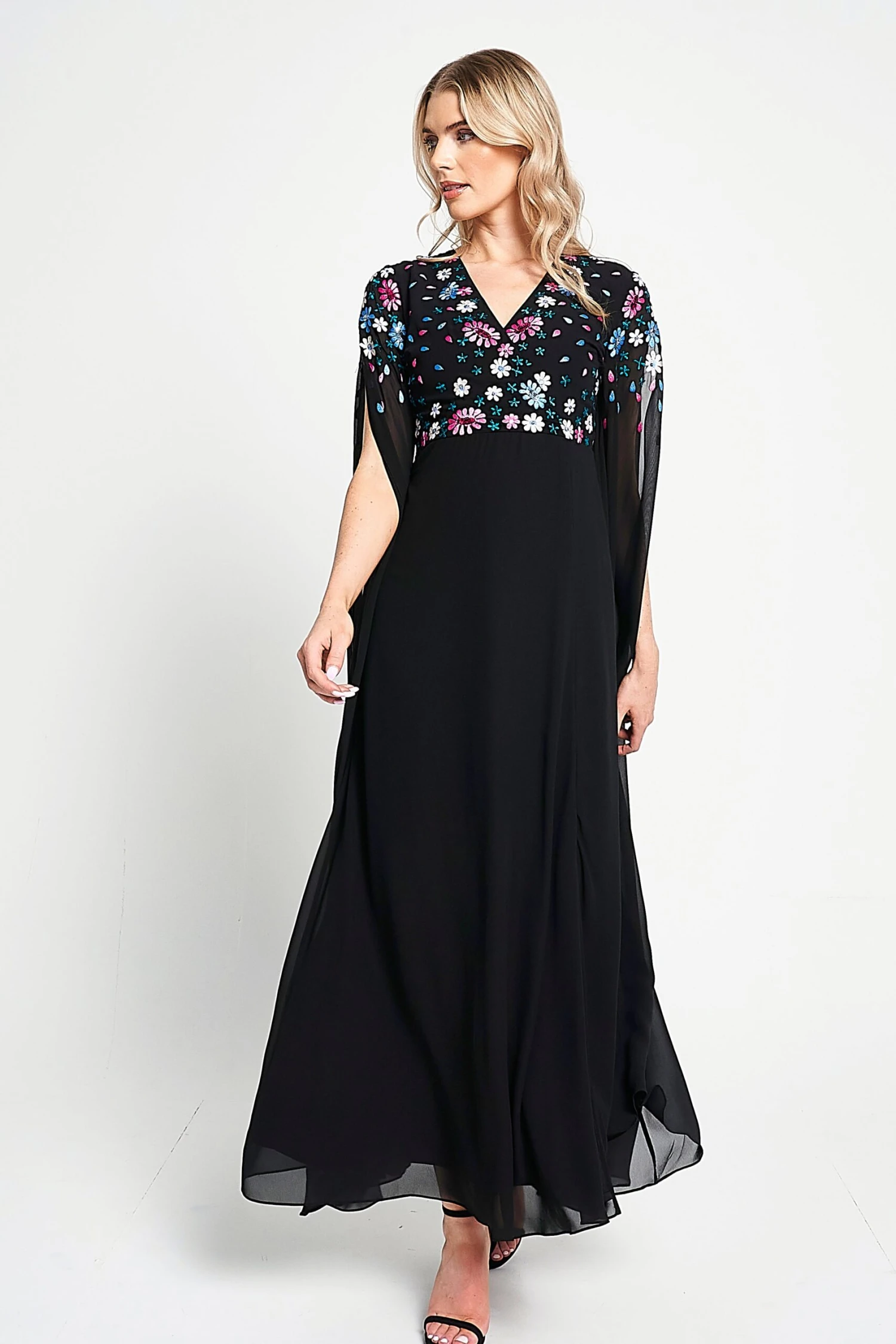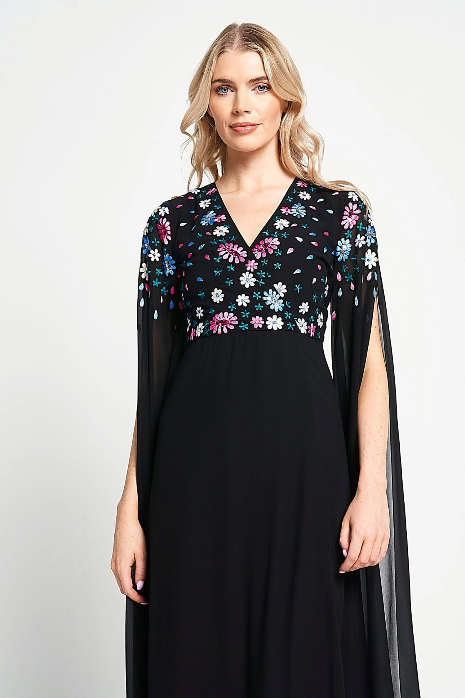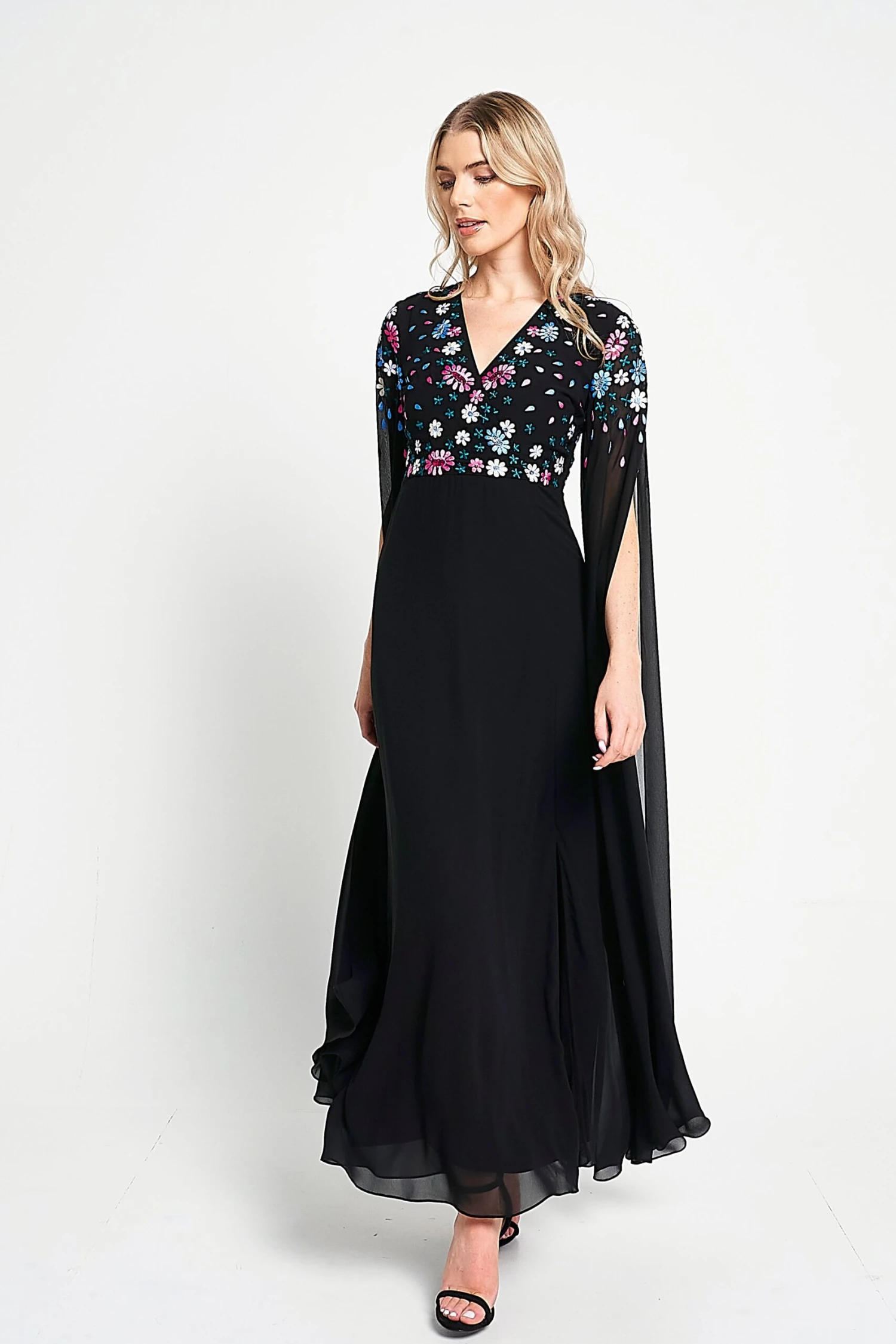 Mayra Black Floral Embroidered Cape Sleeve Maxi Dress
