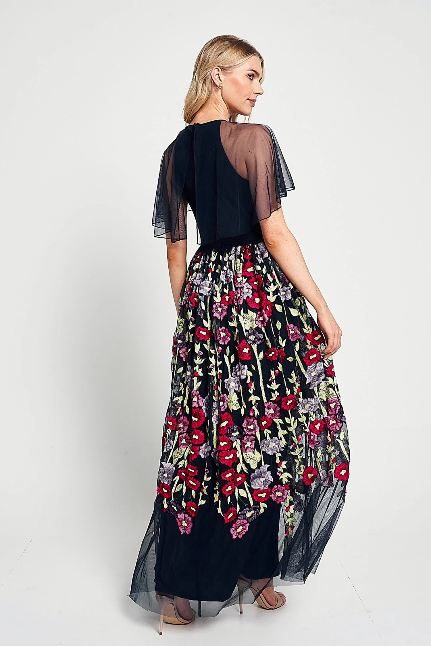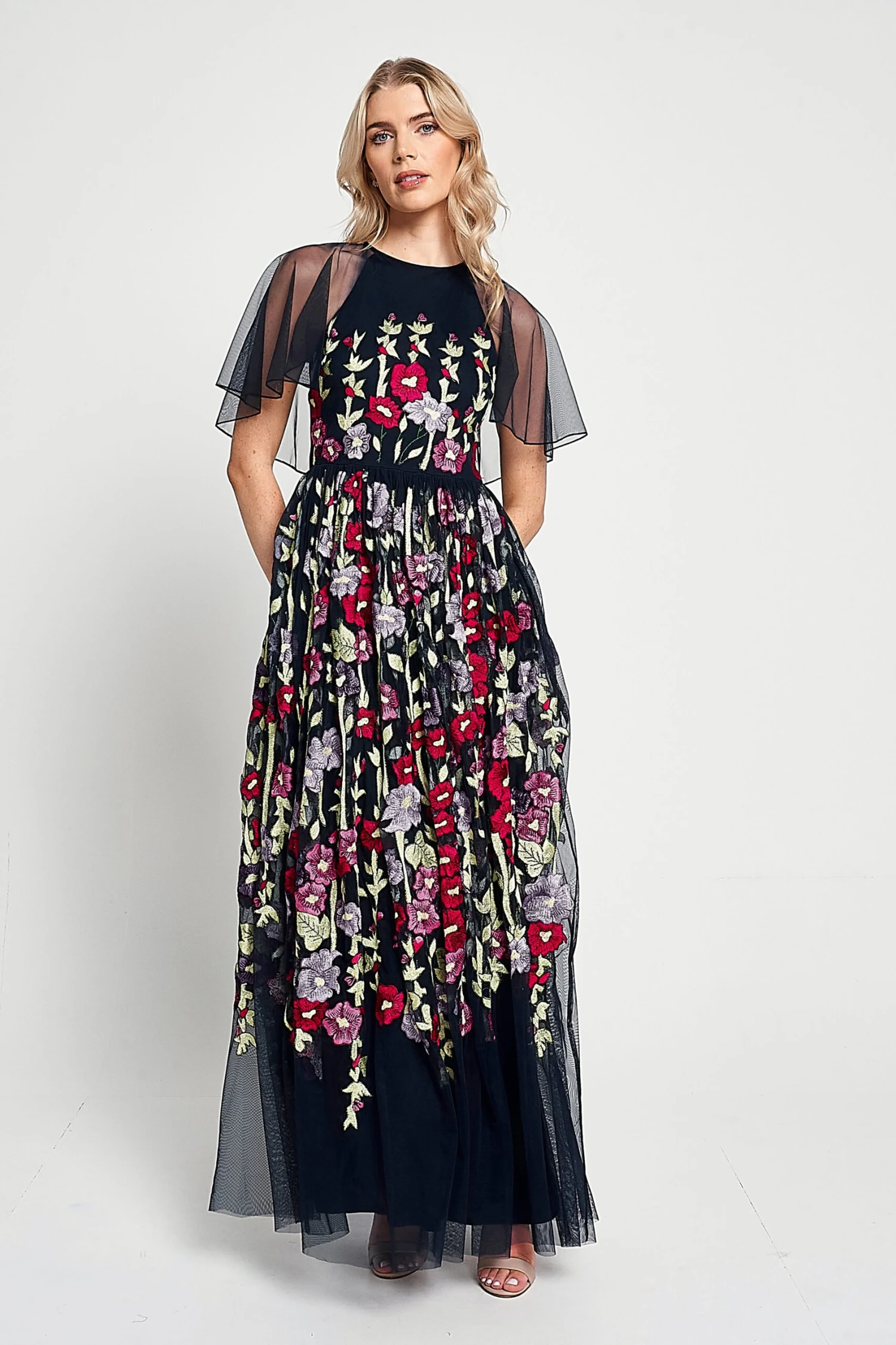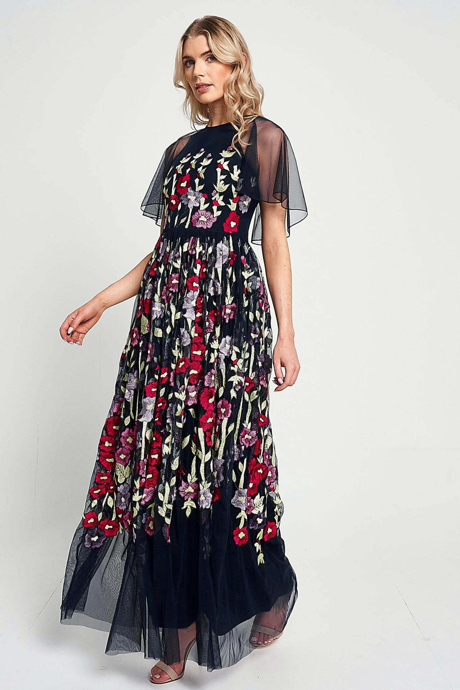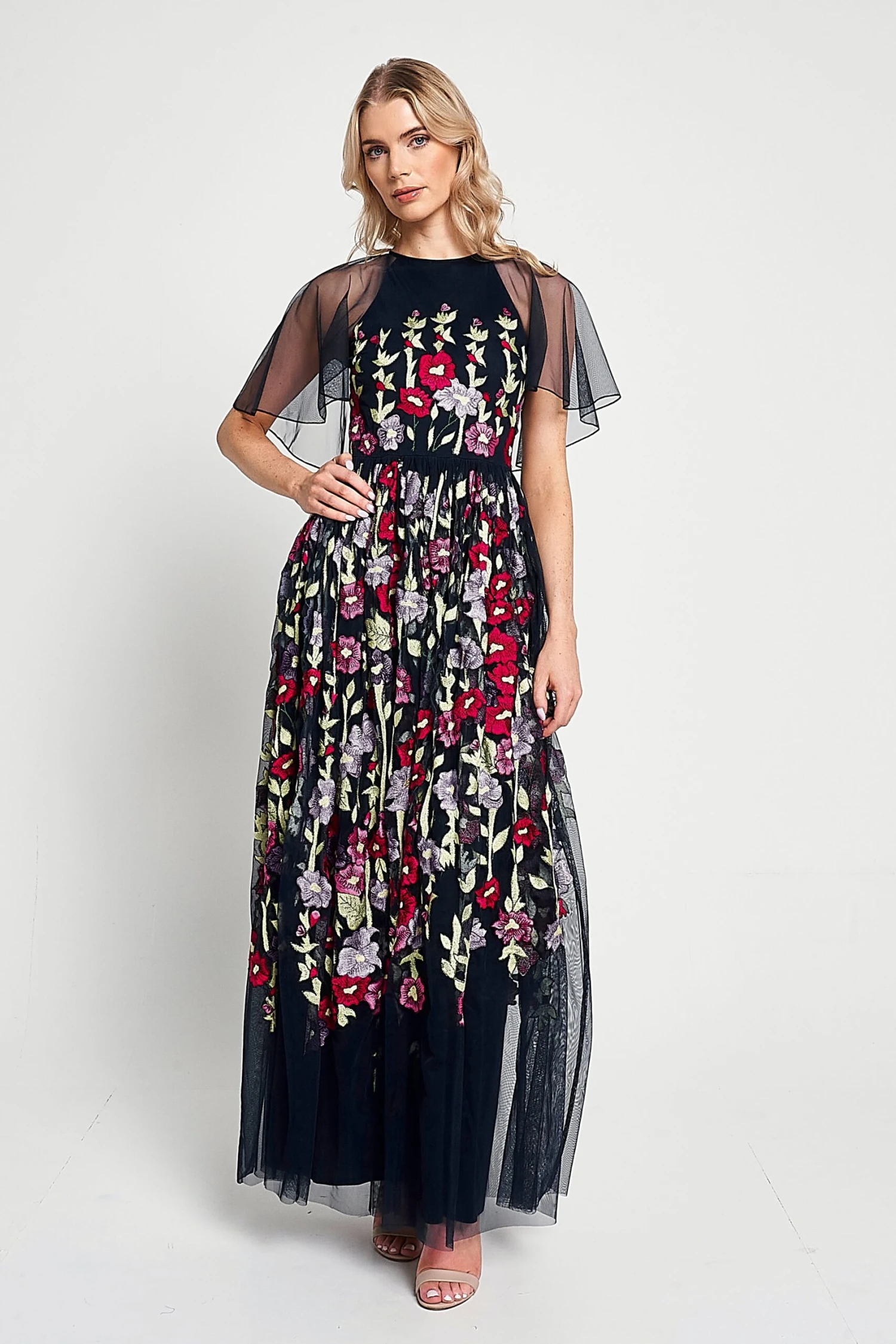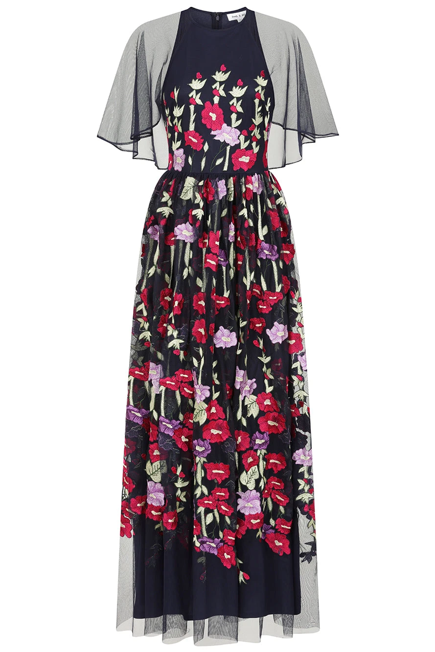 Blooming with floral embroidery, this charming navy maxi dress is designed with a fitted bodice and lightly voluminous full length skirt. Meadow is complete with sheer cape sleeves that drift across the shoulders.