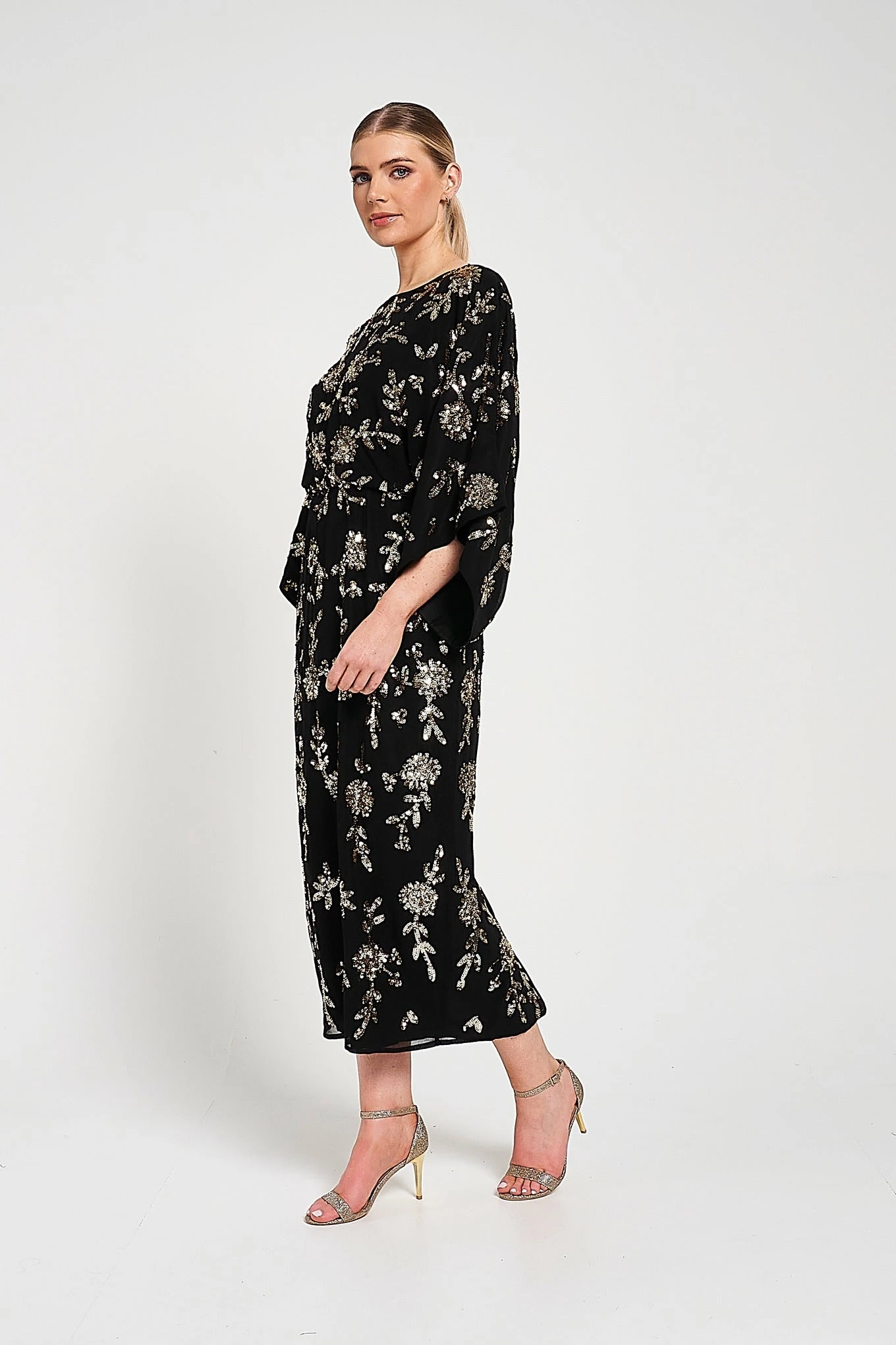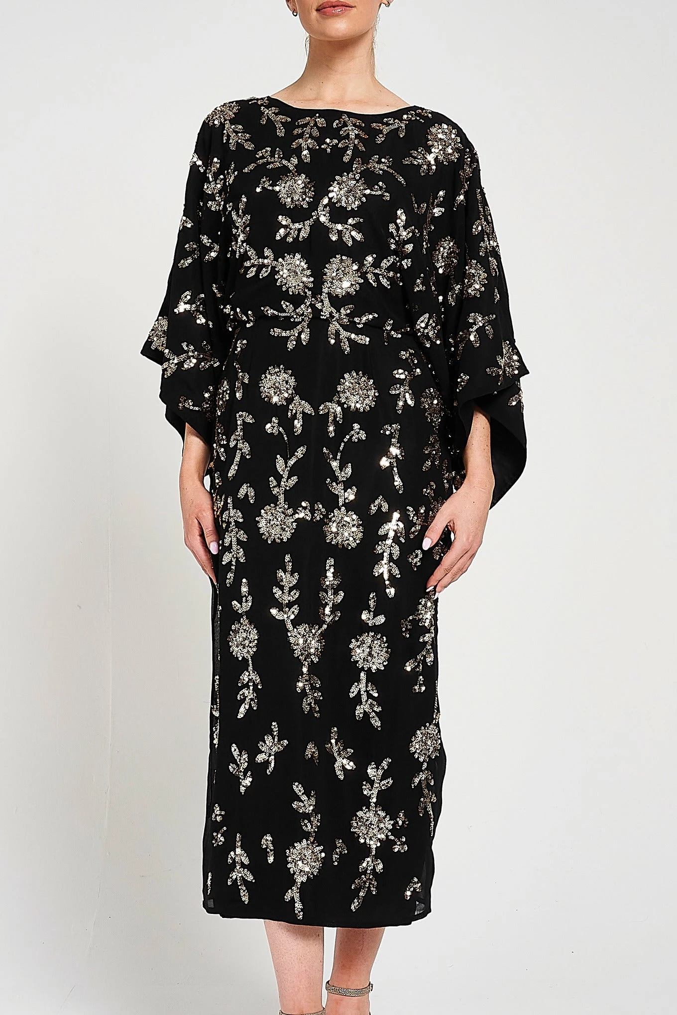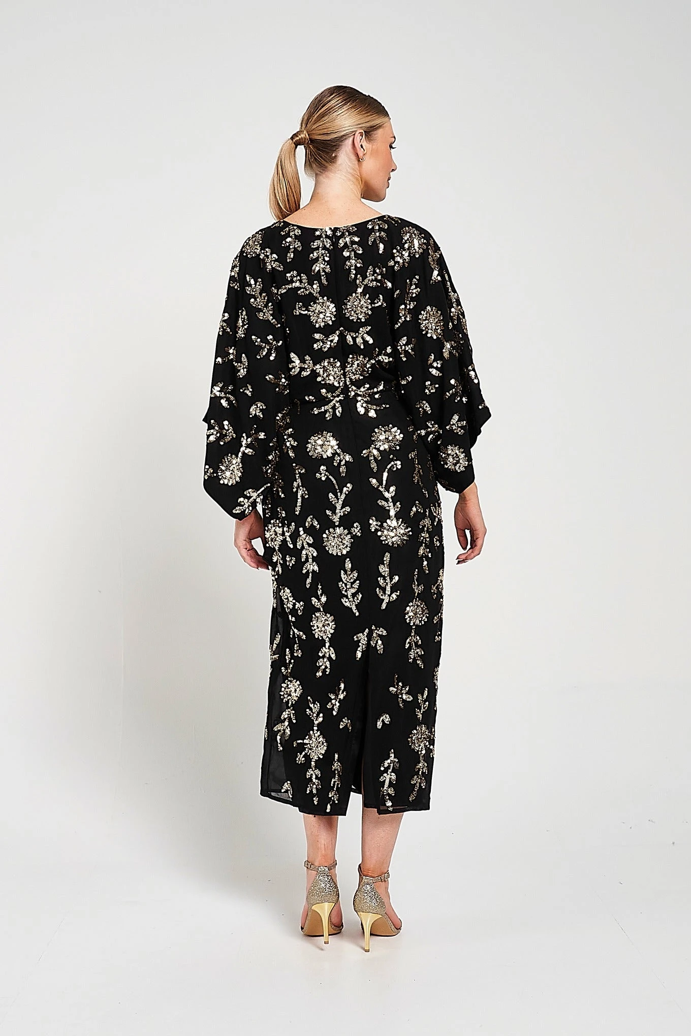 Introducing Melantha: A sparkling party dress in an effortless silhouette. Showcasing gold floral embellishment against a pitch black backdrop, this midaxi length dress is complete with voluminous batwing style sleeves.