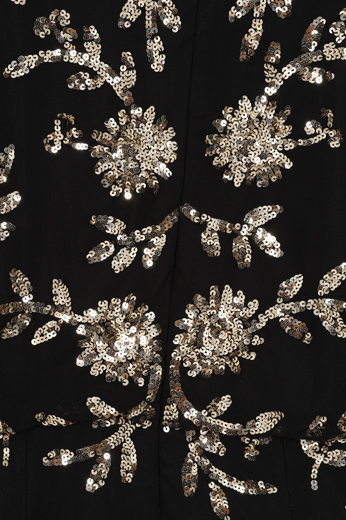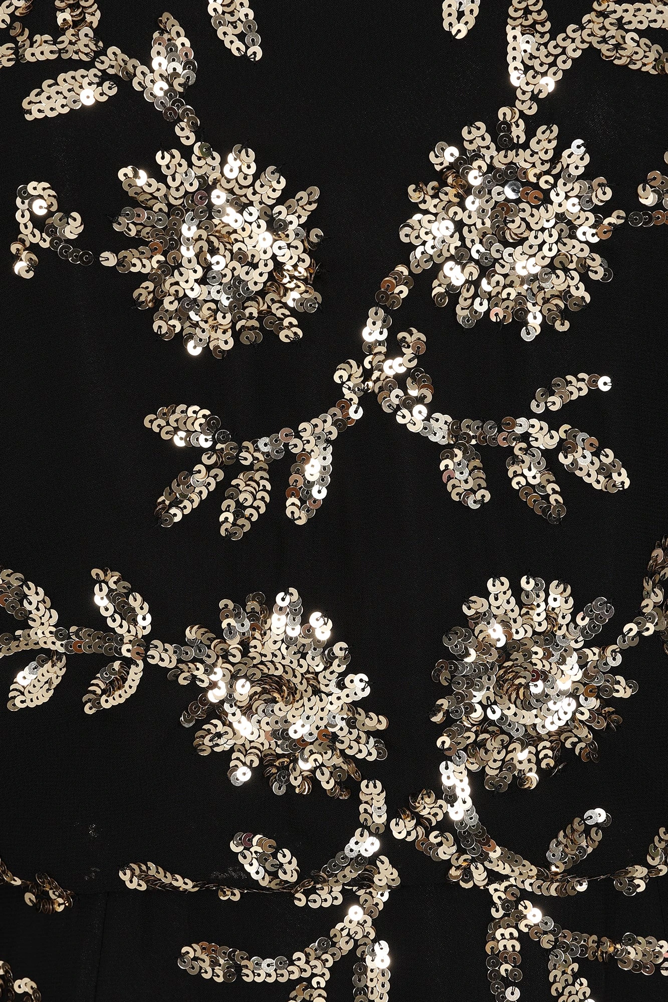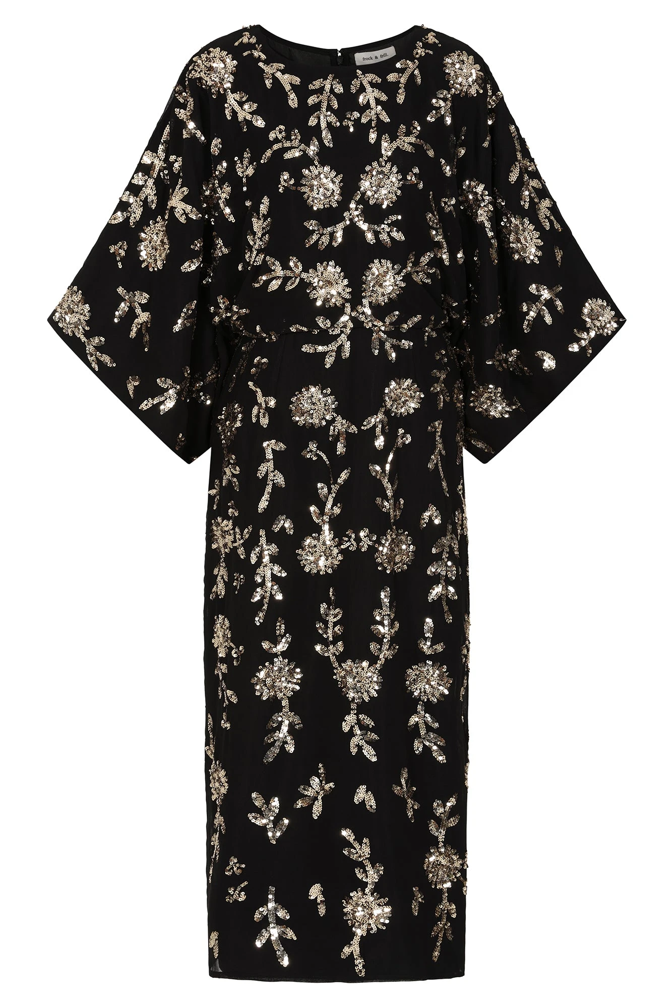 Introducing Melantha: A sparkling party dress in an effortless silhouette. Showcasing gold floral embellishment against a pitch black backdrop, this midaxi length dress is complete with voluminous batwing style sleeves.