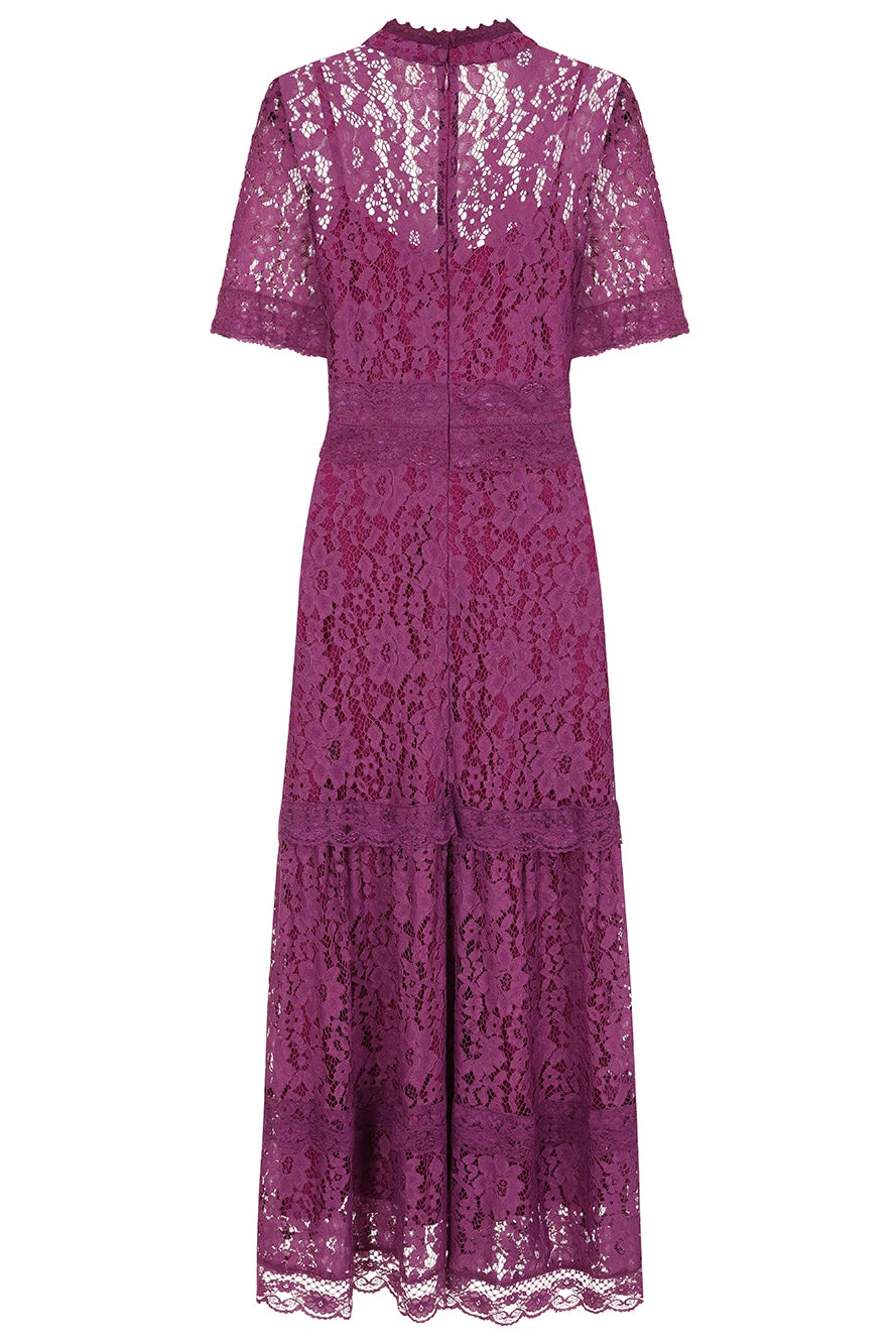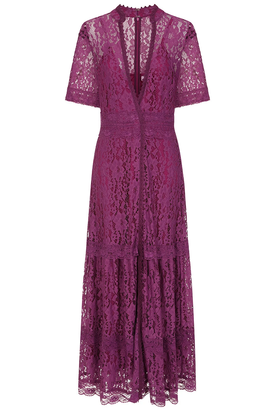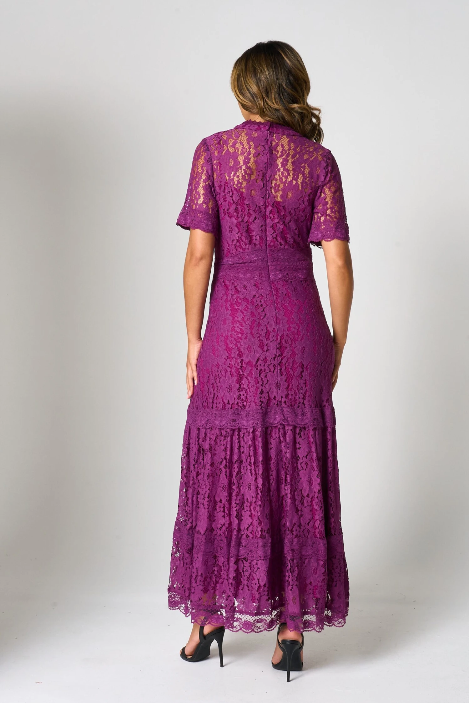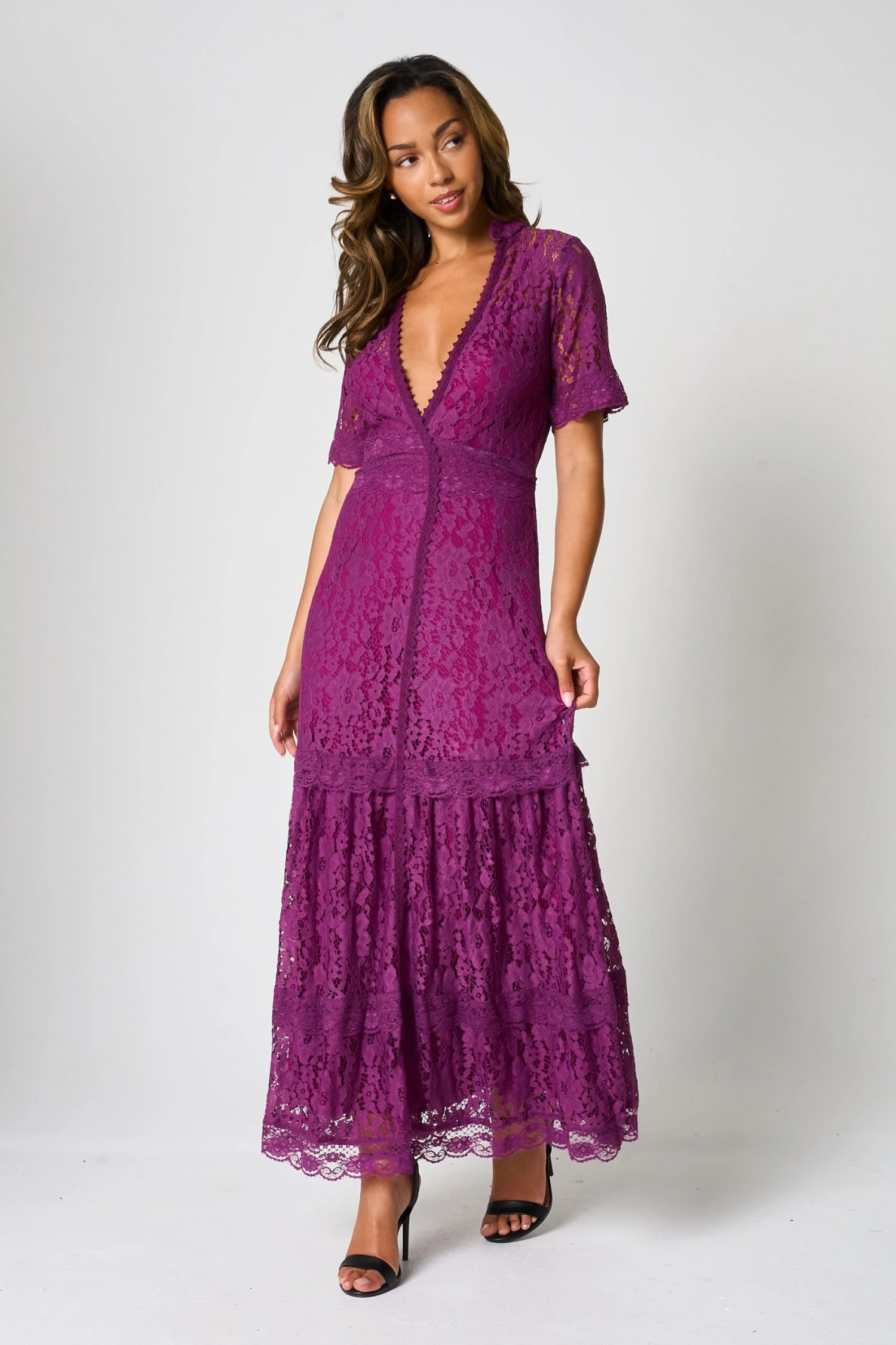 Turn heads in purple with Mila. Cut with a dramatic plunging v neckline, this long lace dress is complete with short sleeves and a full length slip-style lining. Pair Mila with a statement necklace for a classic special occasion outfit.