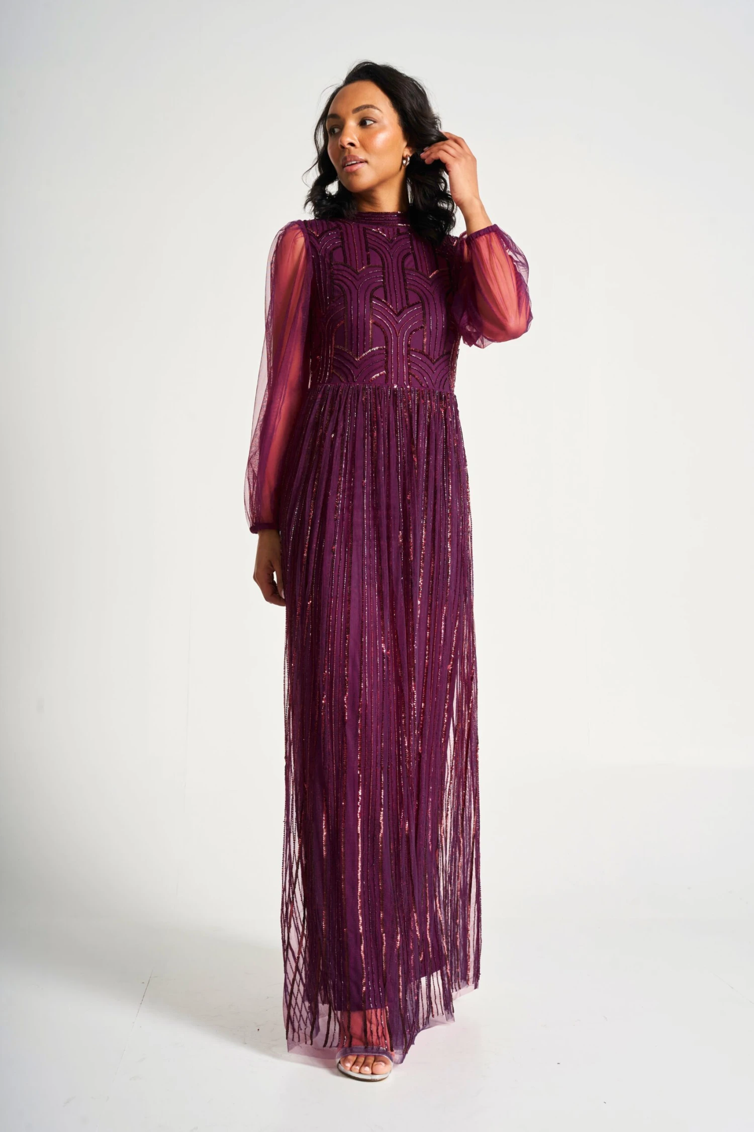 Elevate your party season style with Natalia. Realised in a deep berry hue, this floor skimming dress is embellished throughout with tonal beadwork in a vintage inspired motif. Natalia is complete with sheer full length sleeves.