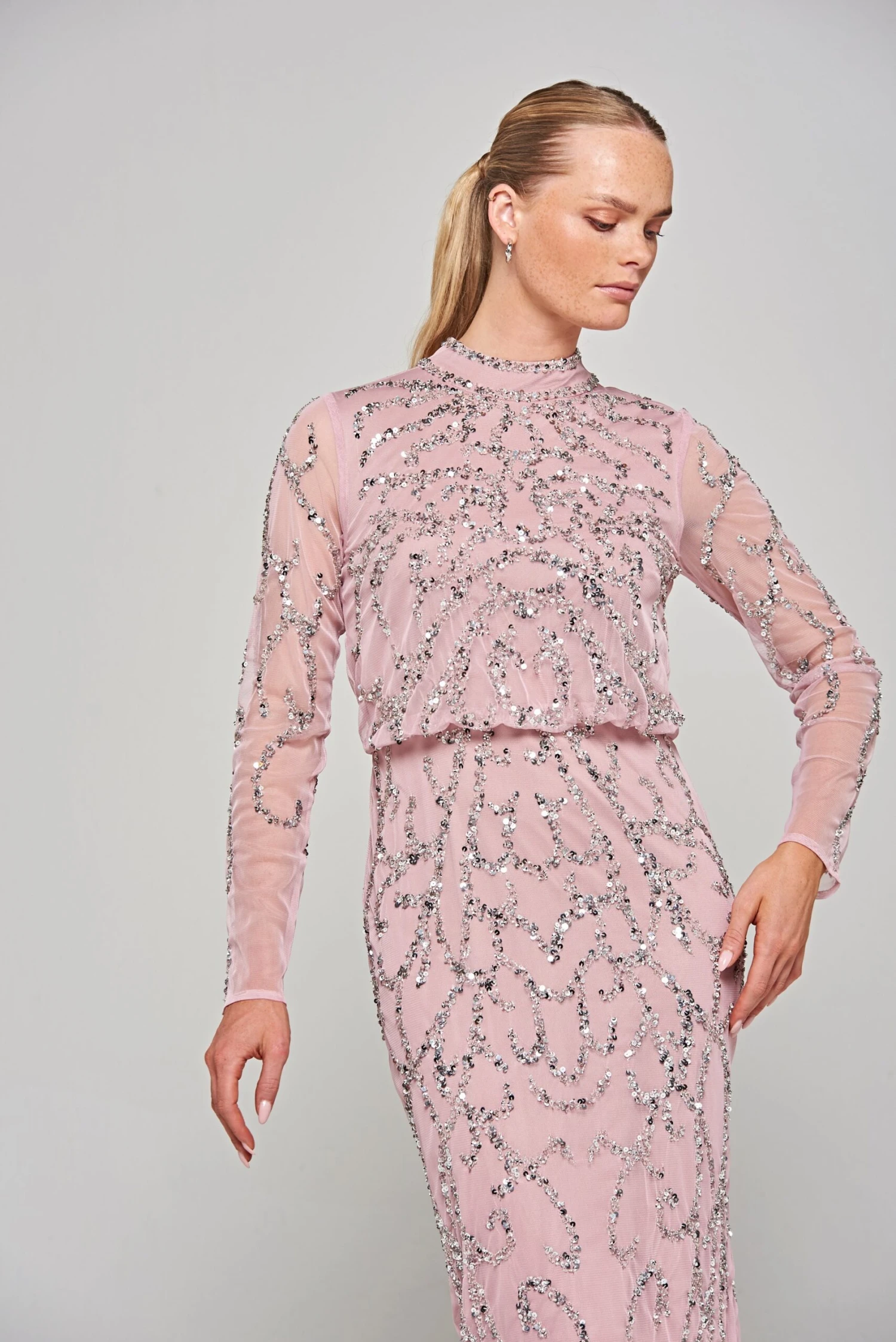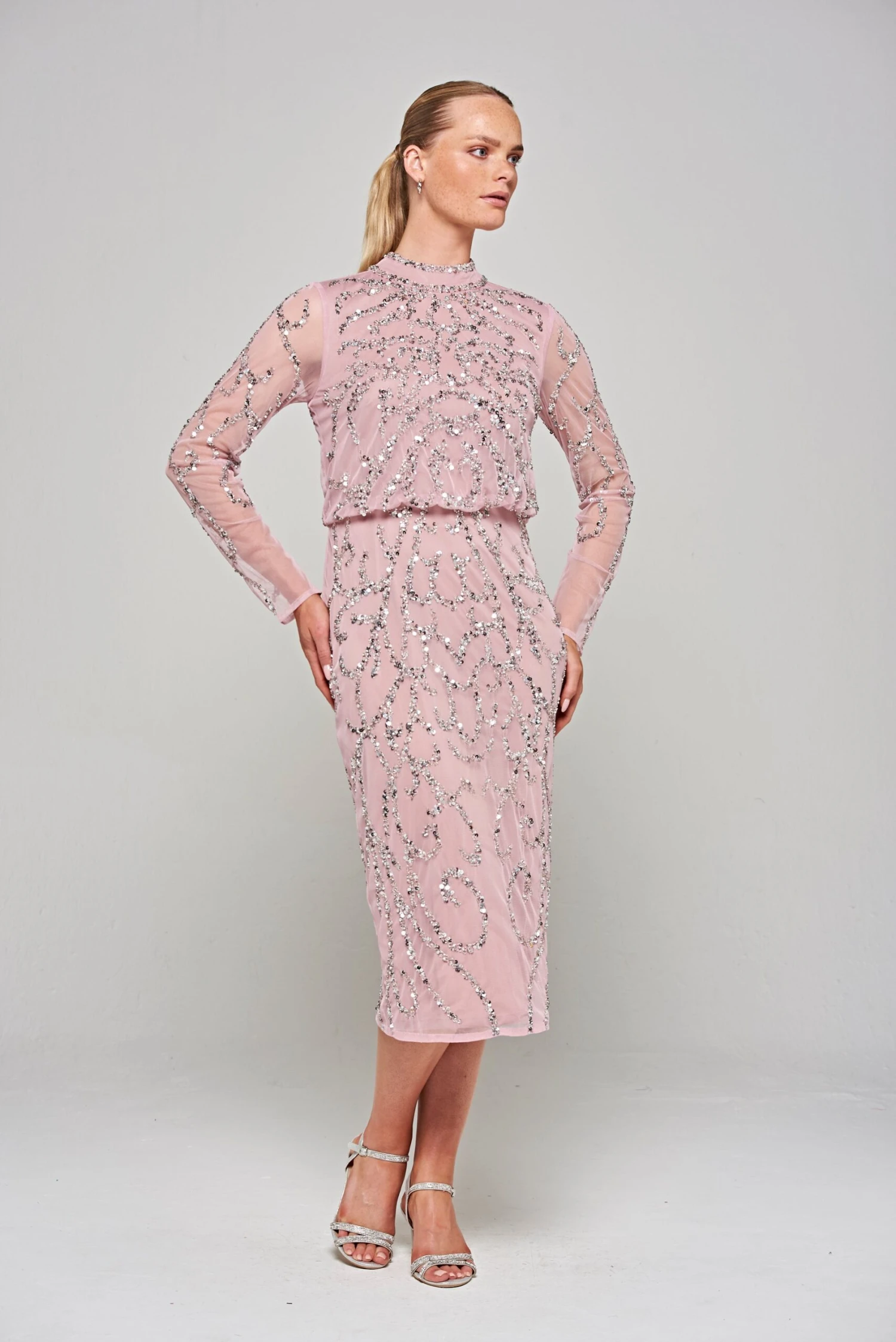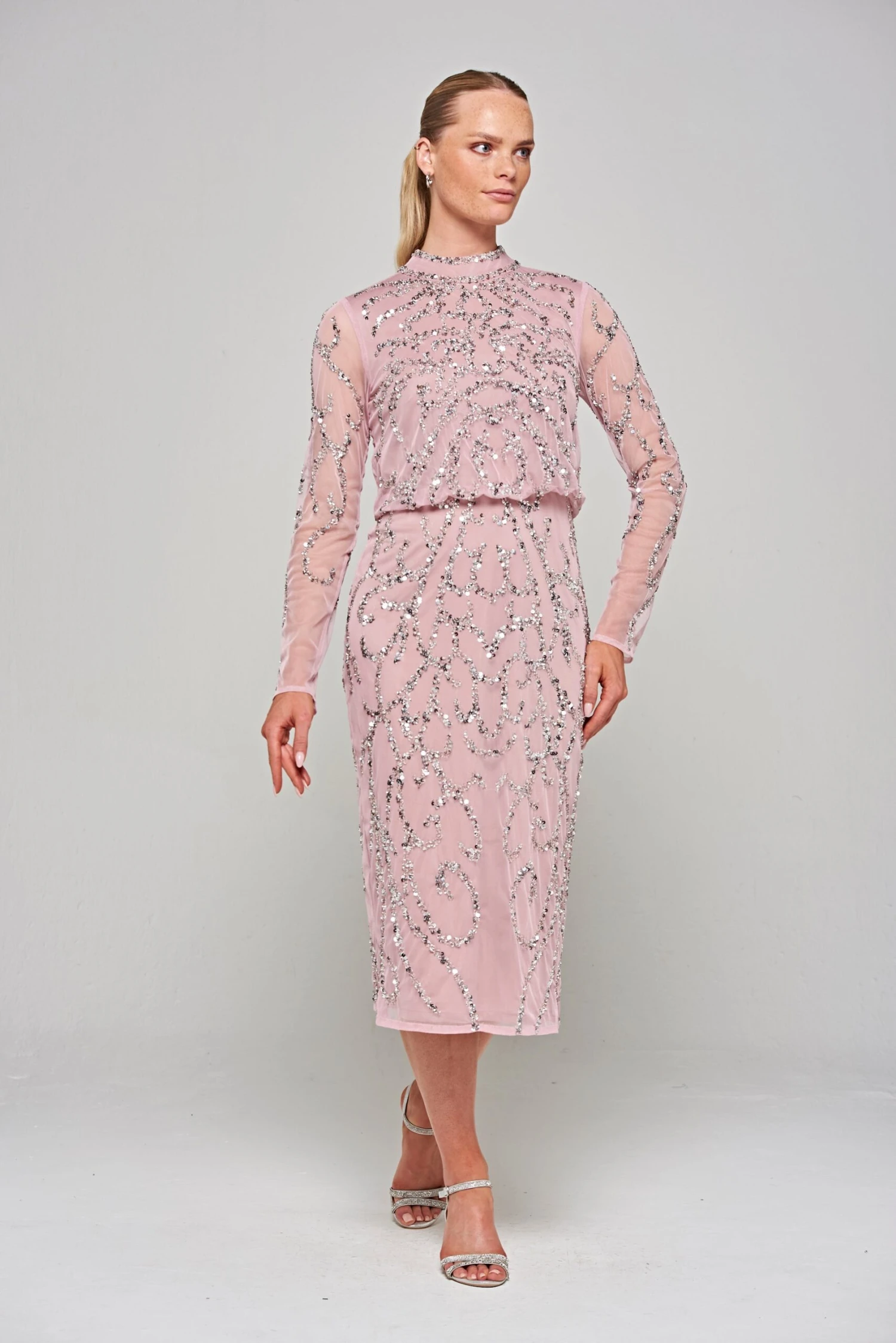 Embrace effortless elegance in our Nicola midi dress. Realised in a dusky lilac hue, this figure skimming style is designed with full length sleeves and a pencil style skirt. Complete with abstract swirls of silver sequin embellishment, this sophisticated midi will ensure that all eyes are on you!