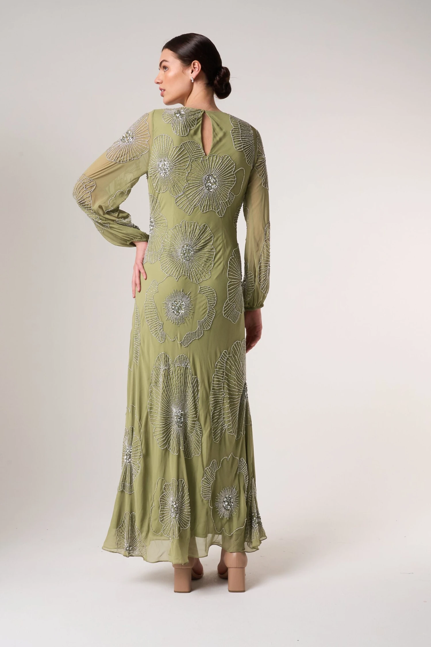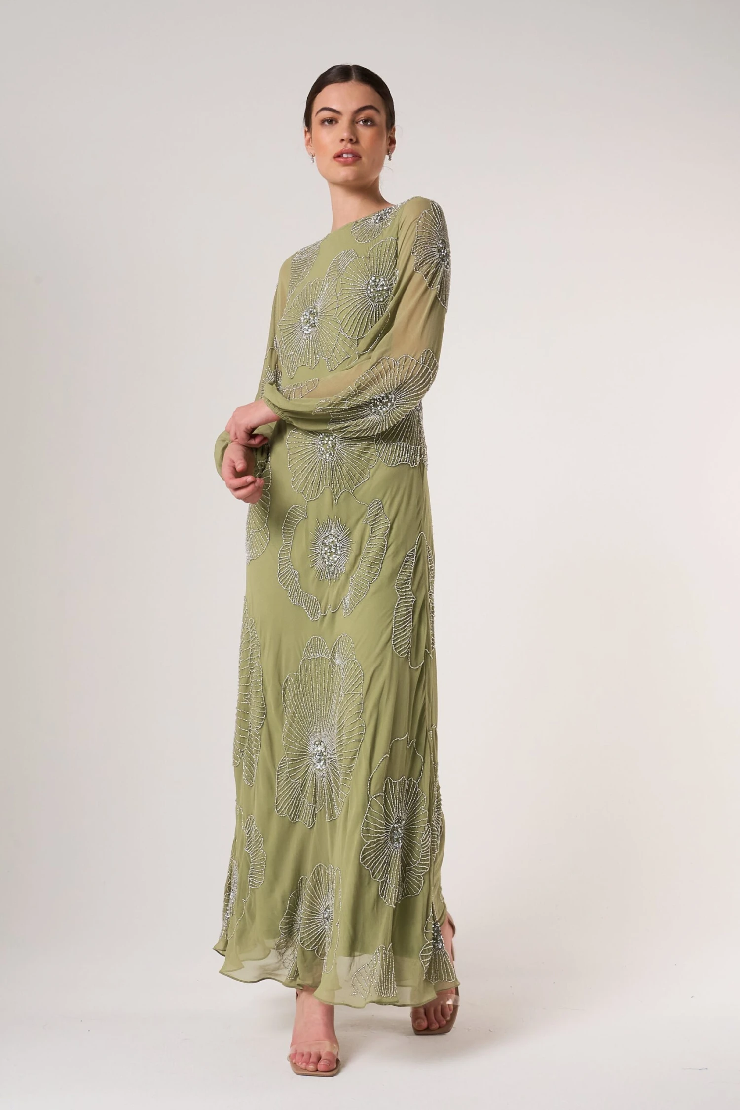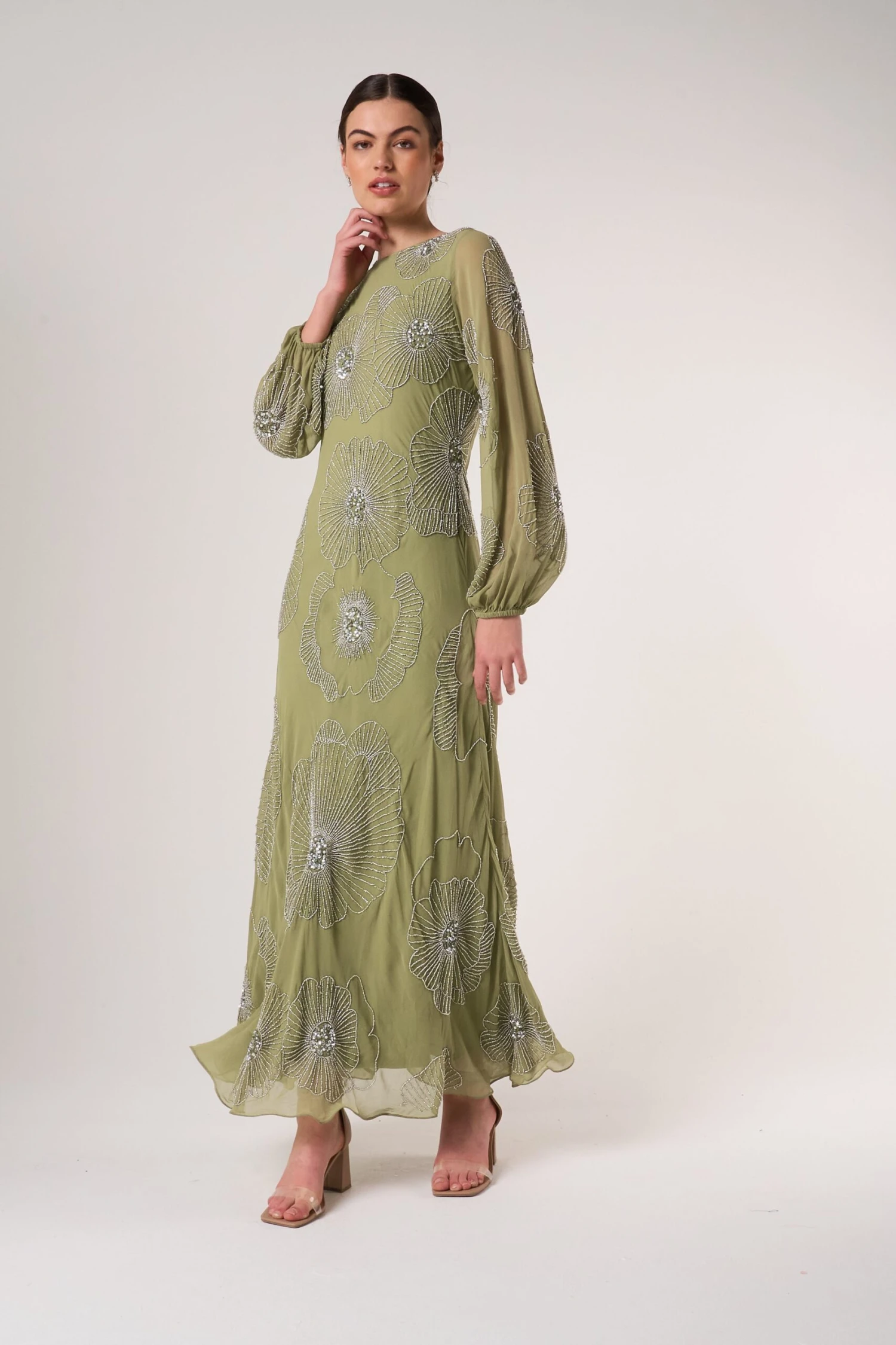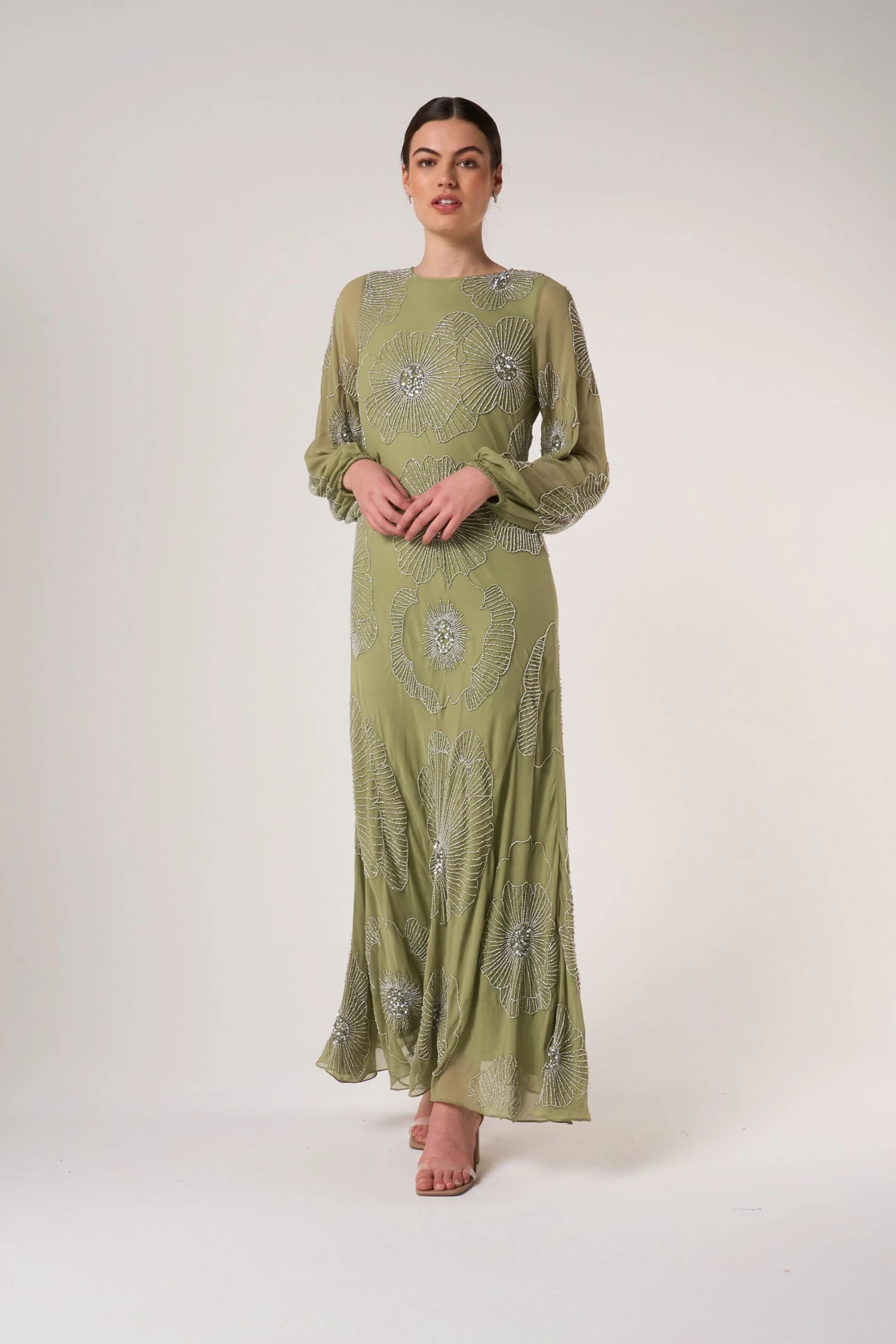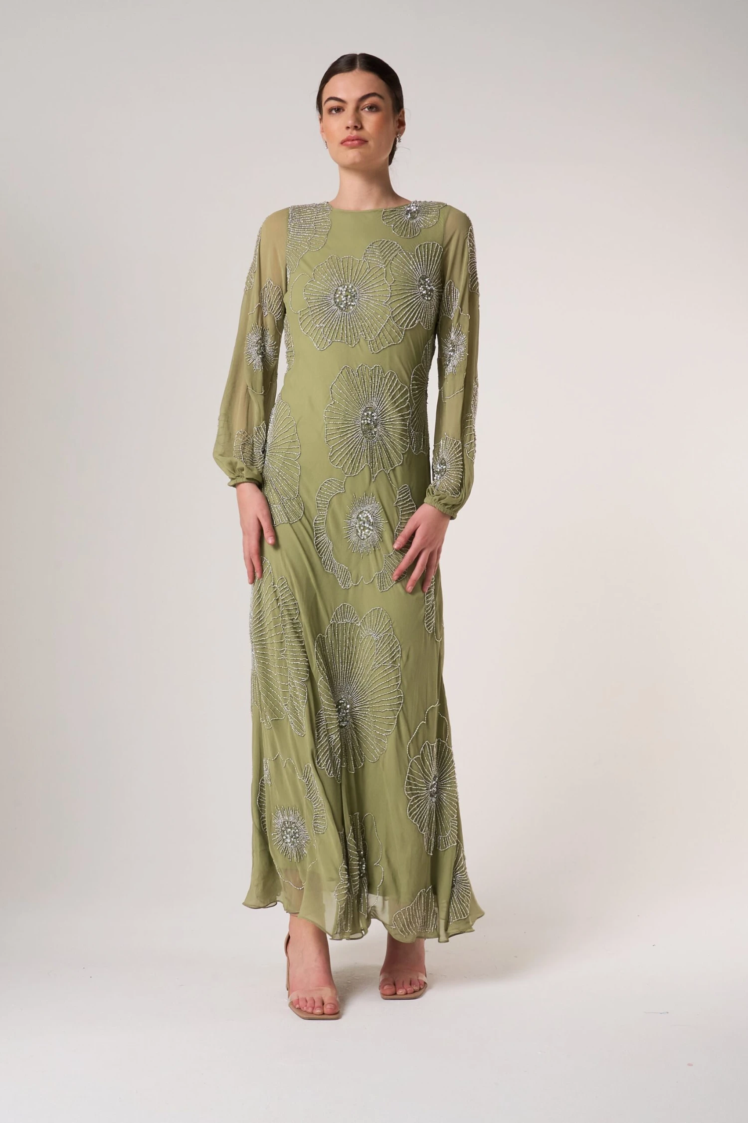 Embody effortless elegance this spring with Phoebe. Realised in a serene sage green, this long sleeved maxi dress is detailed with silver embellishment in a minimalist floral pattern. Style with silver heels and statement earrings for an instant wedding guest outfit.