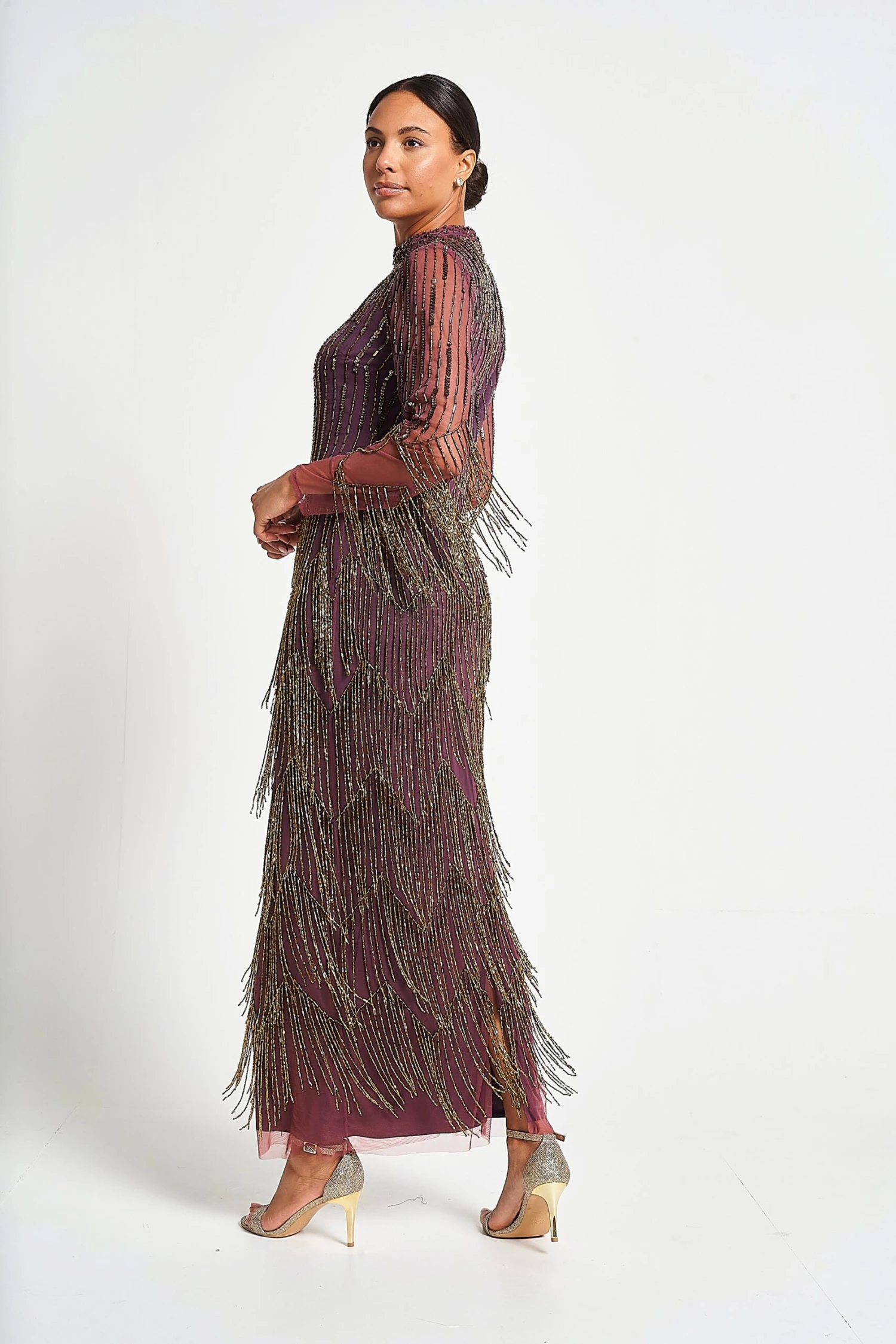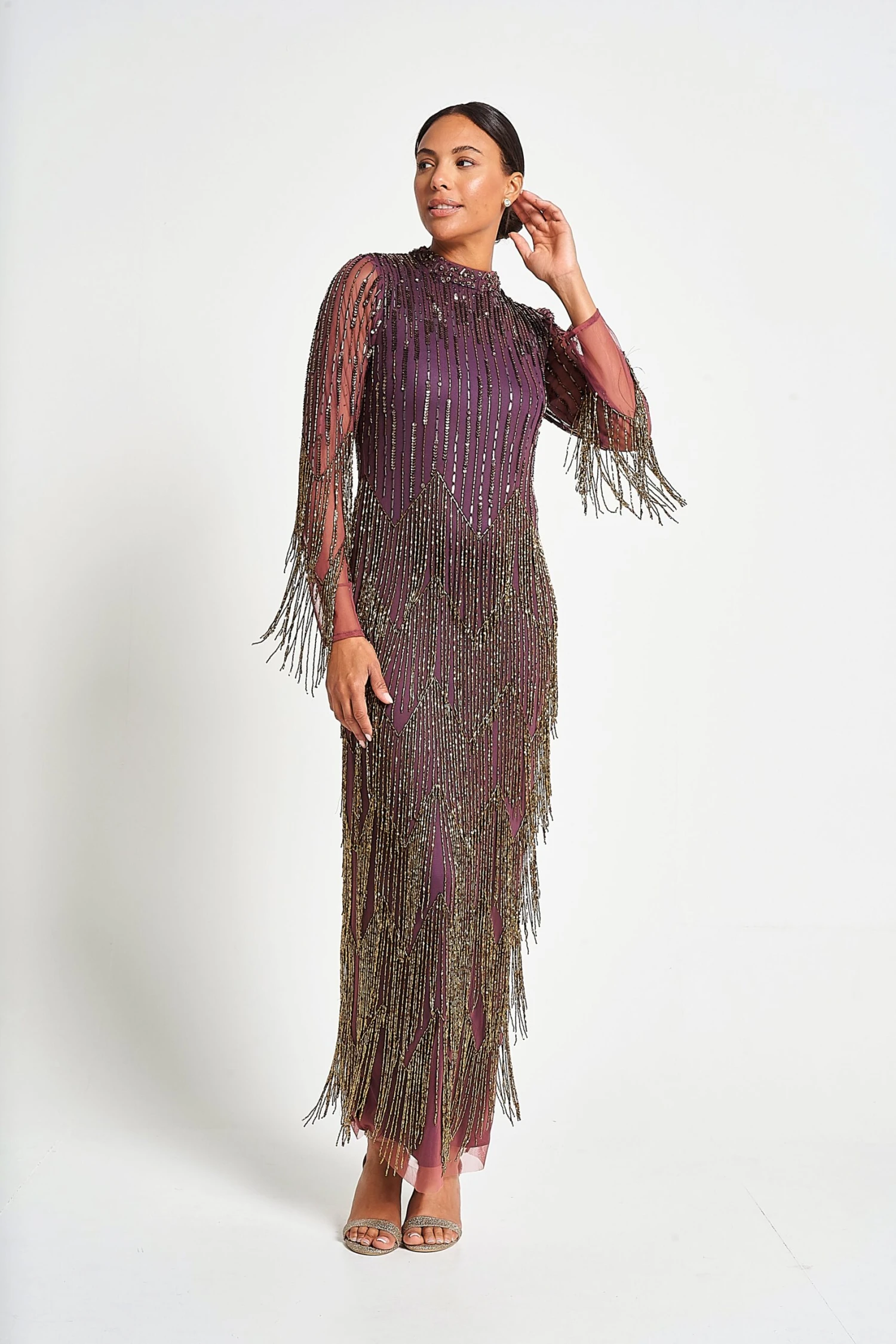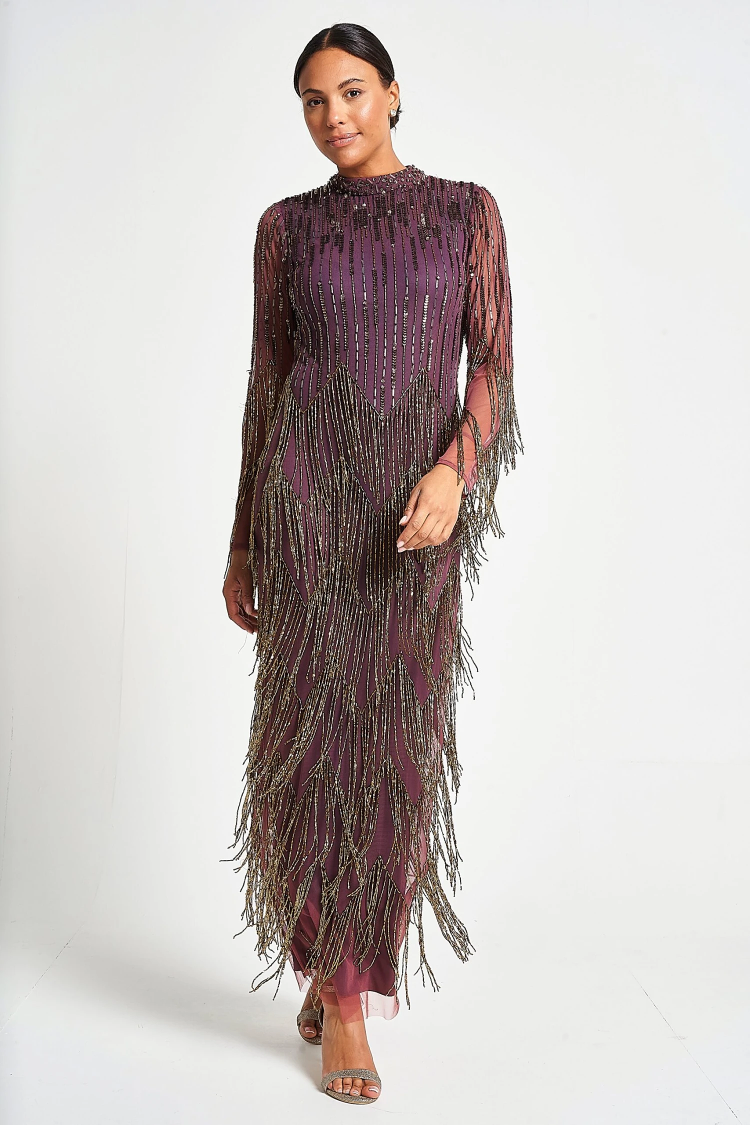 Guarantee dramatic entrances every time with Rhoda! Deep purple in hue, this long sleeved maxi dress showcases intricate embellishment that flows into tiers of twirl-worthy beaded fringing.