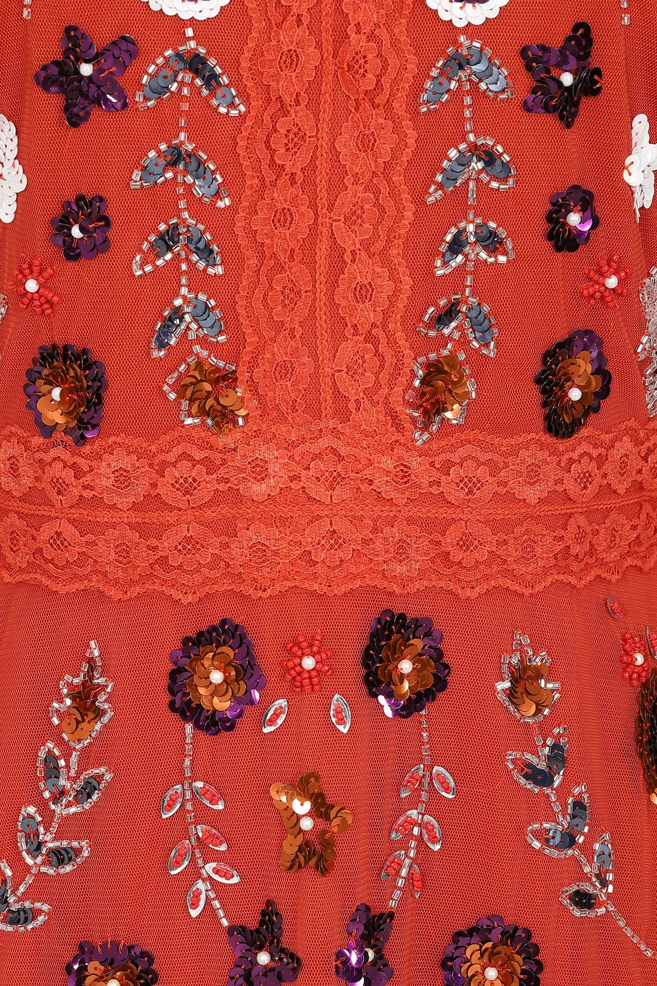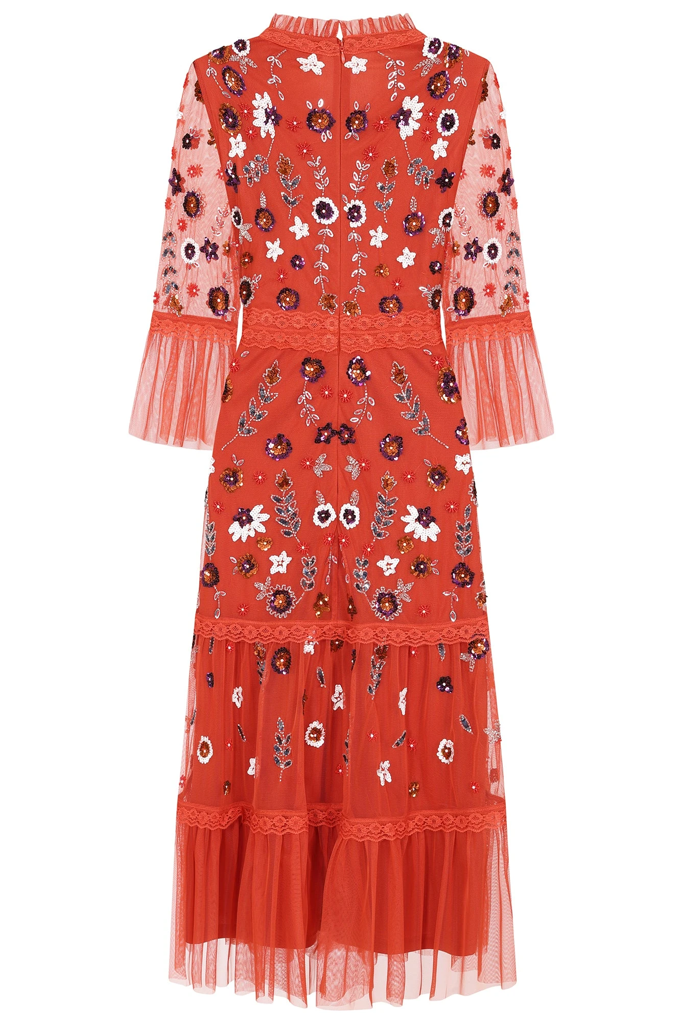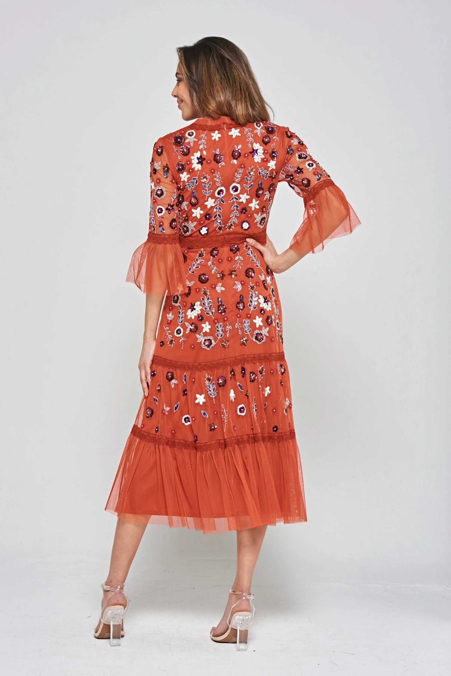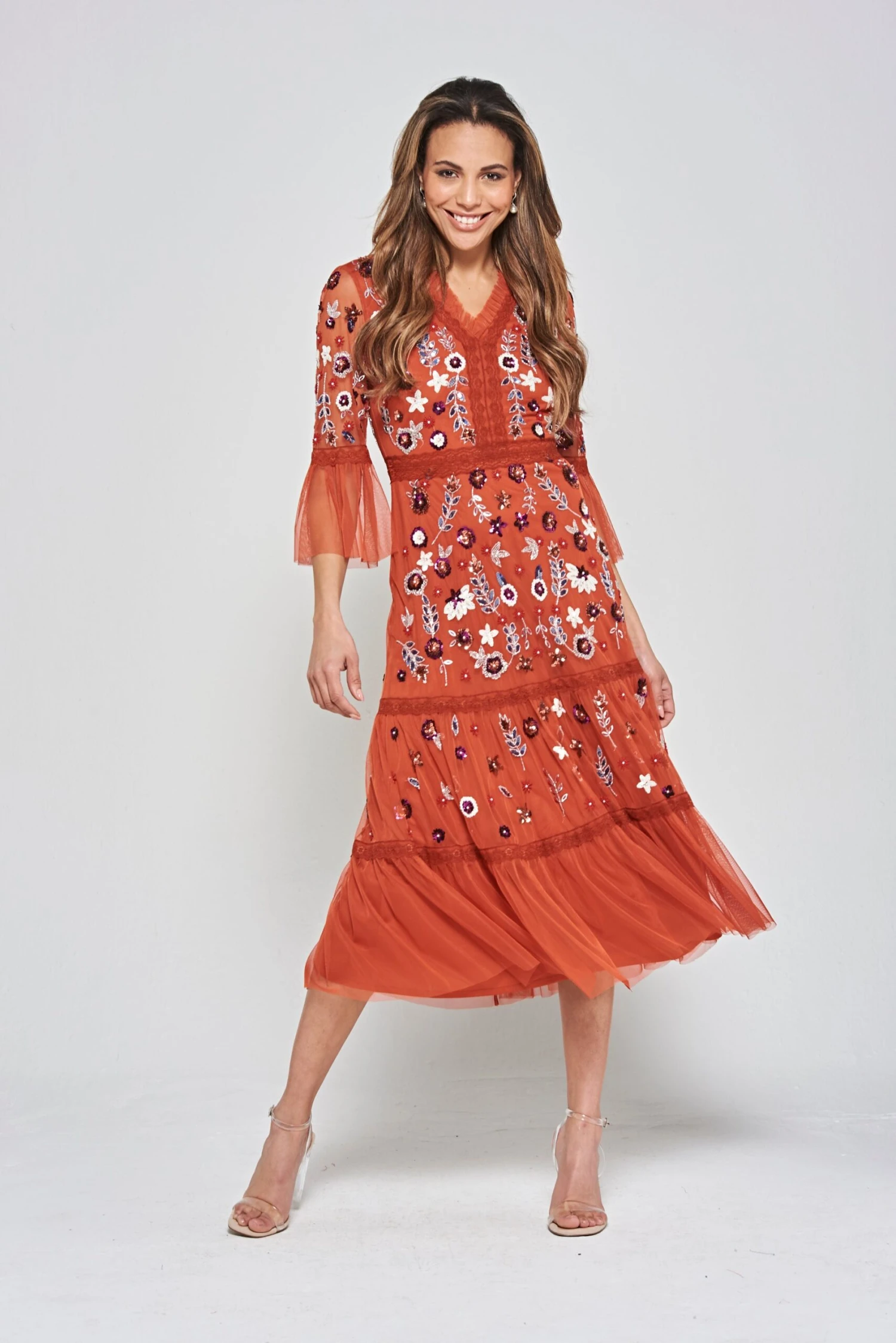 In an Autumn-ready copper hue, our Ria midi dress is brimming with ornate sequin and bead embellishment, configured in a floral motif. Designed with a tiered skirt that guarantees a swing in every step, Ria is complete with 3/4 length sleeves and crochet trim throughout.