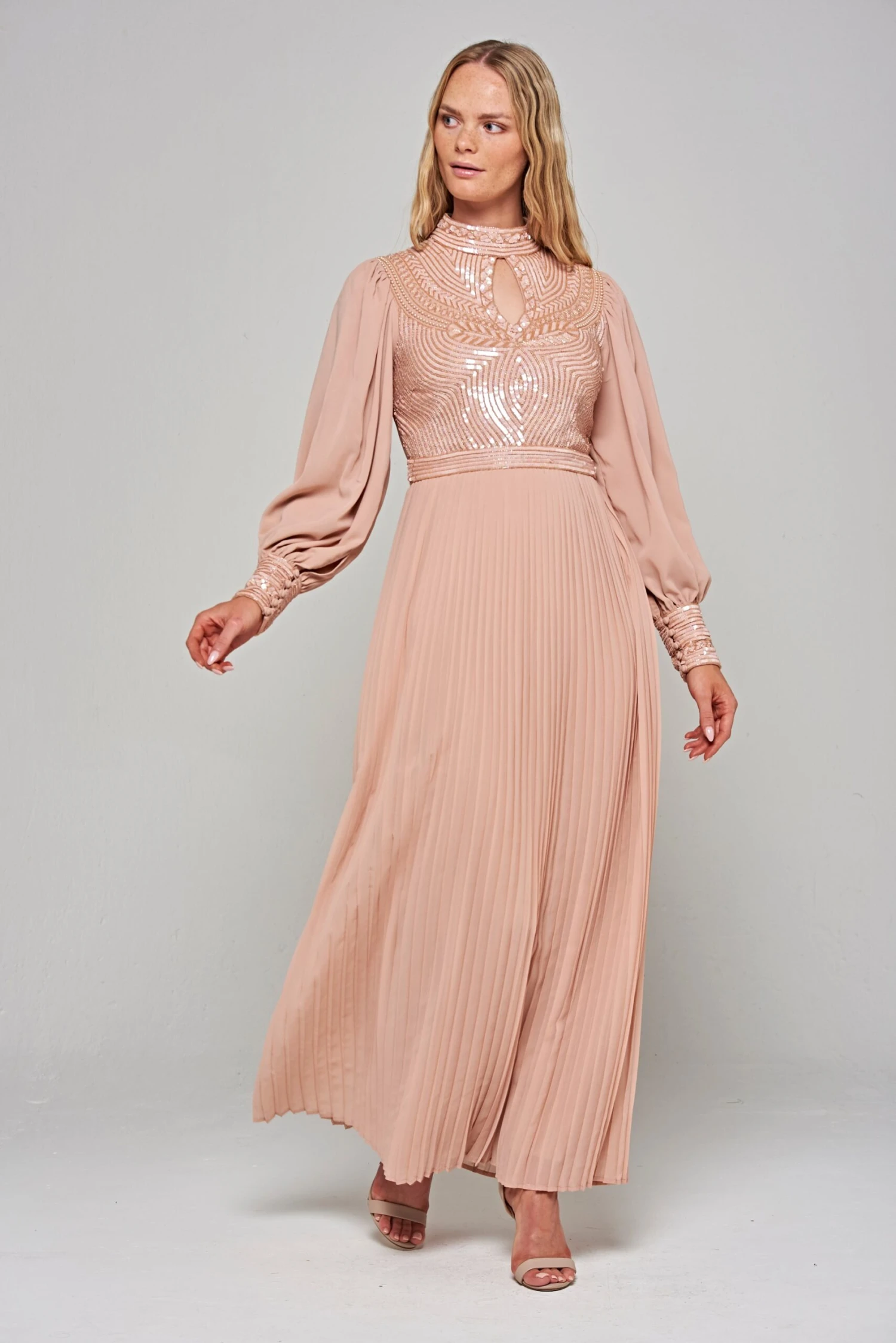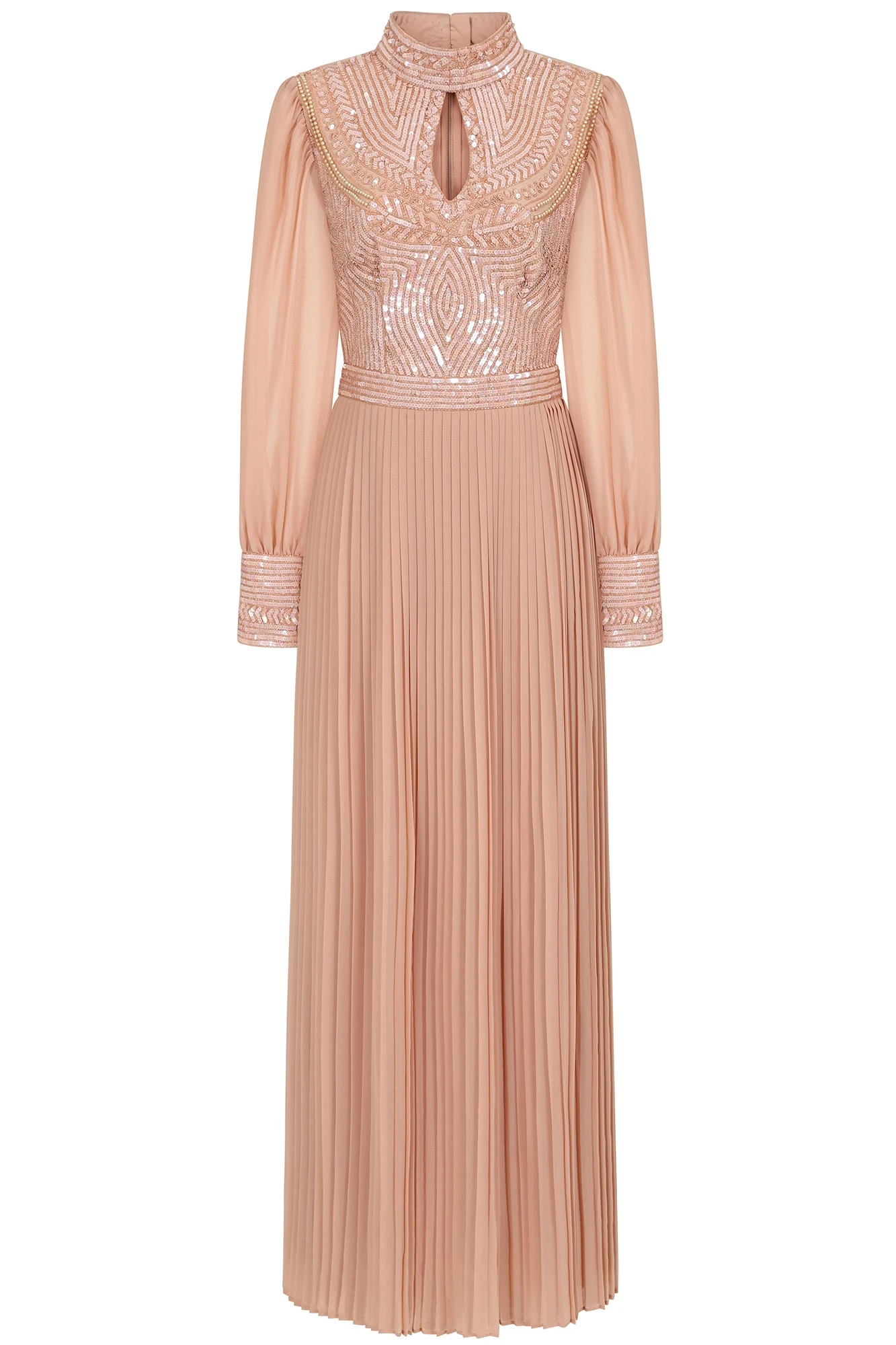 Realised in a dusty blush hue, the long and flowing Rosa exudes a modern elegance. Designed with full length sleeves and a high neckline, this floor skimming style is complete with a pleated skirt, tonal sequin detailing and a keyhole cut out at the neckline.