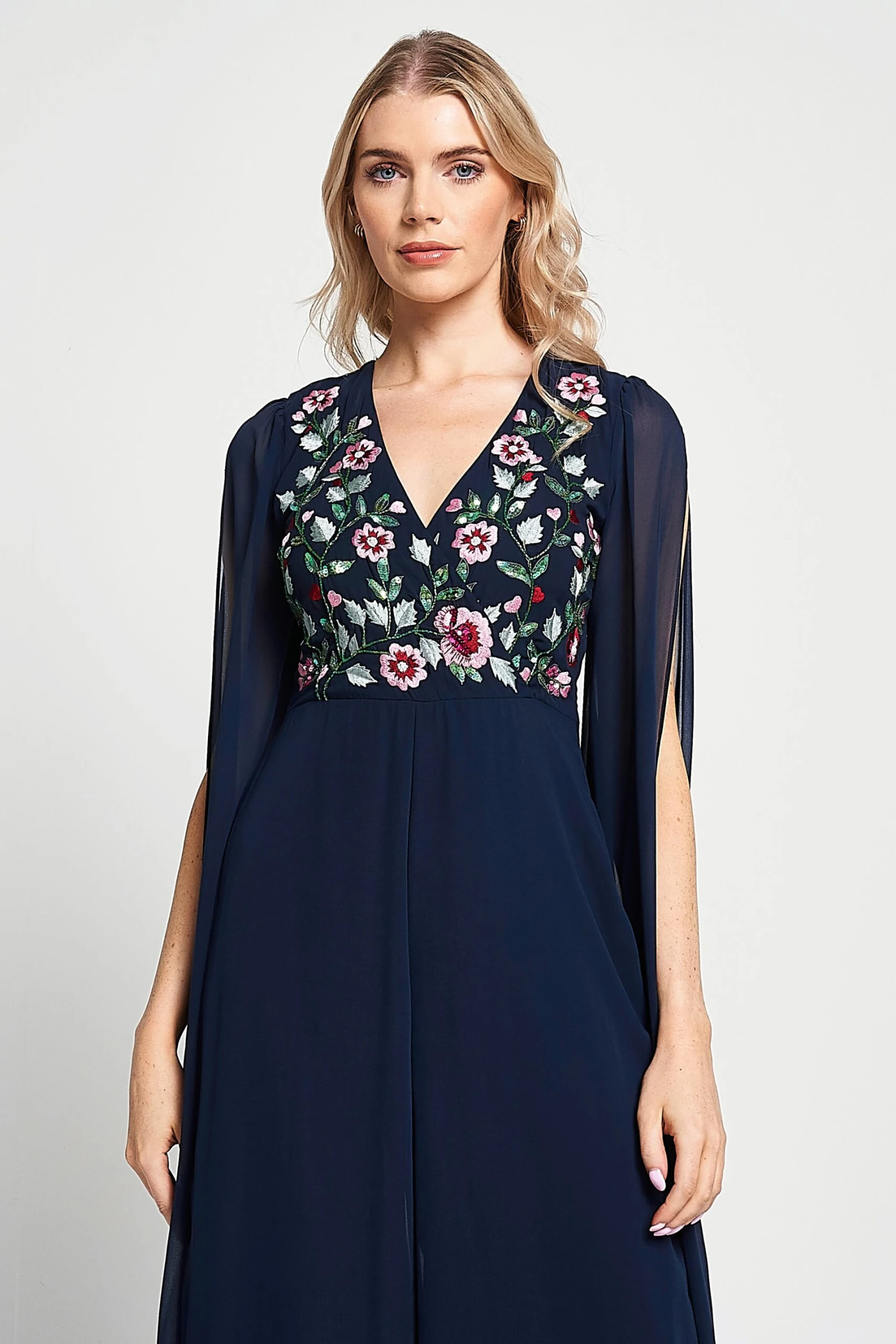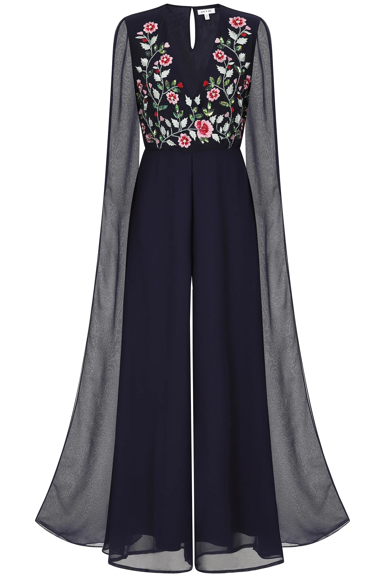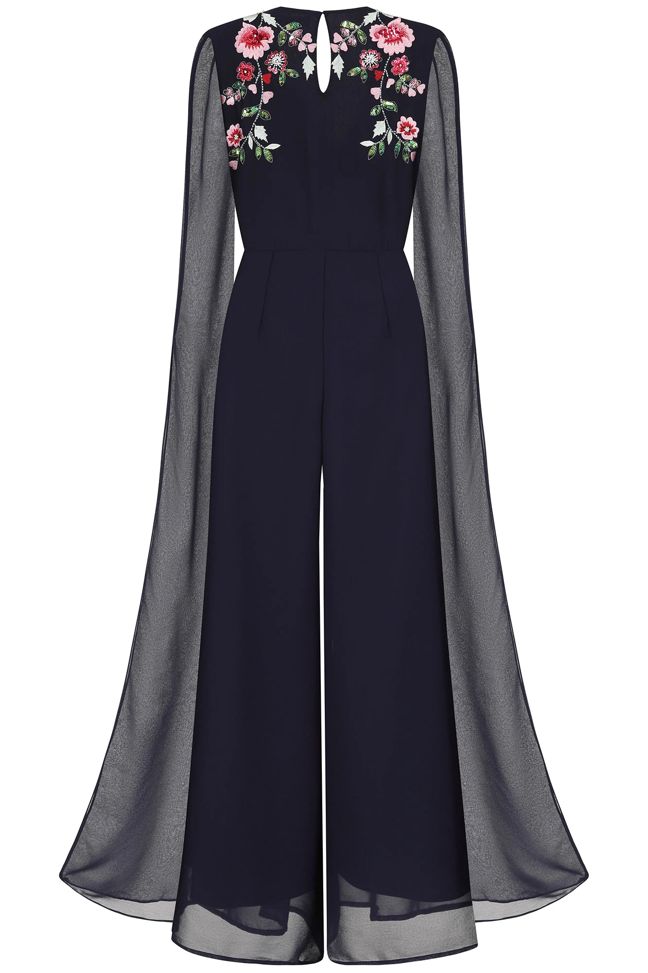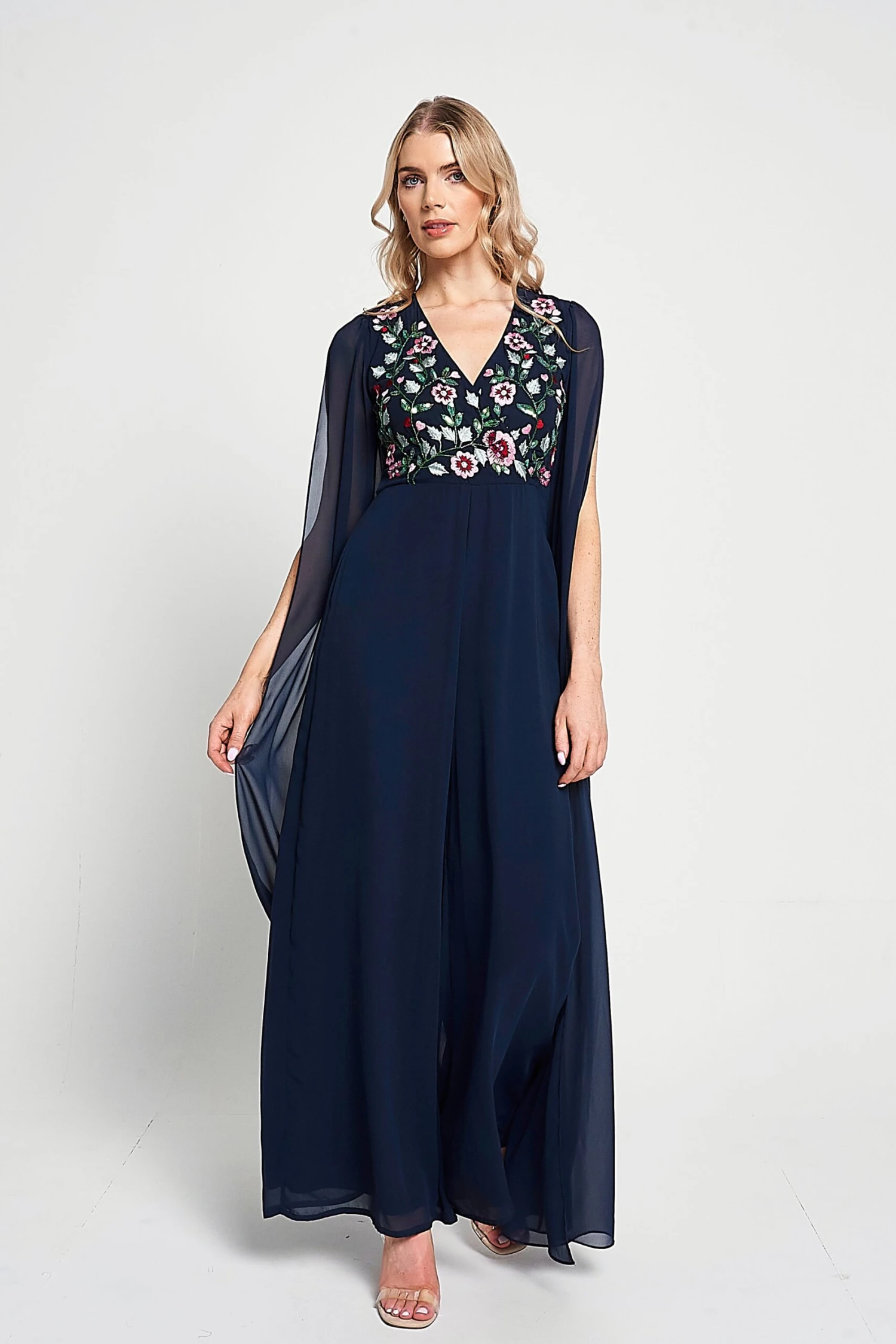 Sweep elegantly into any special occasion with the flowing, full length Rue jumpsuit. Pairing a fitted, v neckline bodice with gently flaring trousers, this deep navy piece is complete with dramatic cape sleeves and a garland of pretty floral embroidery.