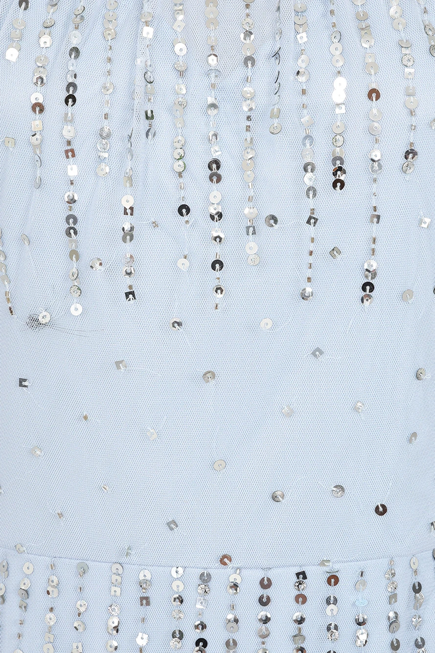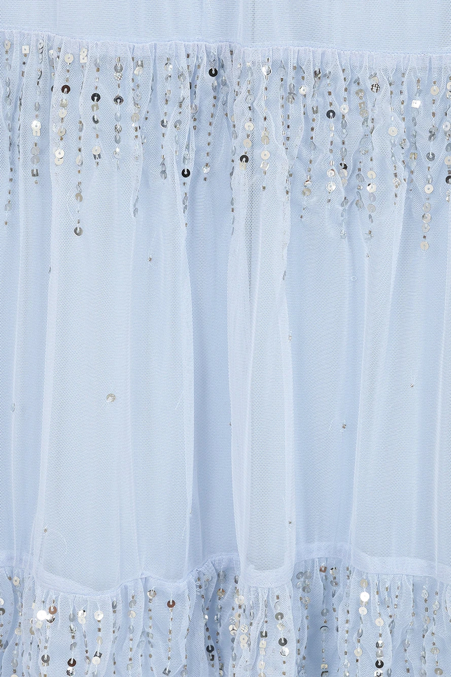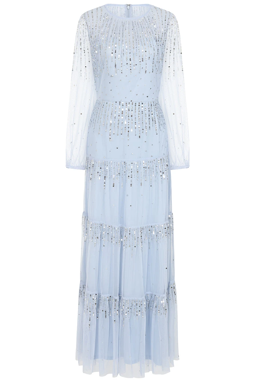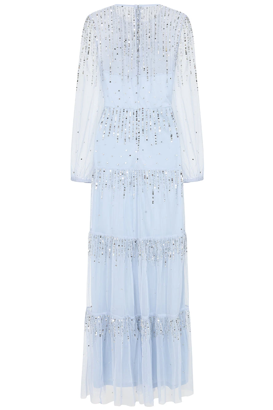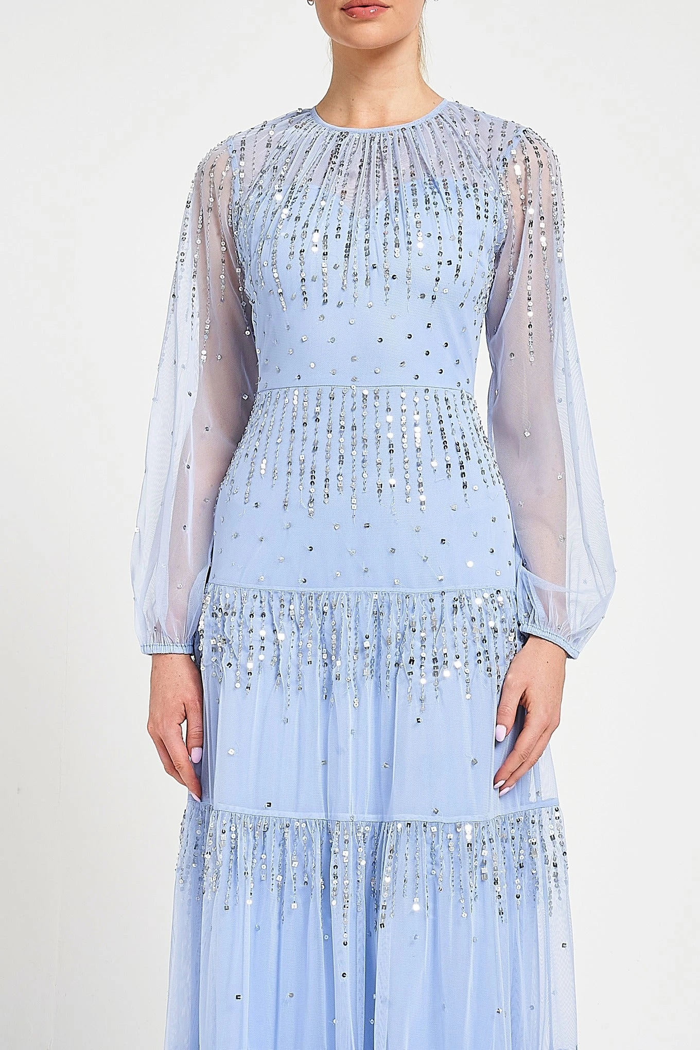 Introducing Sara: A daydream in cosmic sky blue. Dusted with silver sequins, this tiered maxi dress is complete with lightly voluminous, full length sleeves. Style with silver accessories for an instant special occasion outfit.