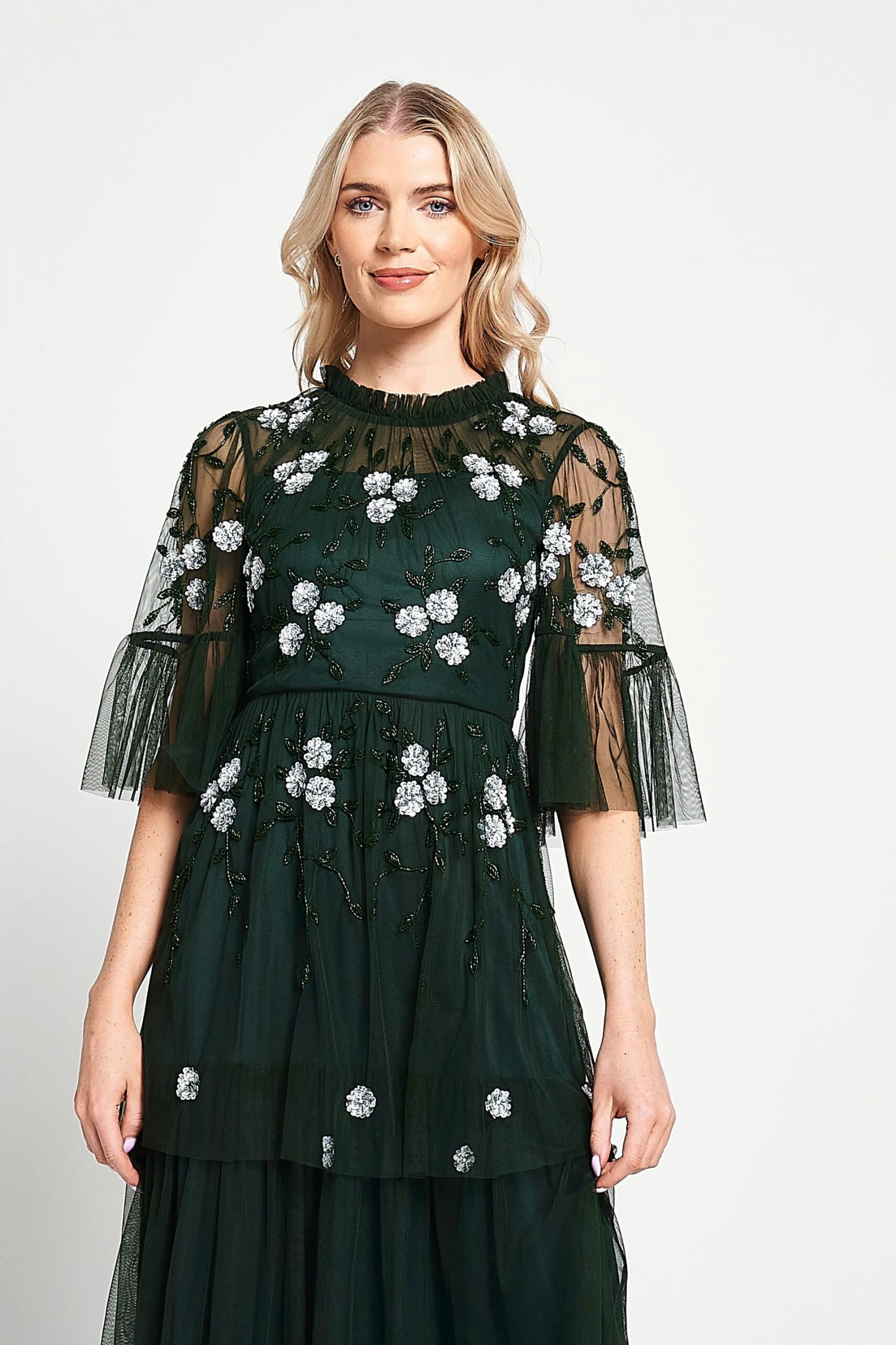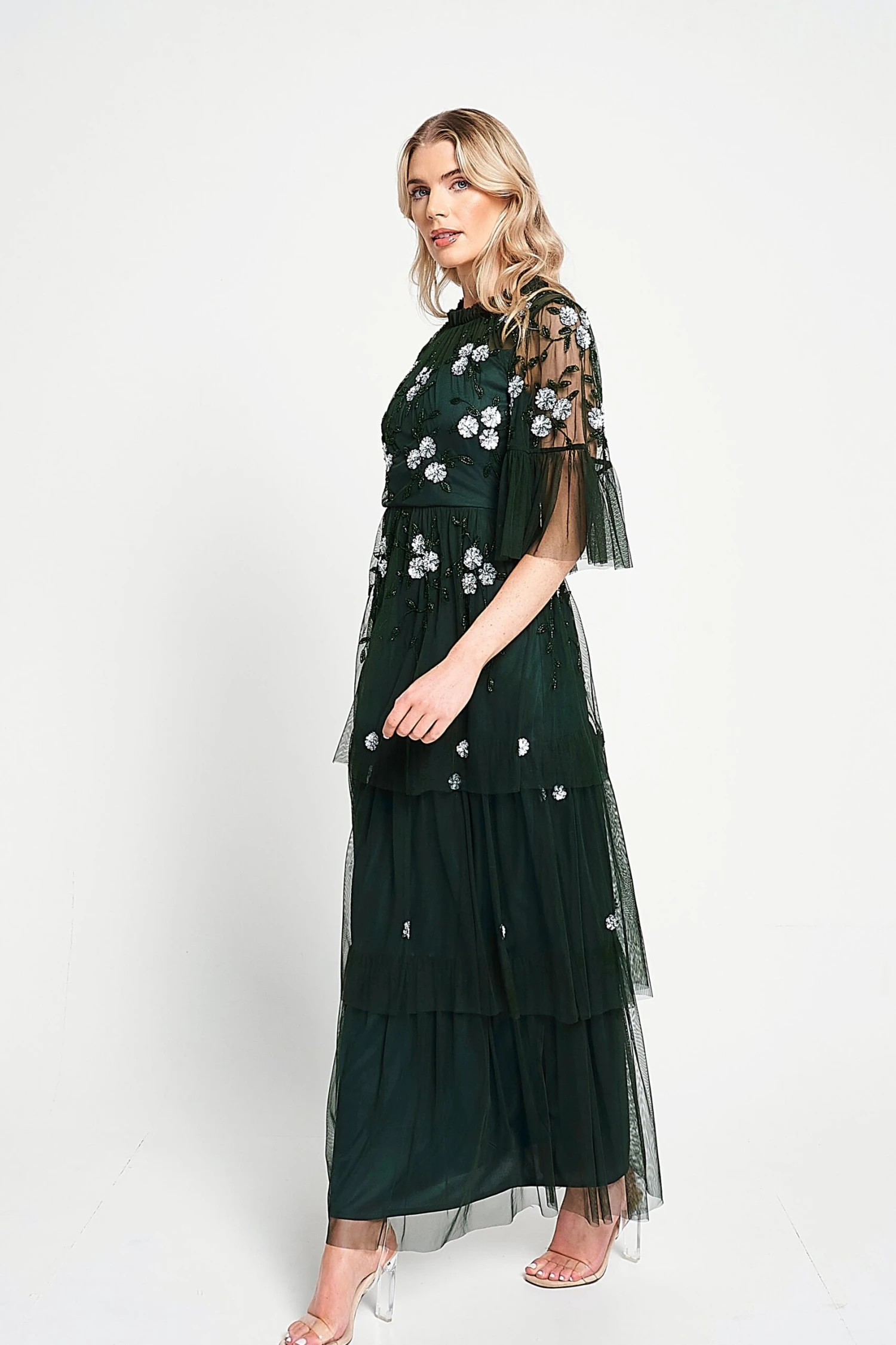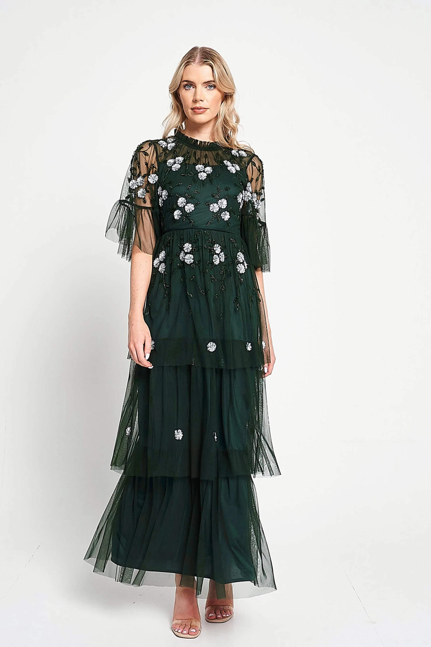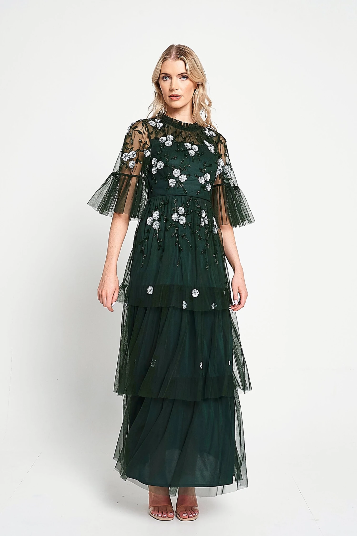 Deep forest green in hue, our elegant Suki maxi dress is exquisitely detailed throughout. Designed with a tiered skirt to create a swish in every step, this volume is mirrored in gently flaring elbow-length sleeves. Shimmering green and white embellishment, arranged in a floral motif, complete the piece.