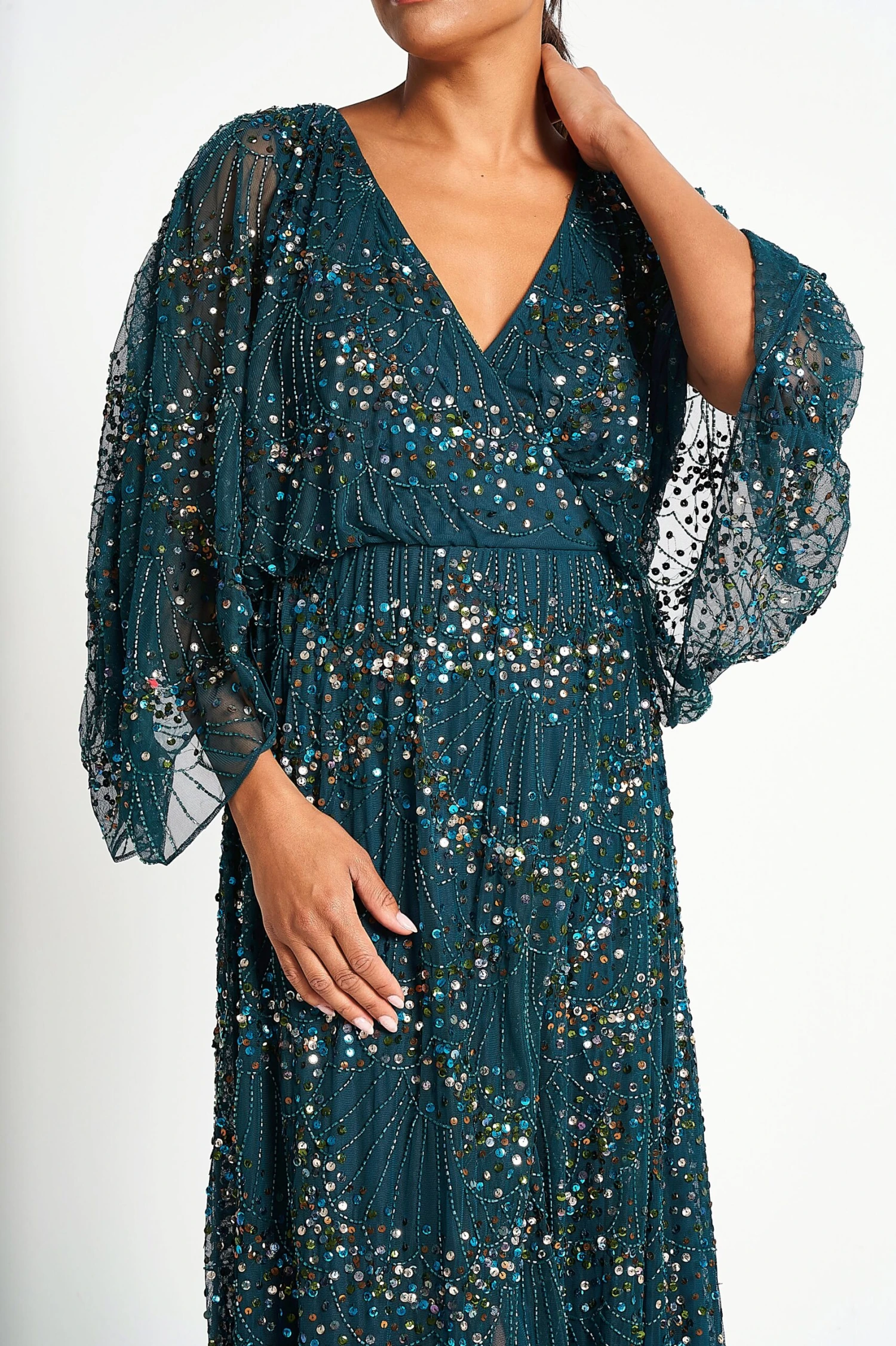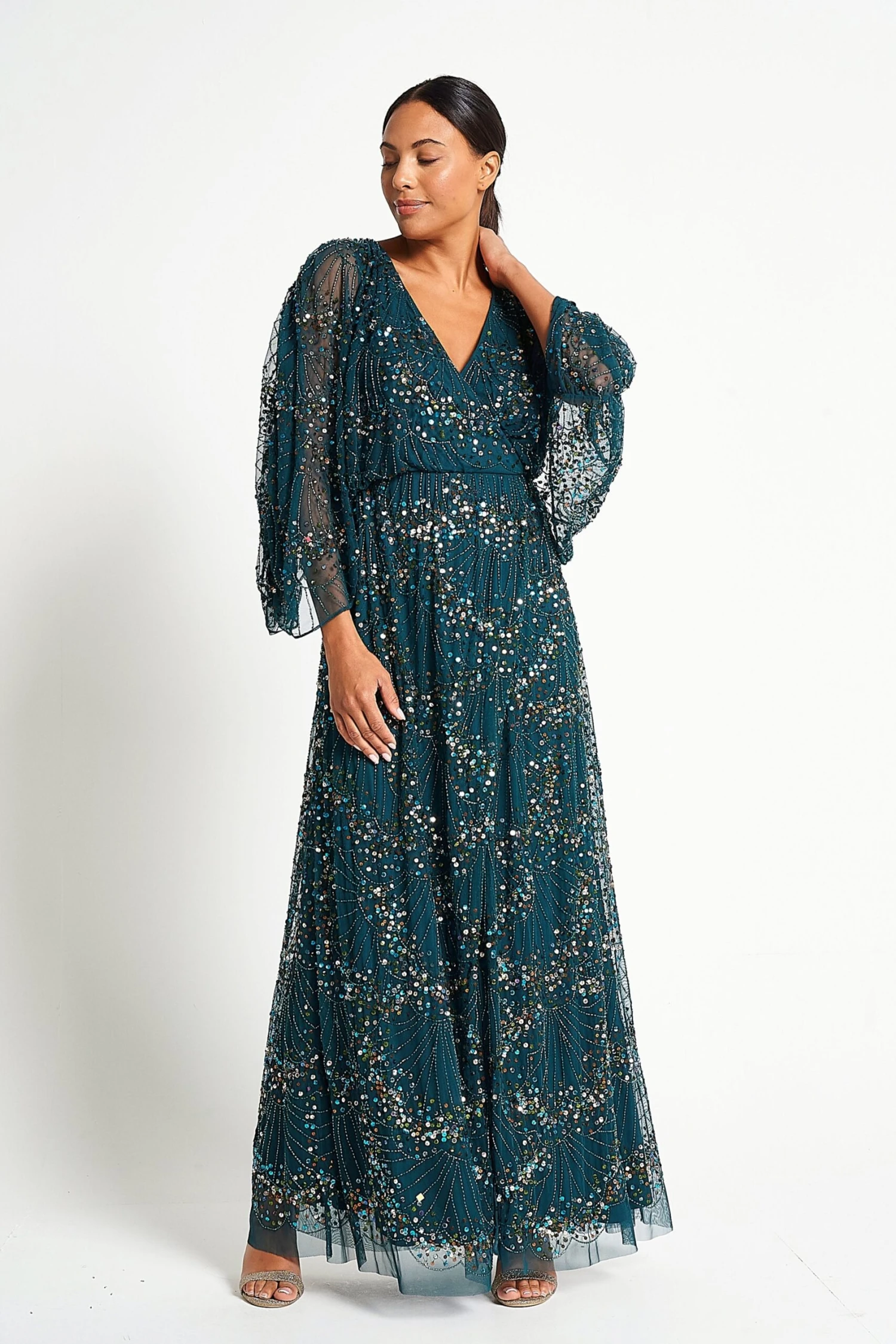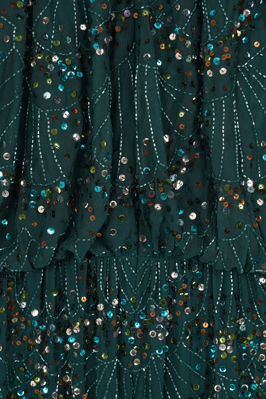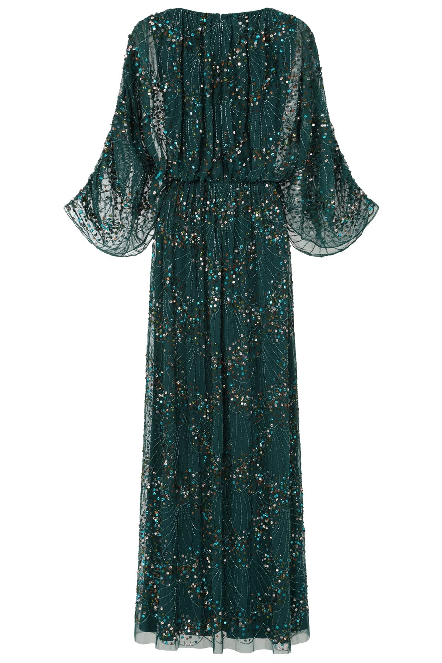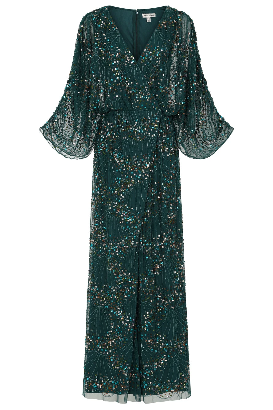 Embody effortless elegance with Sylvia. Realised in a deep forest green, this floor skimming gown is embellished throughout with sparkling sequin detailed. Relaxed in silhouette, Sylvia features a faux wrap neckline, batwing style sleeves and a long flowing skirt.