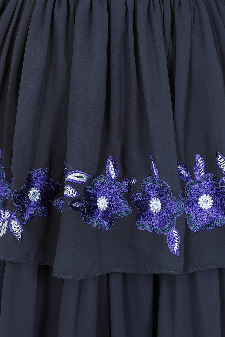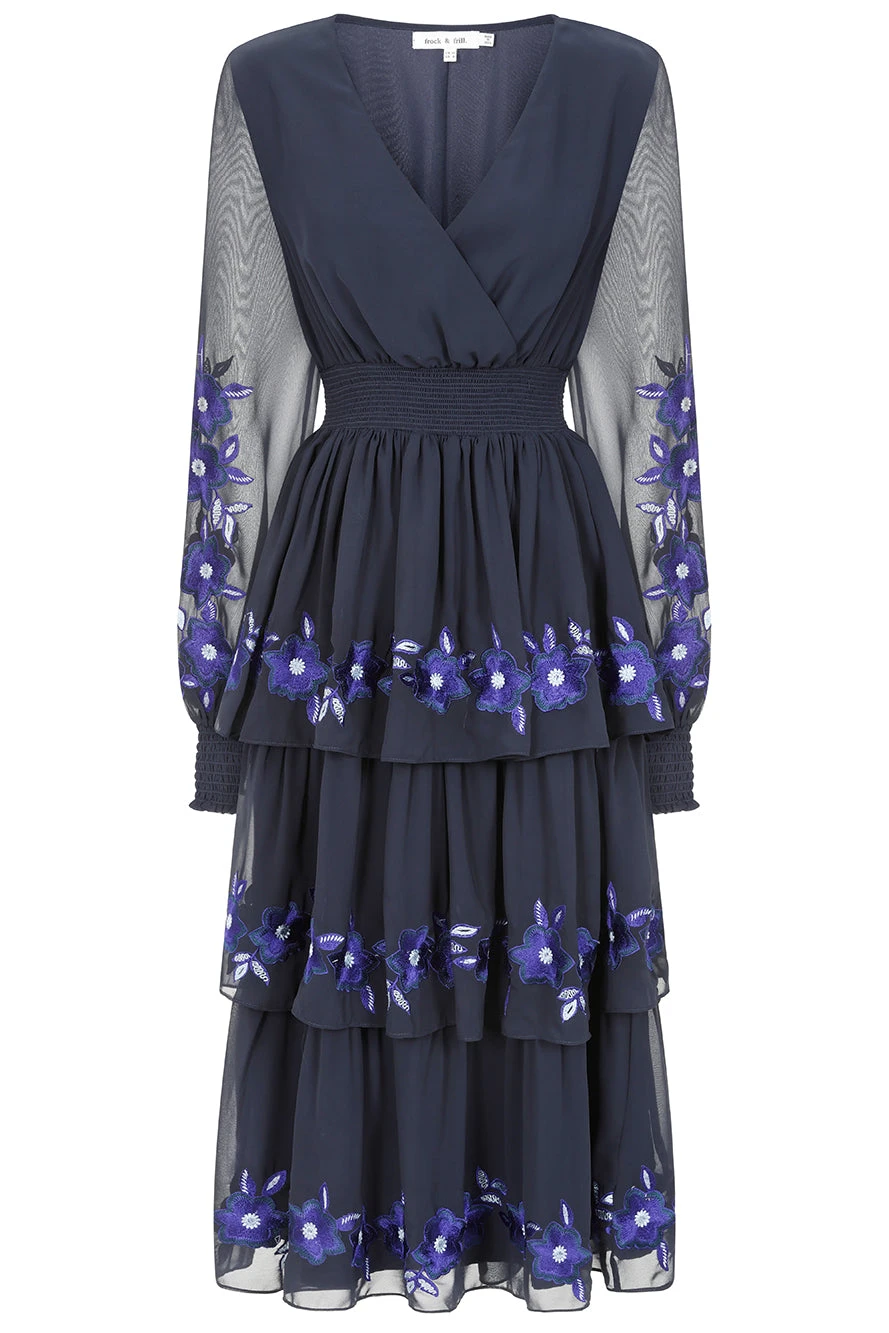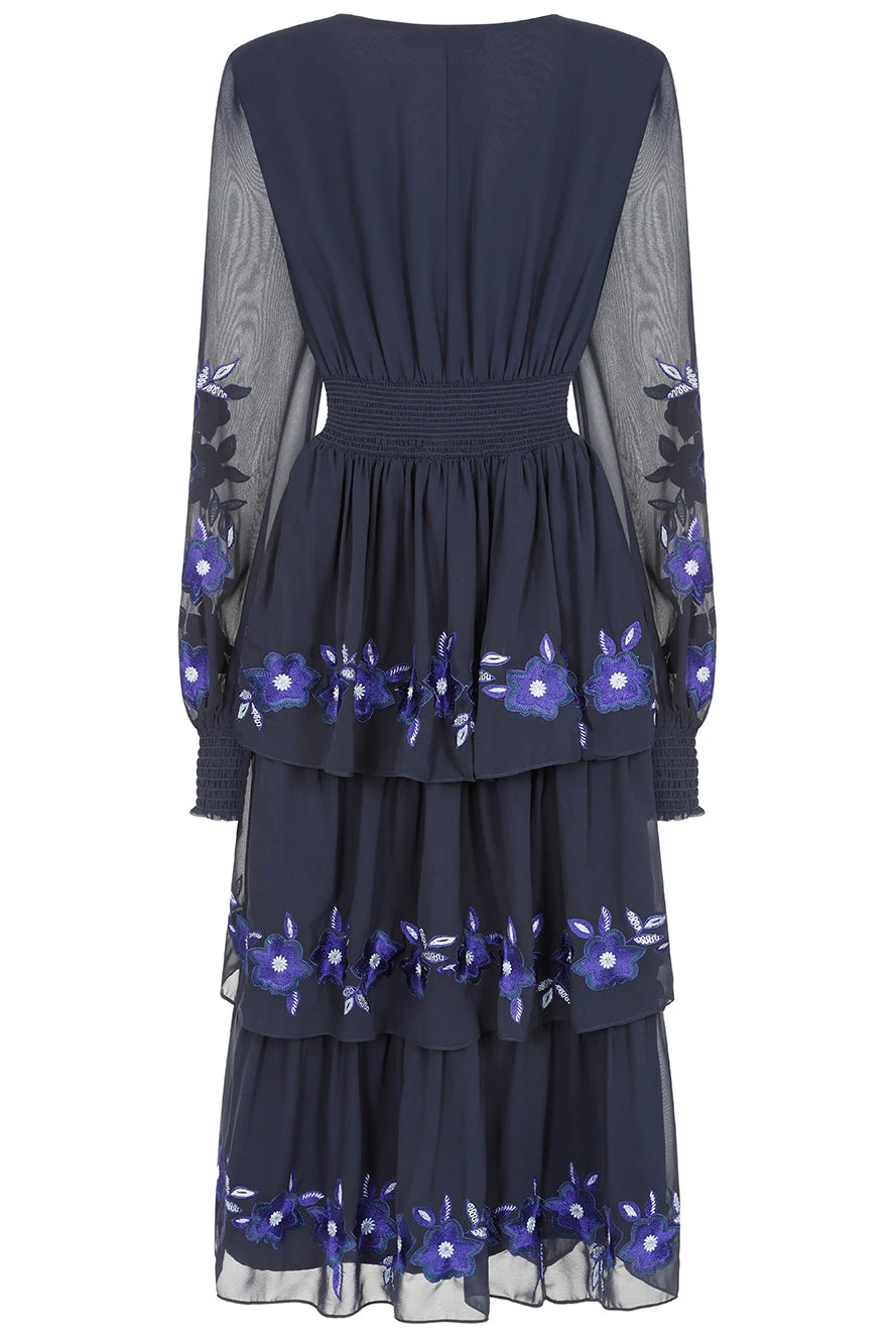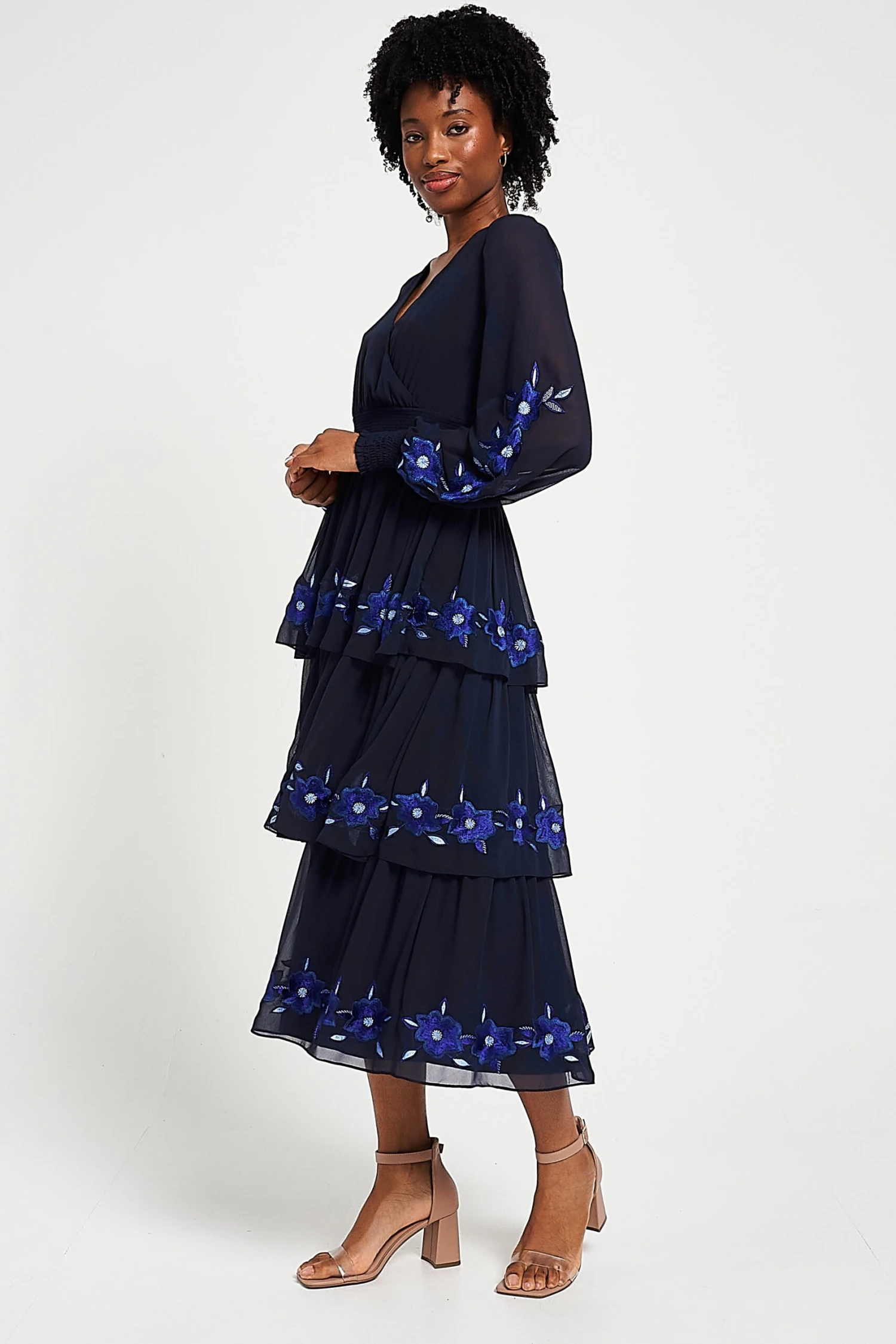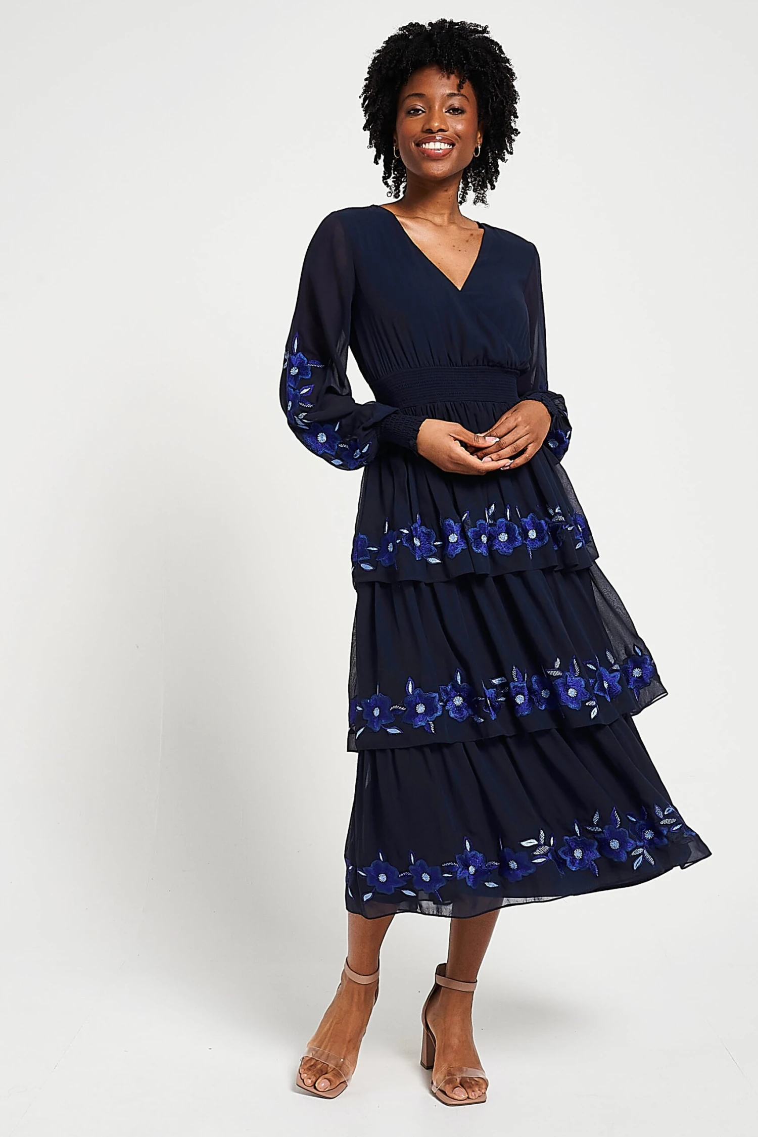 Tamsin Navy Floral Embroidered Midi Dress With Tiered Skirt
