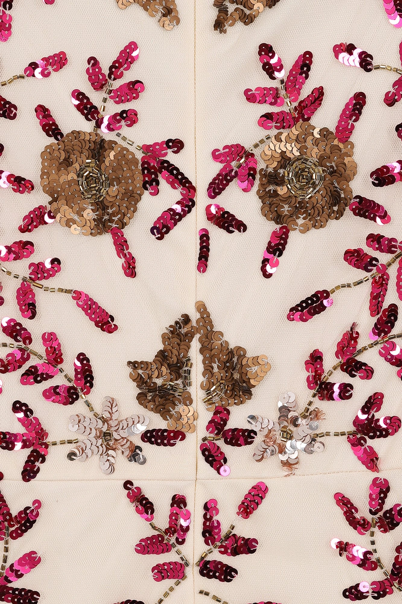 Realising Frock and Frill’s signature floral detailing in glorious pink and gold embellishment, Tori is a simply joyful dress, perfect for that extra special date in your diary! This full length cream gown is overlaid with mesh and hand embellished with thousands of sparkling sequins. Tori is complete with elbow length tiered sleeves and a concealed zip at back.