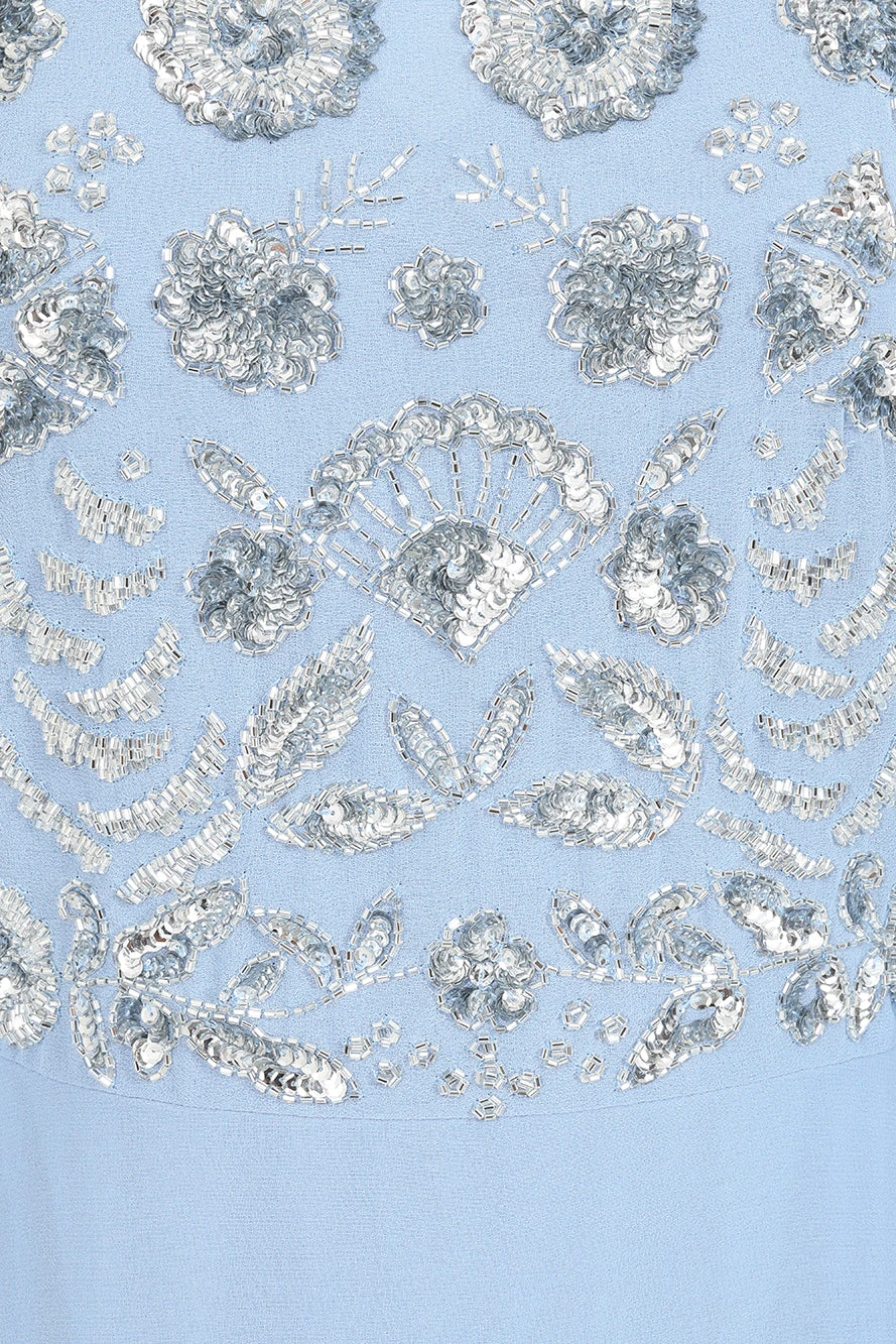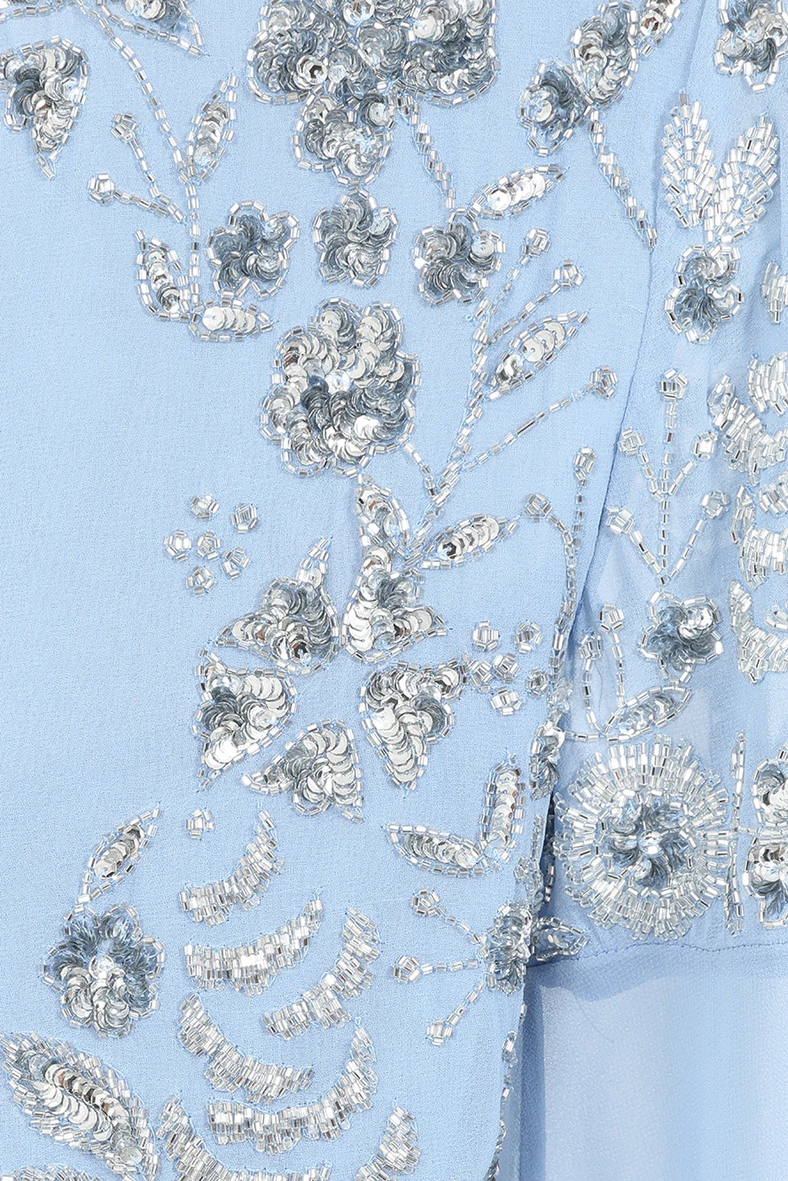 Step gracefully into special occasion season with Vera. Serene sky blue in hue, this full length gown showcases sheer cape sleeves and shimmering silver embellishment, realised in a floral motif.