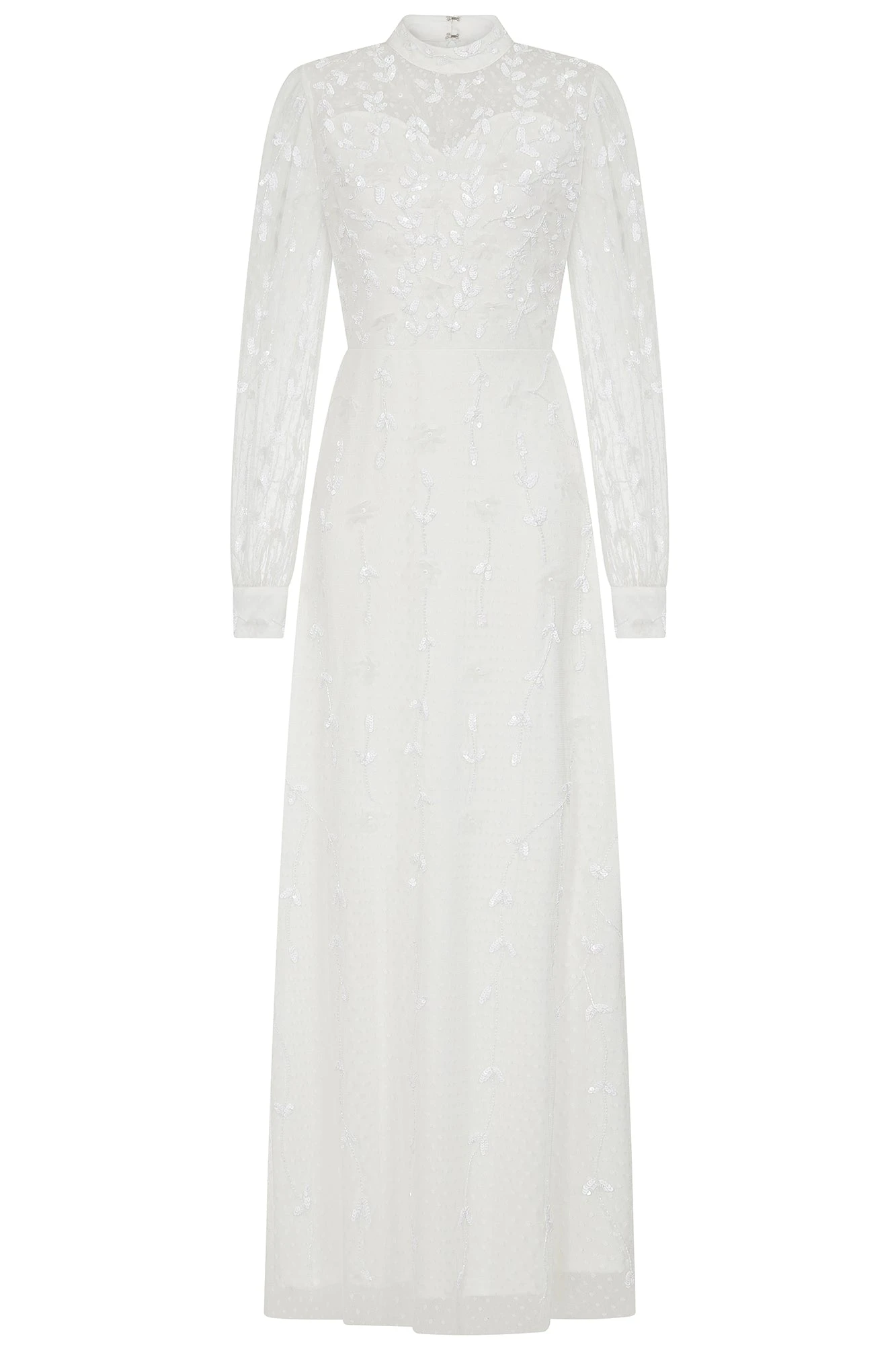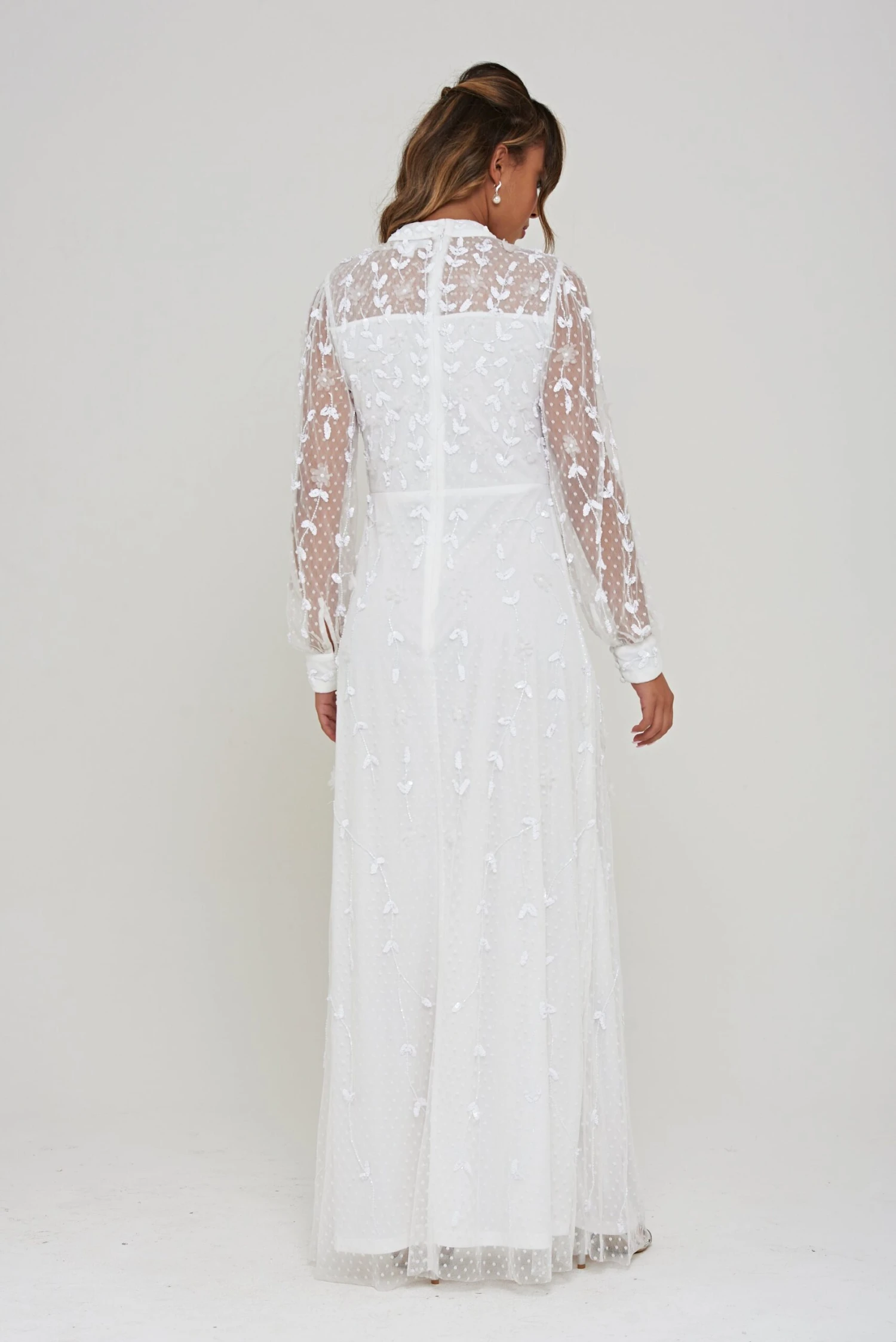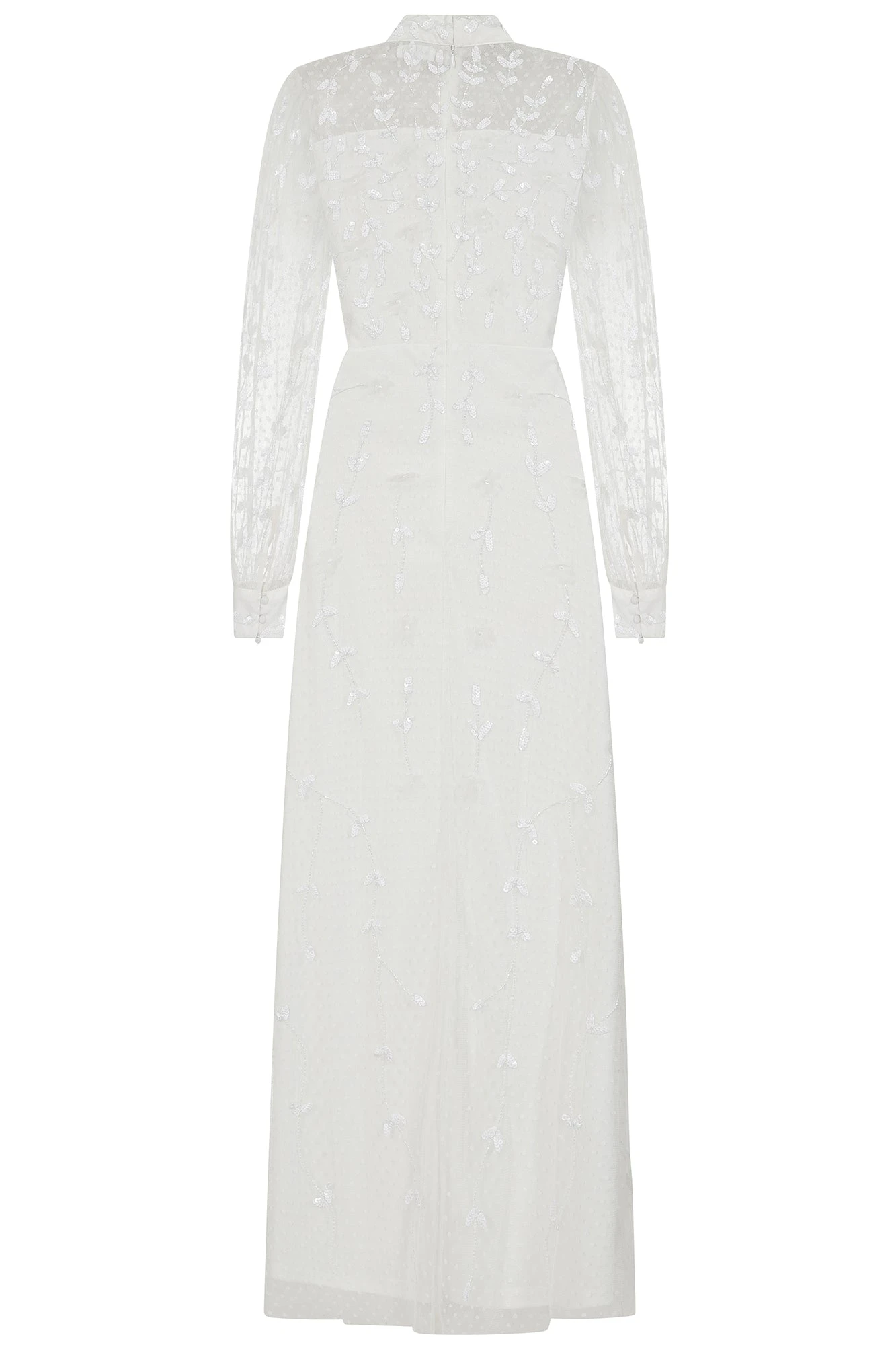 Exquisitely detailed throughout, the striking Willow is overlaid with polka dot mesh and adorned with ornate white beadwork. Pair this long-sleeved maxi with a minimal bouquet for winter nuptials or swap in a statement clutch for a festive black-tie event!