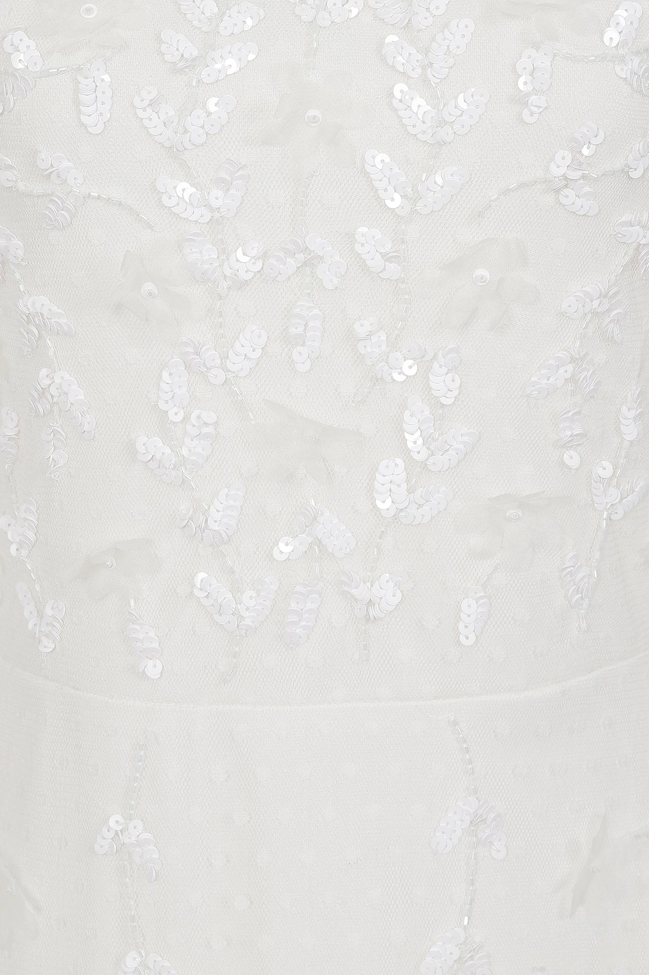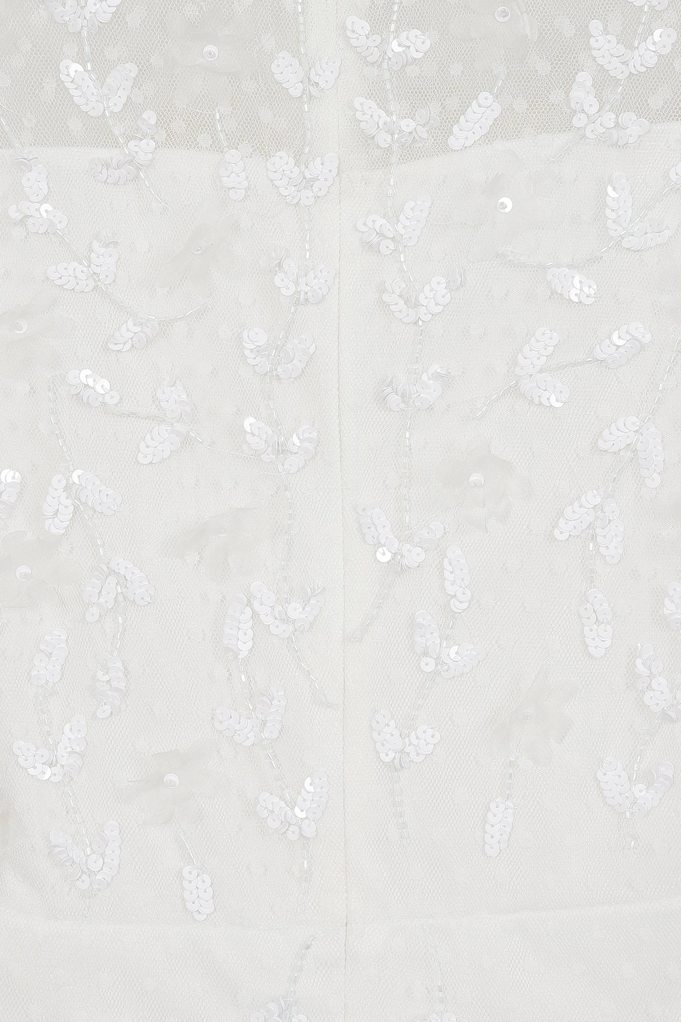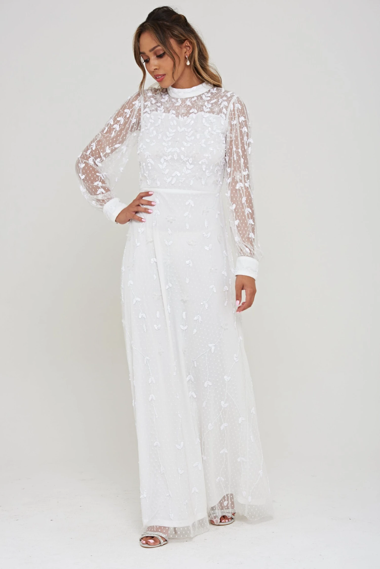 Exquisitely detailed throughout, the striking Willow is overlaid with polka dot mesh and adorned with ornate white beadwork. Pair this long-sleeved maxi with a minimal bouquet for winter nuptials or swap in a statement clutch for a festive black-tie event!