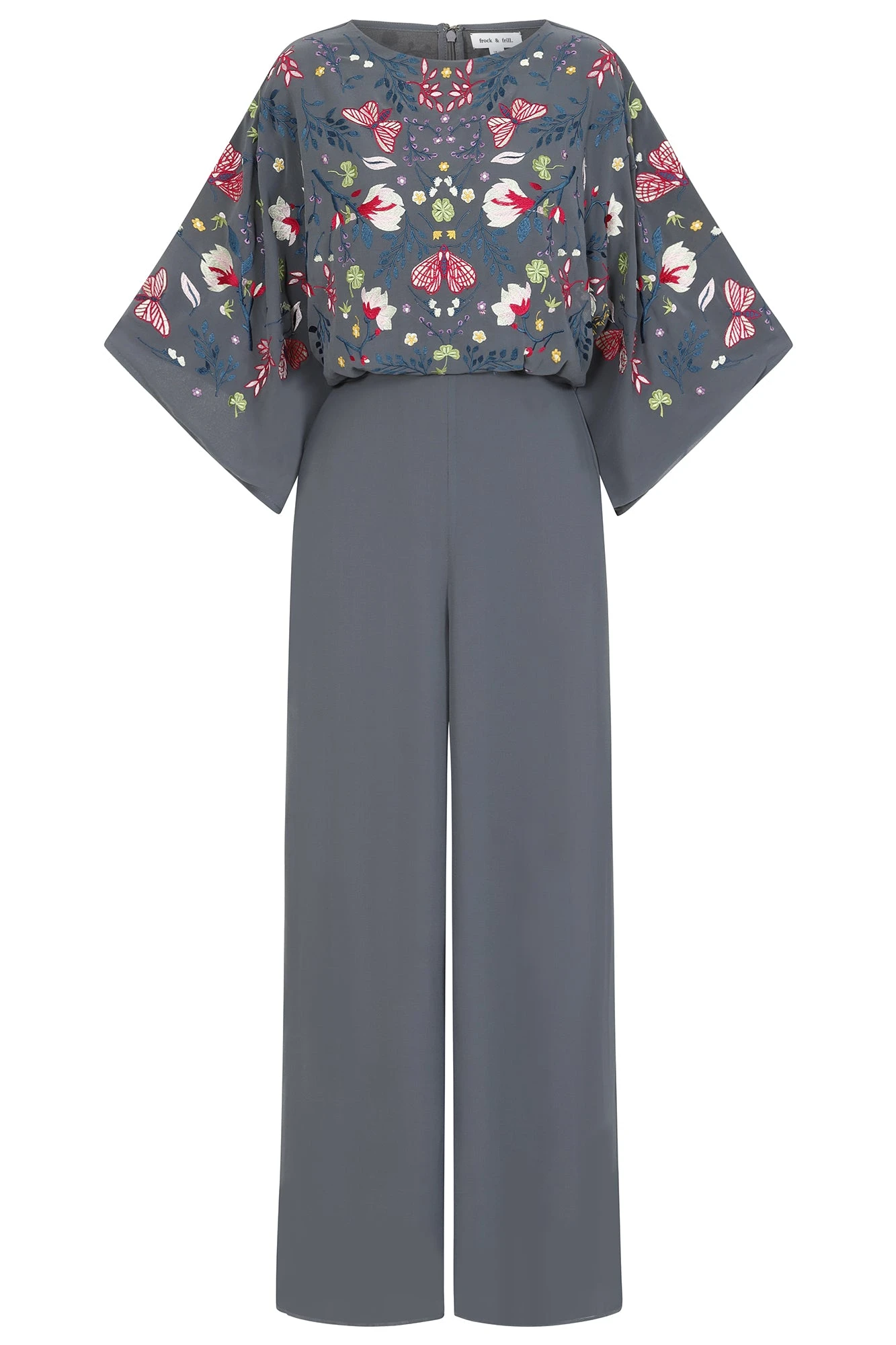 Cut in a relaxed silhouette, our Yareli jumpsuit is designed with oversized batwing sleeves and a comfortable wide leg. This minimal style is contrasted with brightly coloured flowers and butterflies that pop against the charcoal grey backdrop. Complete the look by partnering Yareli with colourful shoes and accessories.