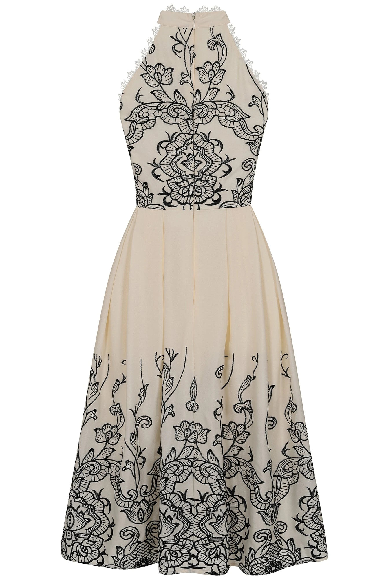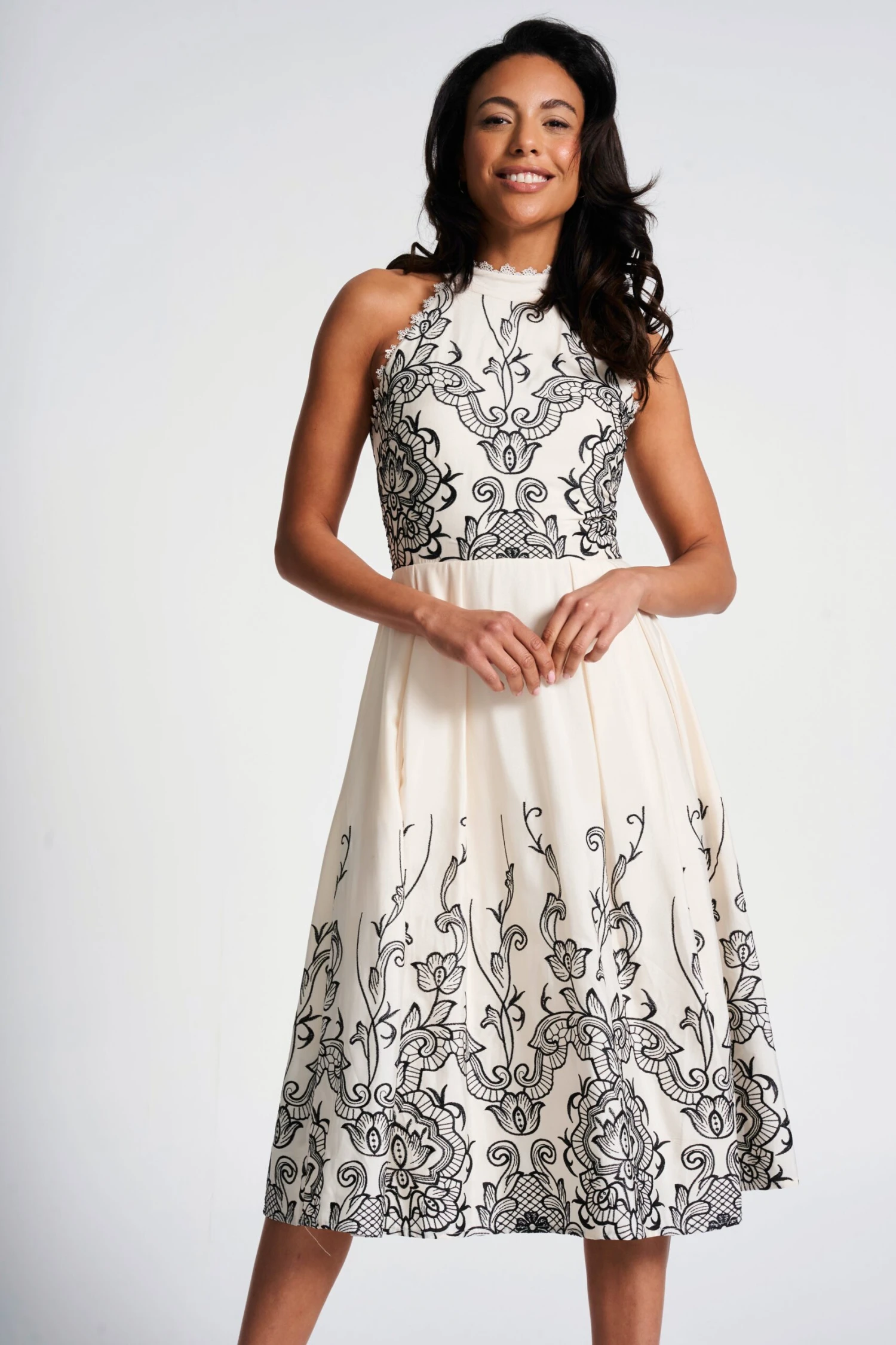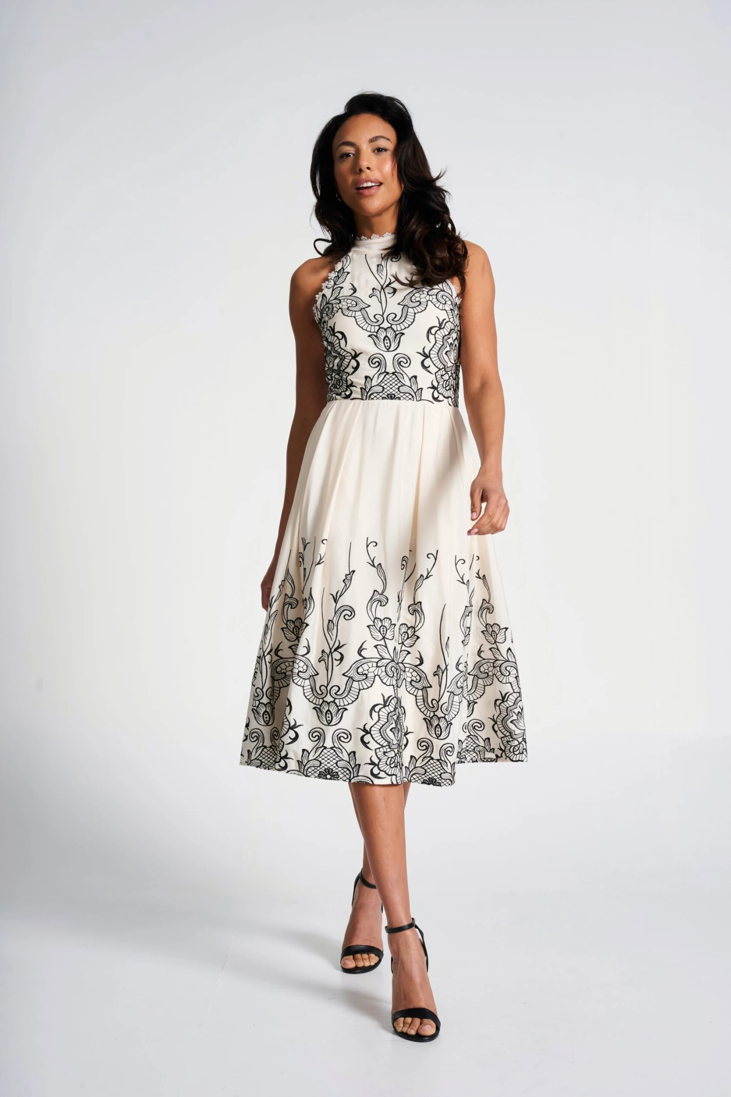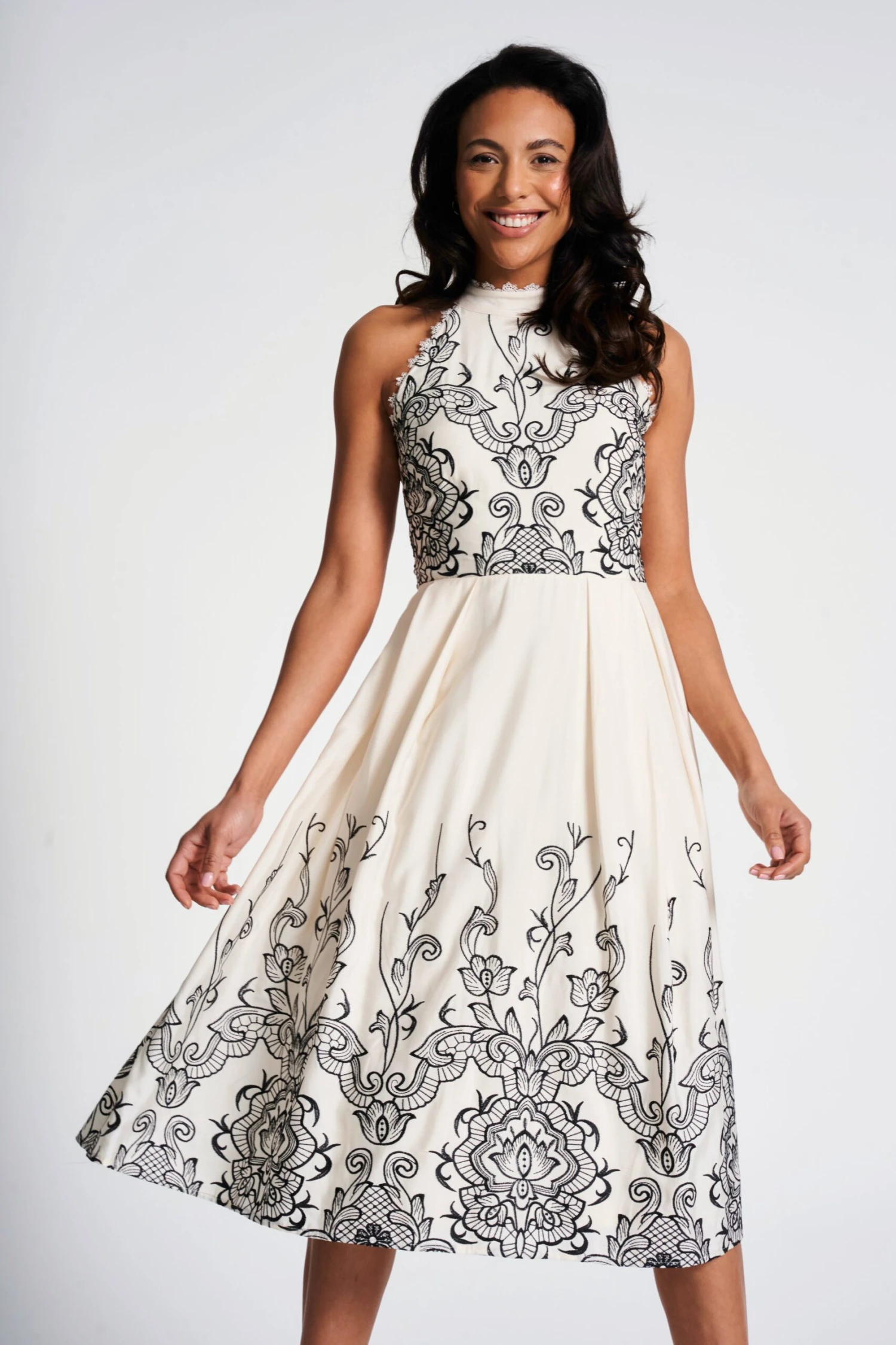 Step into spring with Zalie! Cut in a classic fit and flare silhouette, complete with a halter style neckline, this darling off-white midi dress is embroidered with contrasting black embroidery, realised in a lace motif.