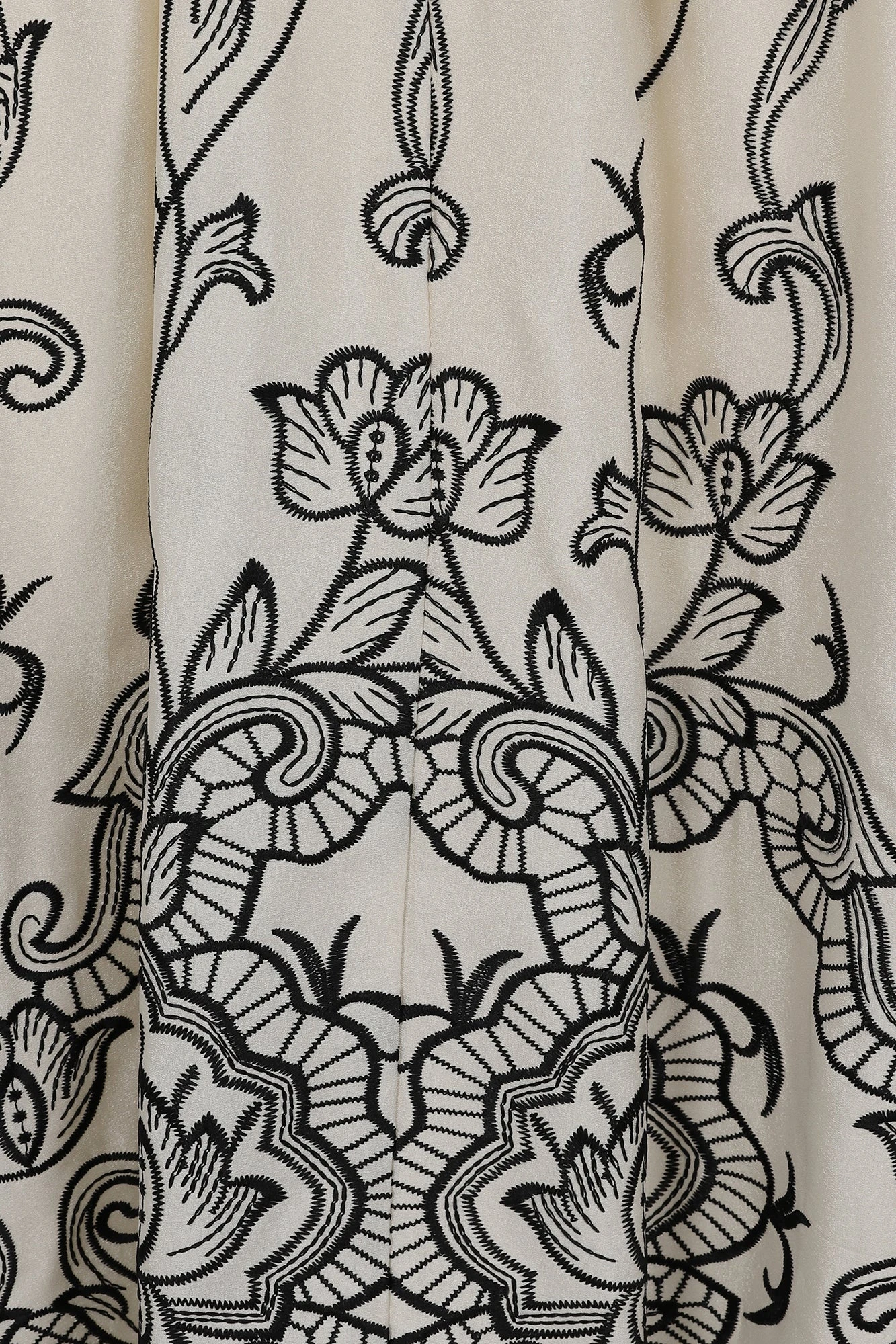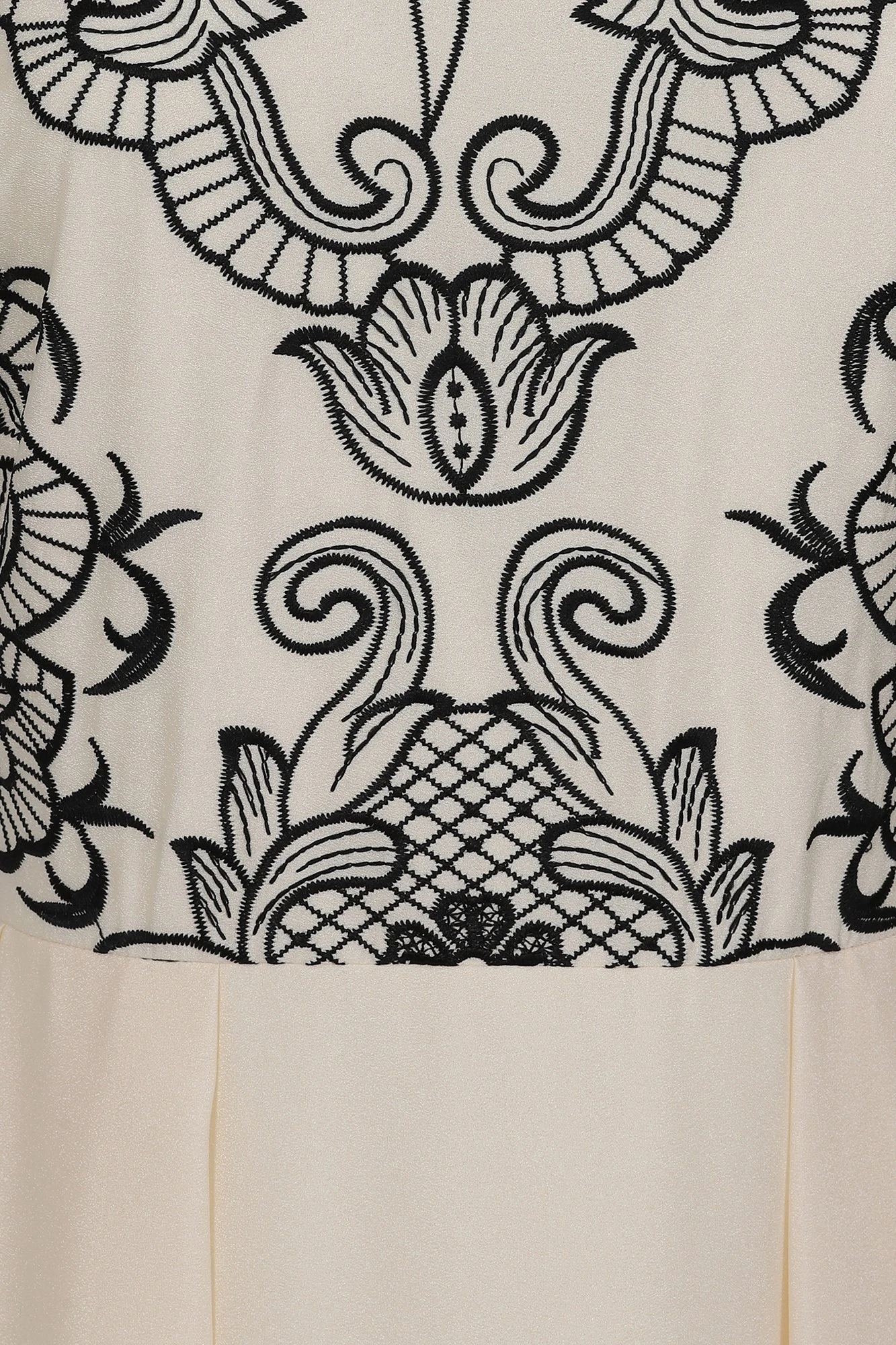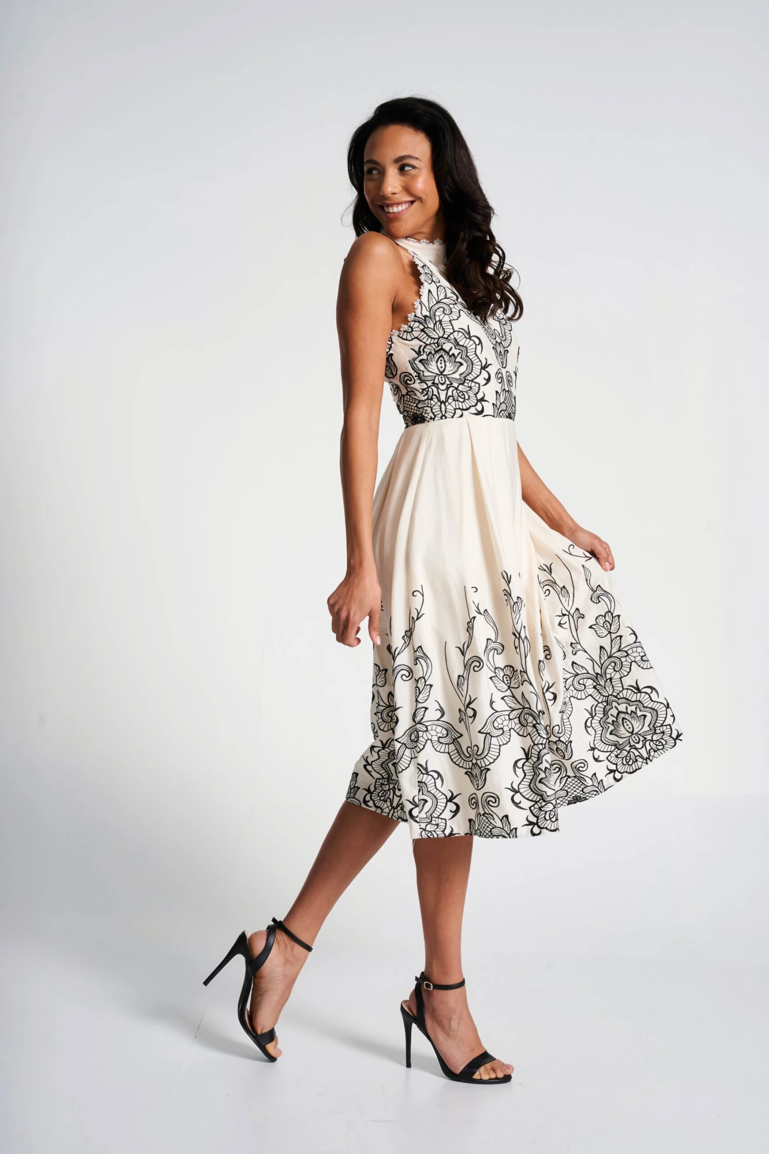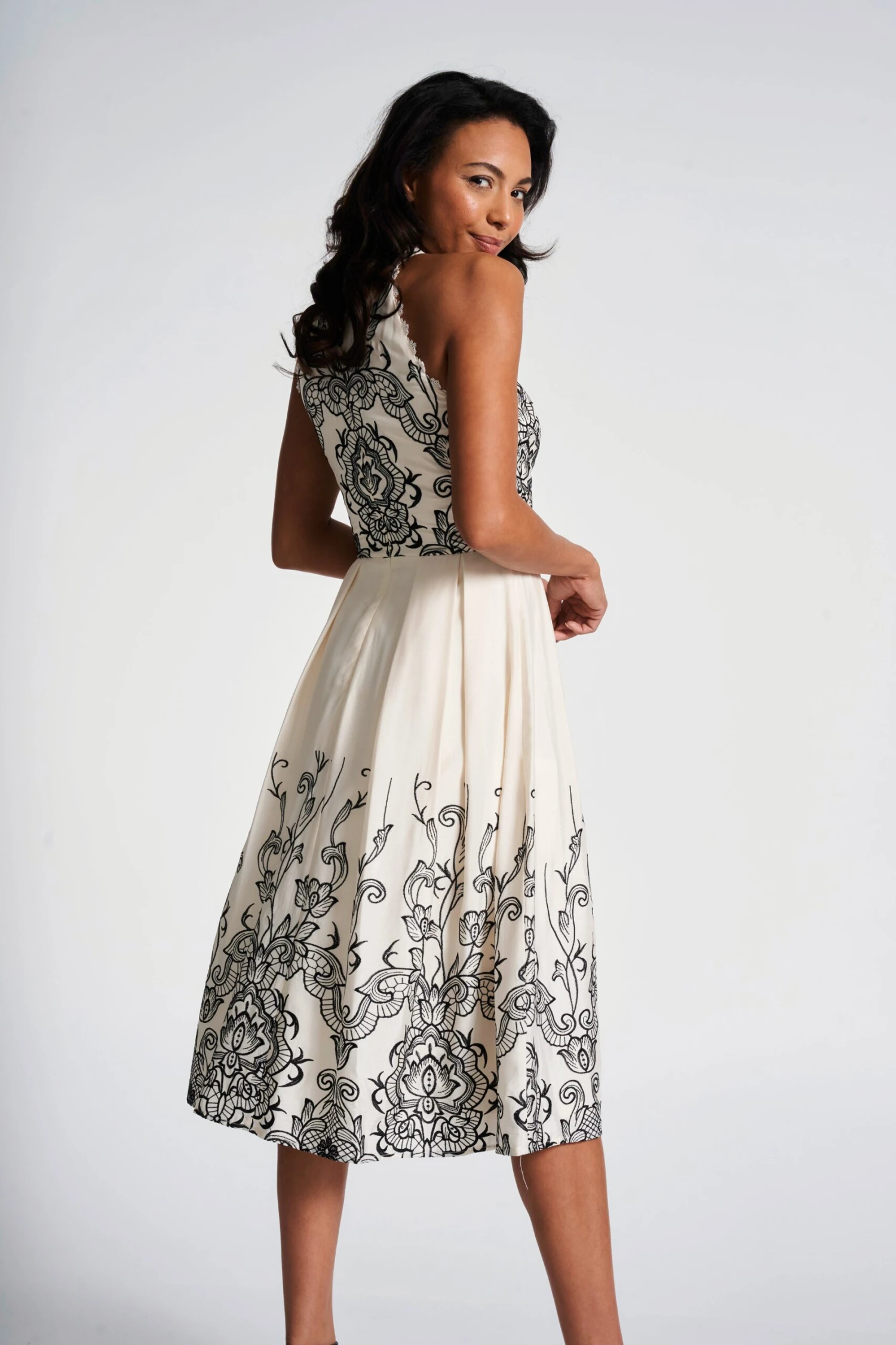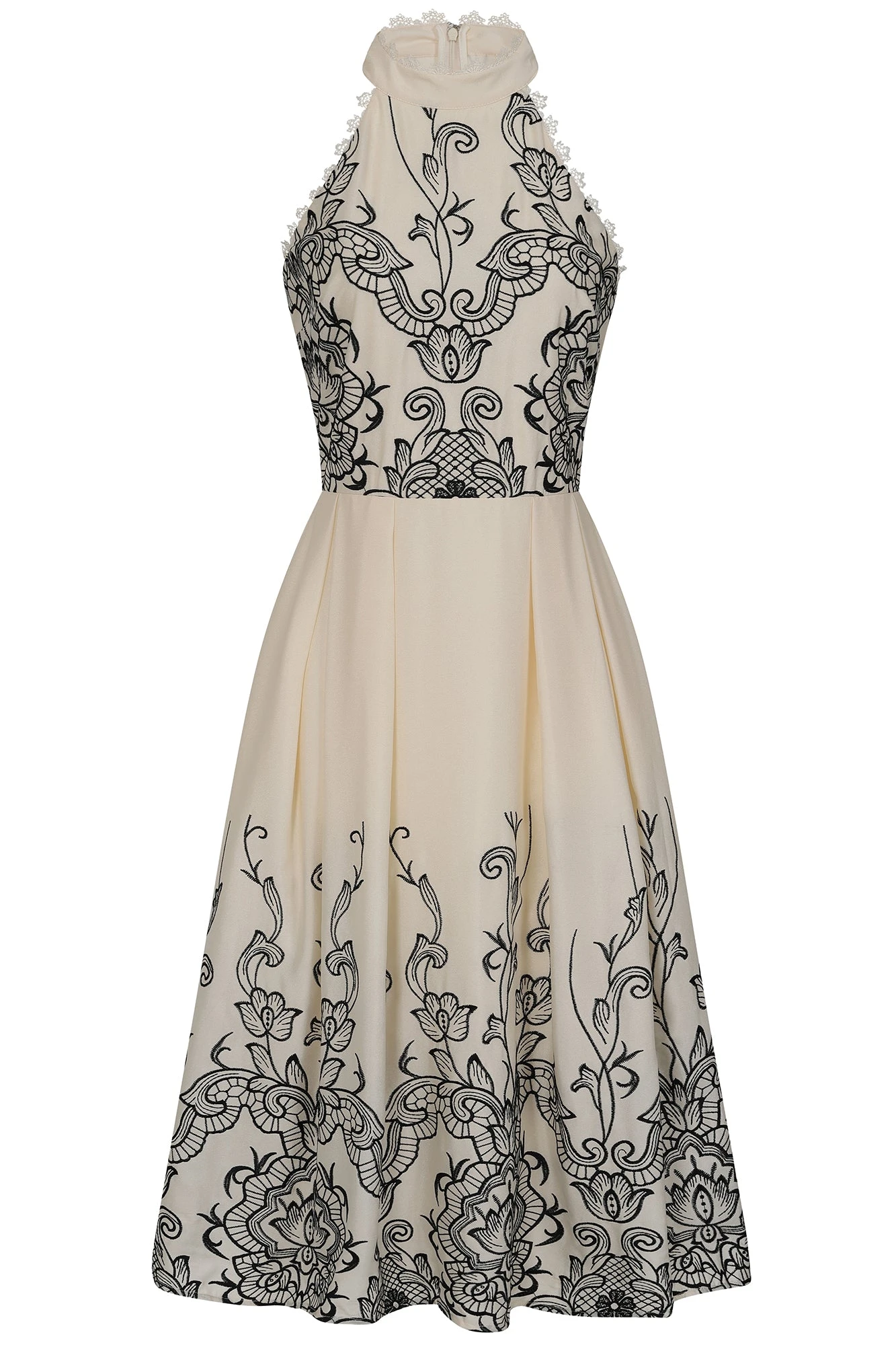 Step into spring with Zalie! Cut in a classic fit and flare silhouette, complete with a halter style neckline, this darling off-white midi dress is embroidered with contrasting black embroidery, realised in a lace motif.