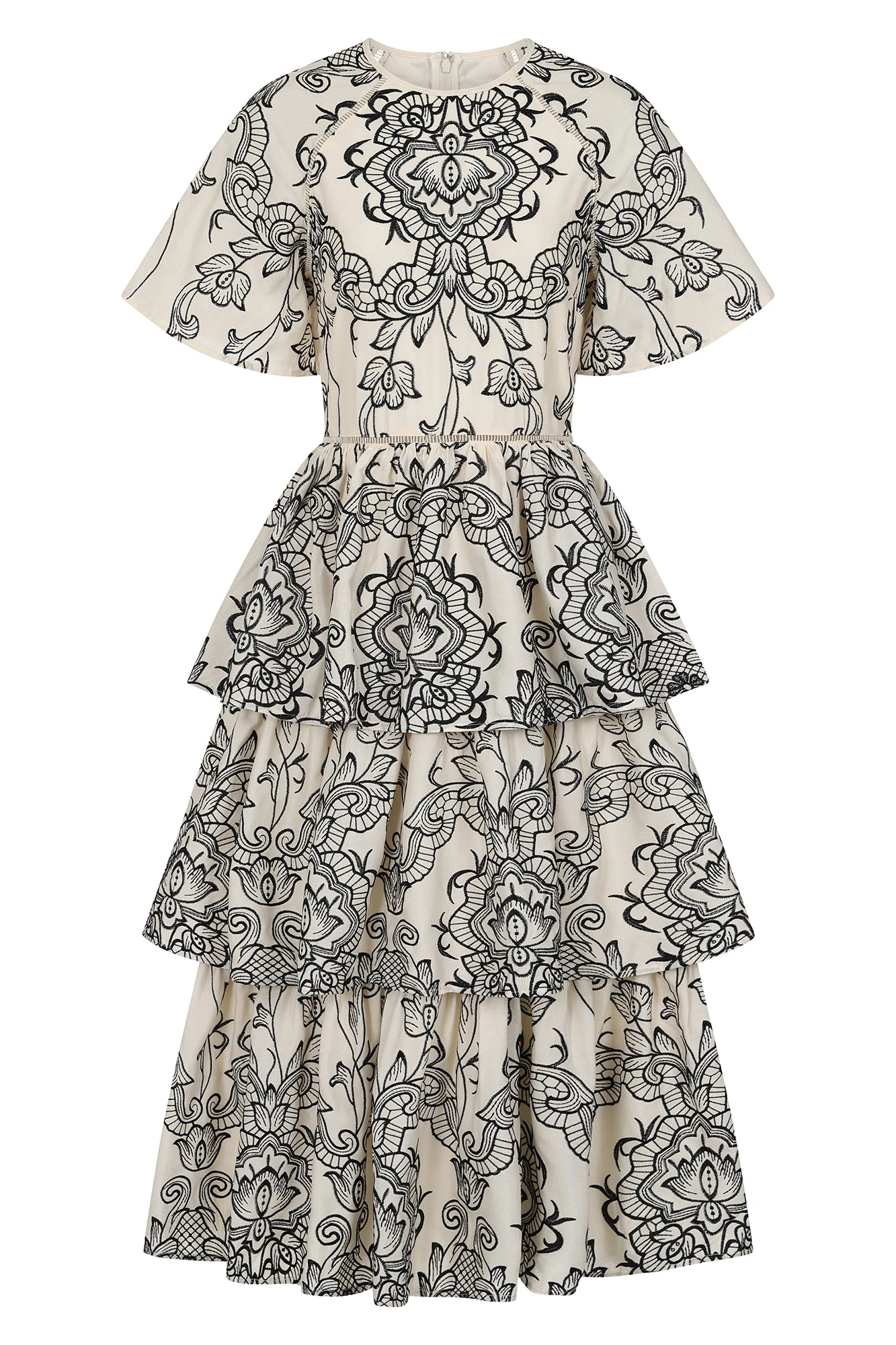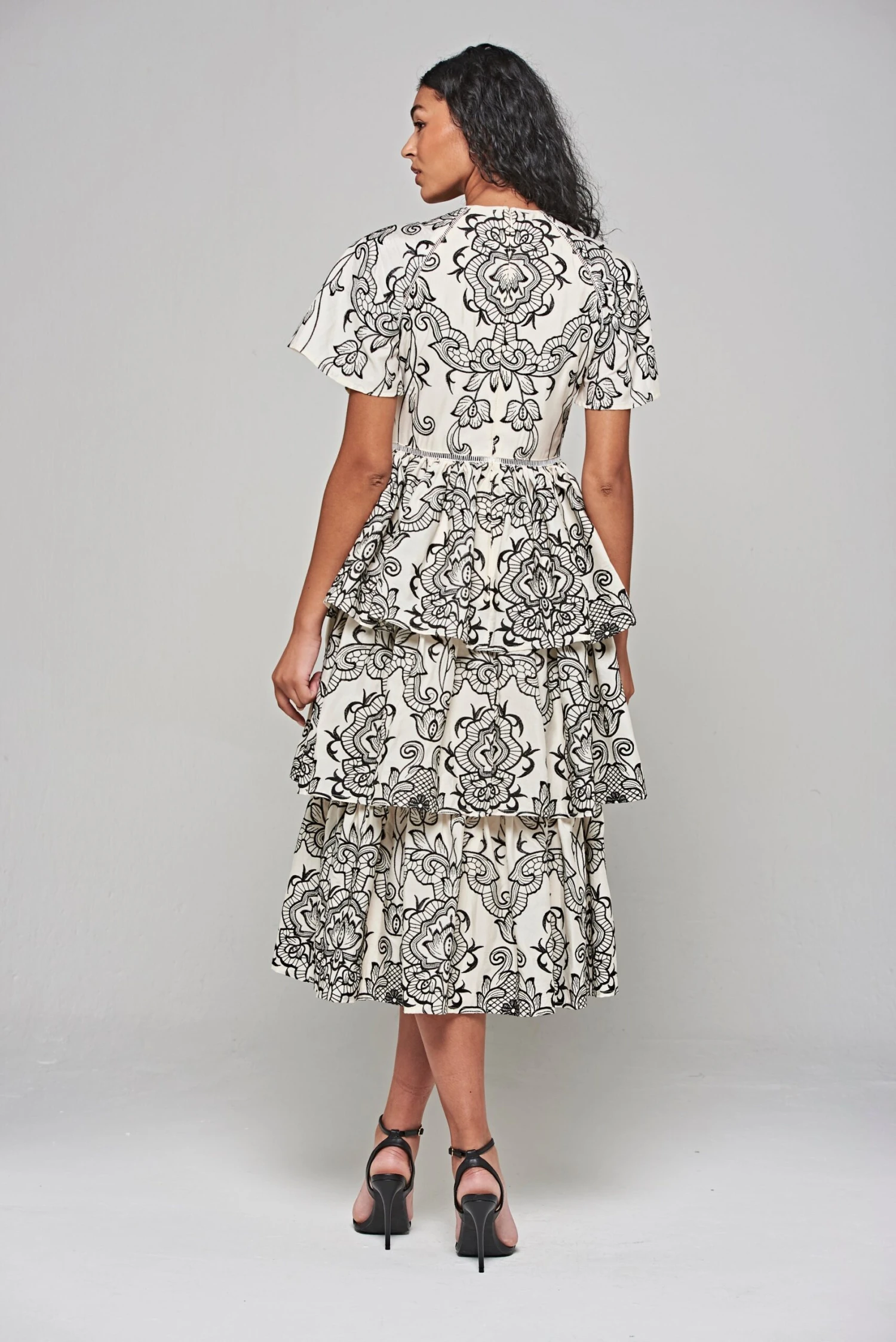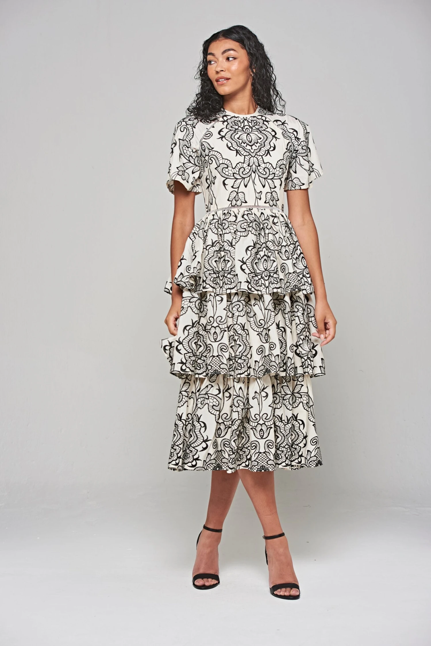 A style certain to be put on repeat this spring, Zariah is embroidered throughout with a striking lace inspired motif. Realised in an off white hue that contrasts perfectly with the black embroidery, this mid length dress is complete with a dramatically tiered skirt and t-shirt style sleeves.
