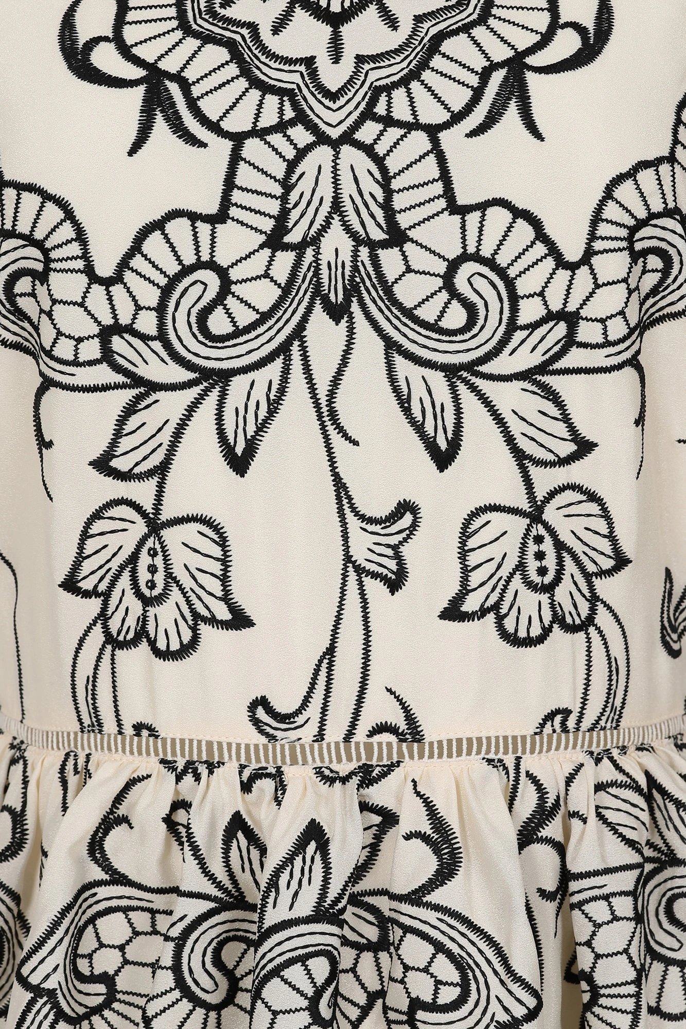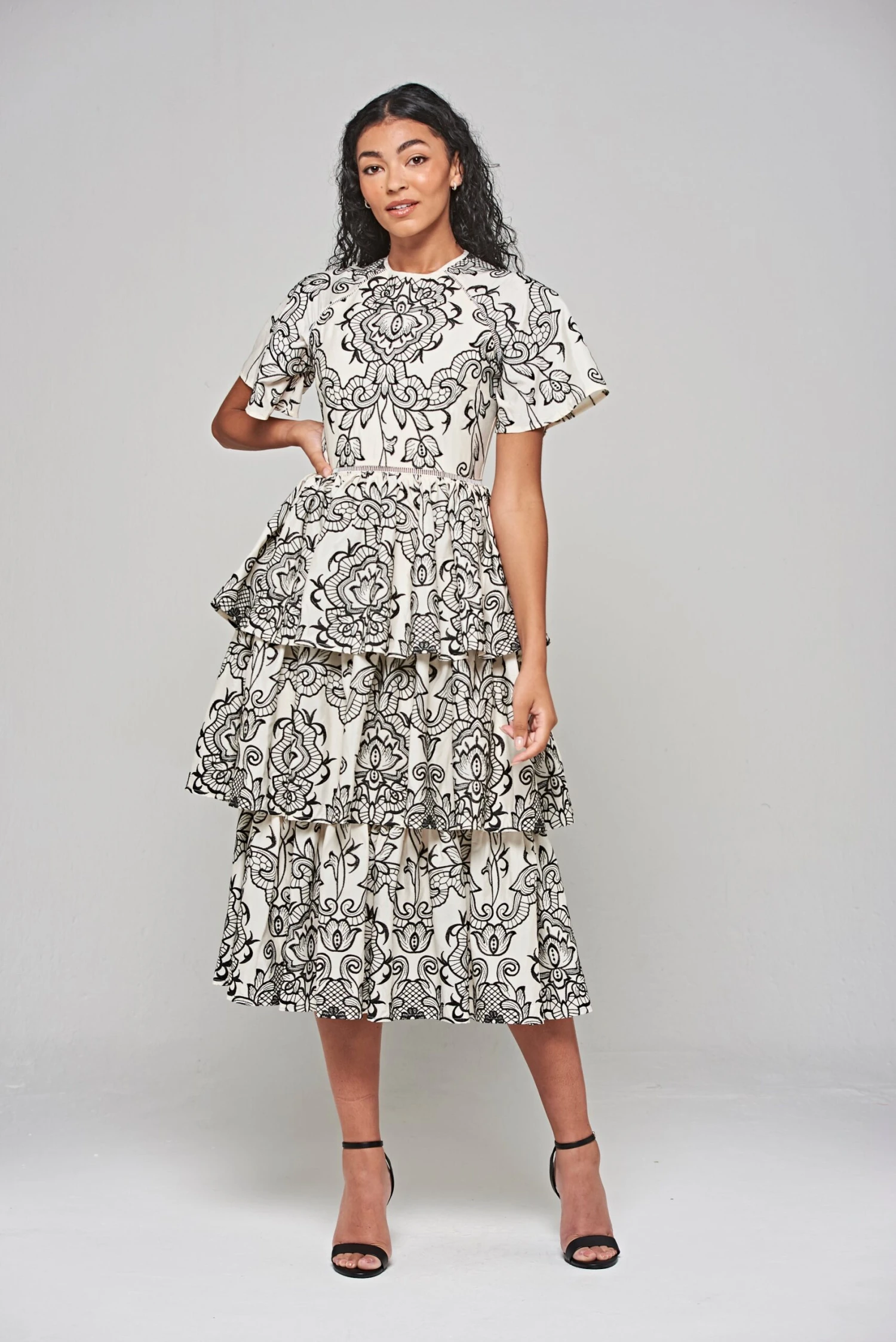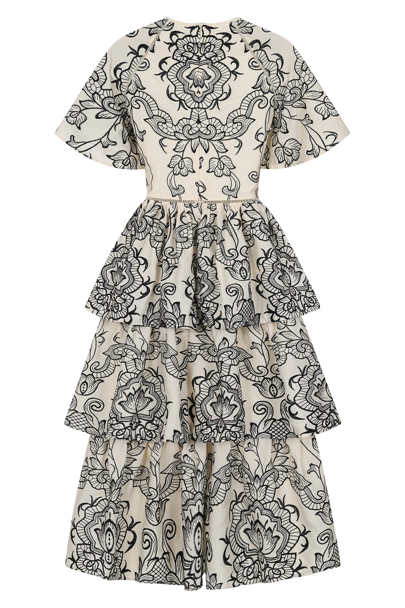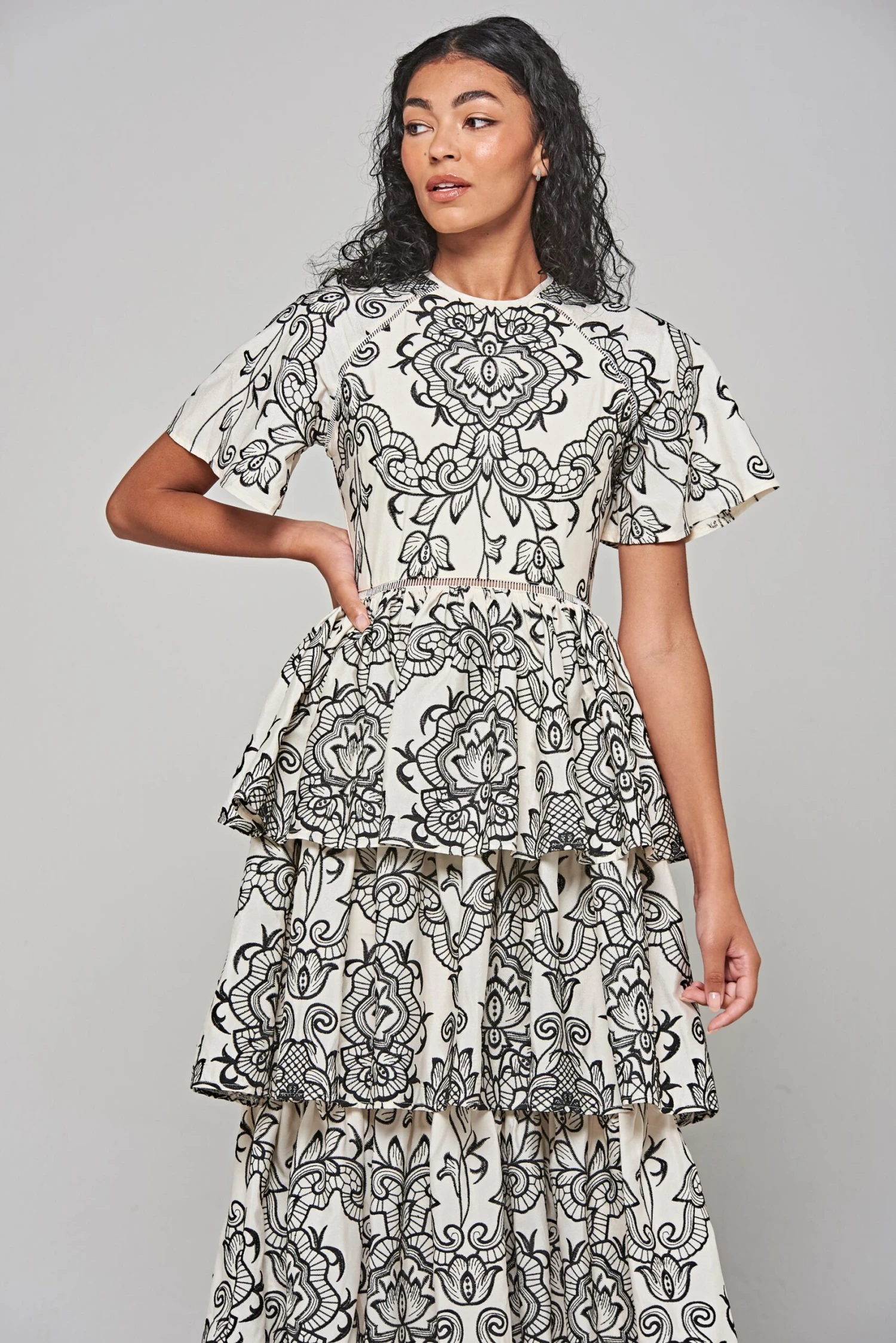 A style certain to be put on repeat this spring, Zariah is embroidered throughout with a striking lace inspired motif. Realised in an off white hue that contrasts perfectly with the black embroidery, this mid length dress is complete with a dramatically tiered skirt and t-shirt style sleeves.